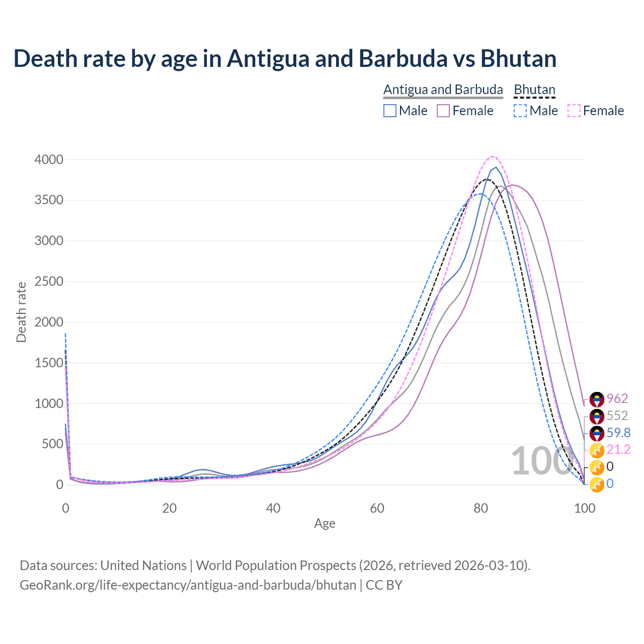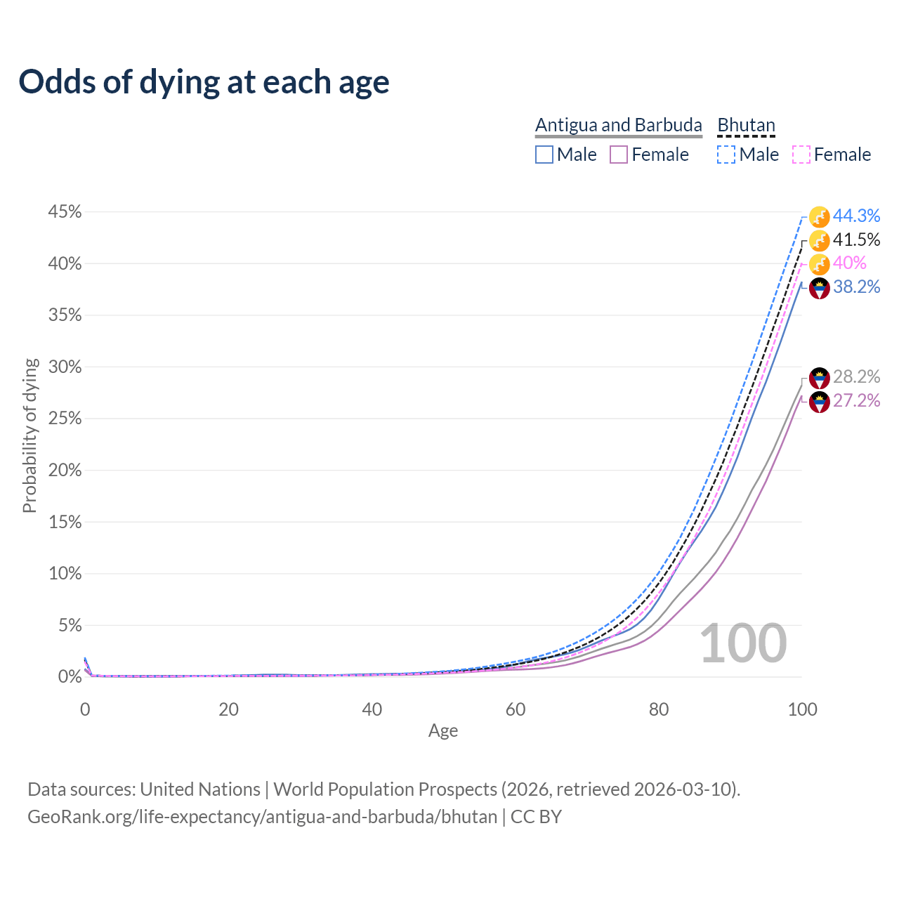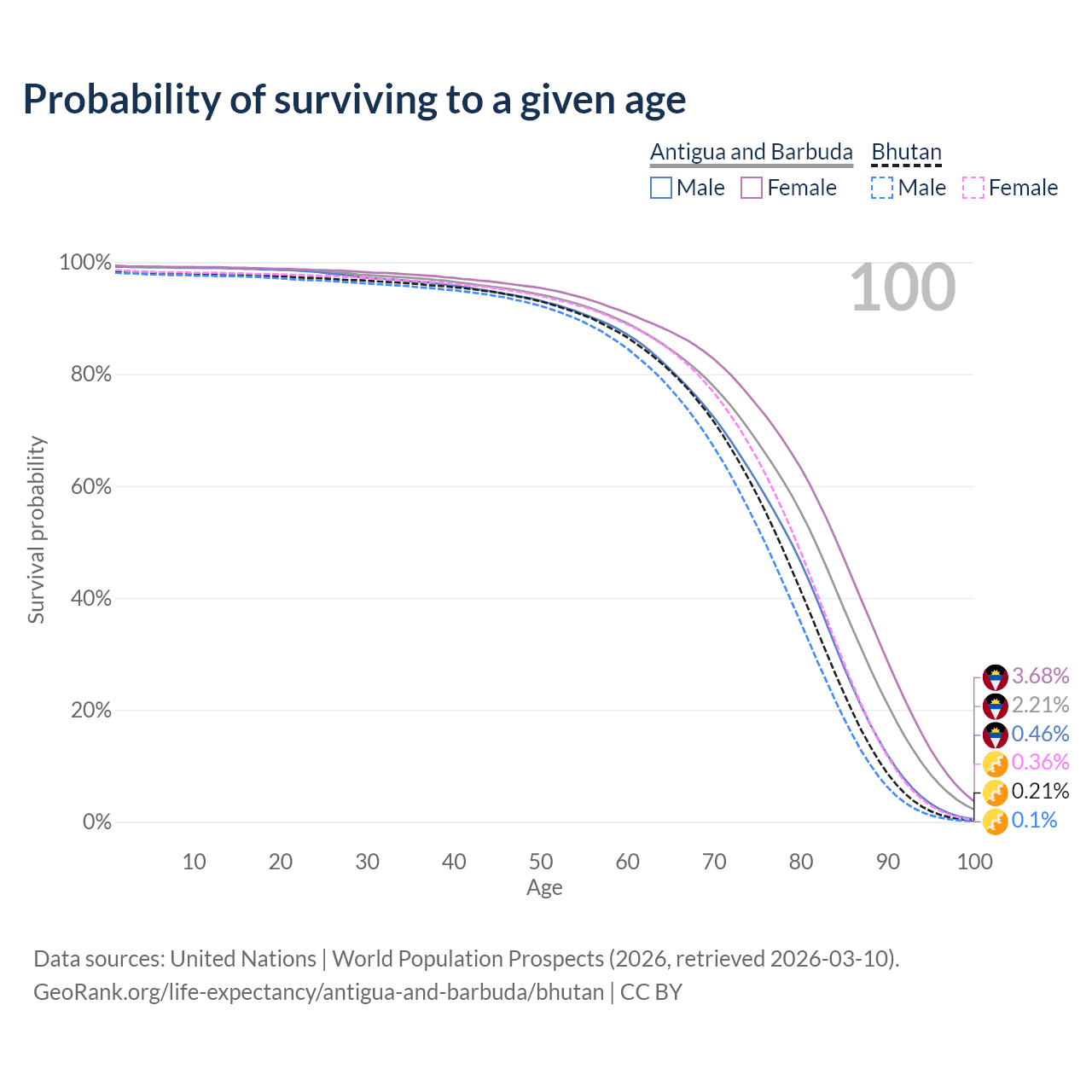 This life expectancy calculator shows the odds of living to 100, 95, 90, and below based on current age for both males and females in Antigua and Barbuda and Bhutan, along with mean and median age of death. The calculations are based on the 2026 life tables (actuarial tables) from the UN World Population Prospects.