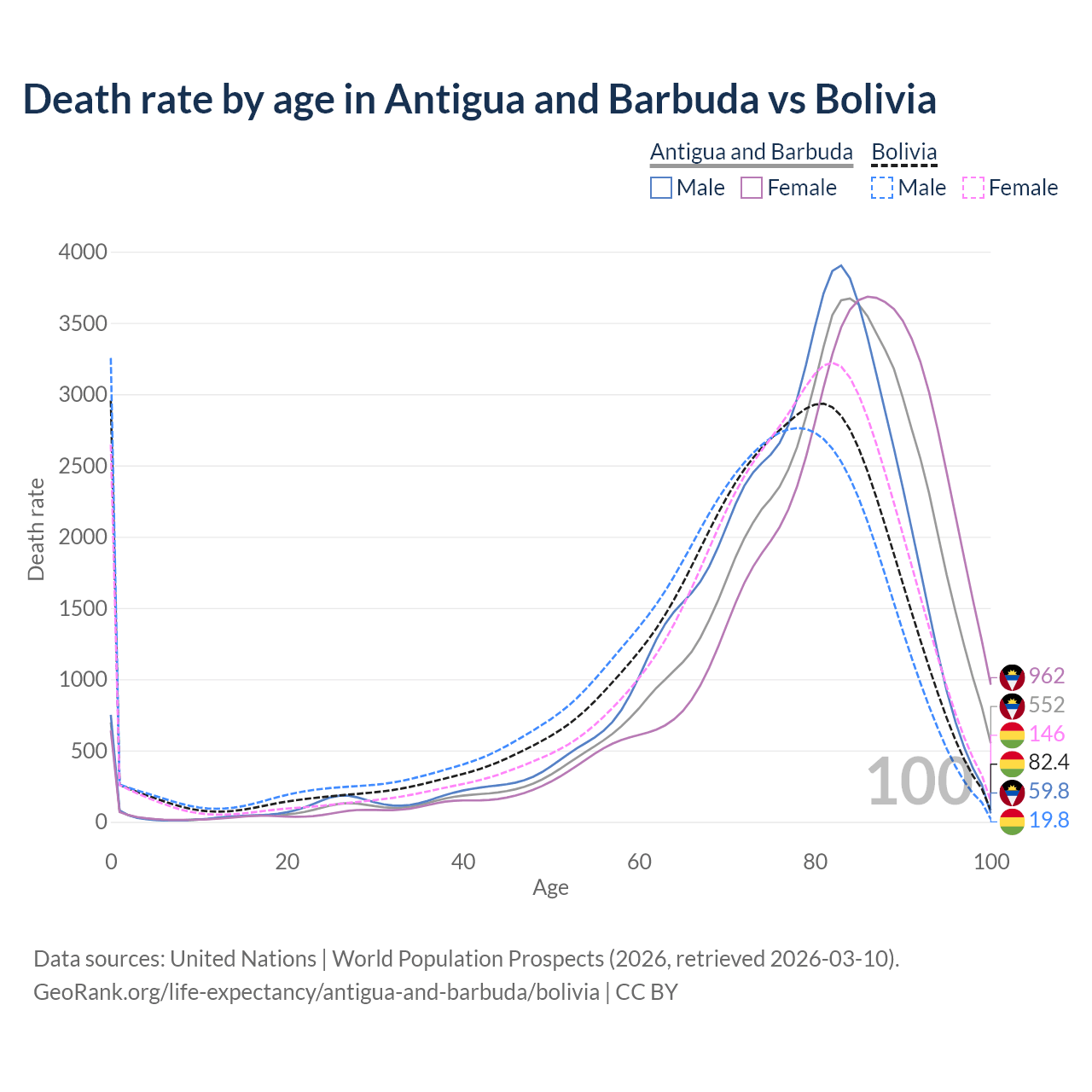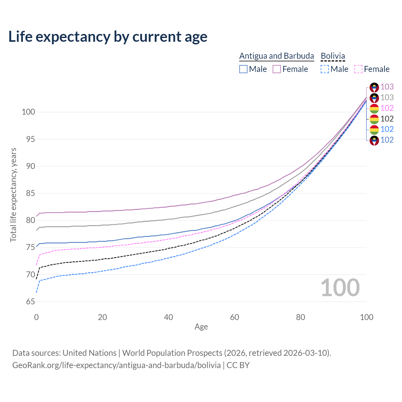 This life expectancy calculator shows the odds of living to 100, 95, 90, and below based on current age for both males and females in Antigua and Barbuda and Bolivia, along with mean and median age of death. The calculations are based on the 2026 life tables (actuarial tables) from the UN World Population Prospects.