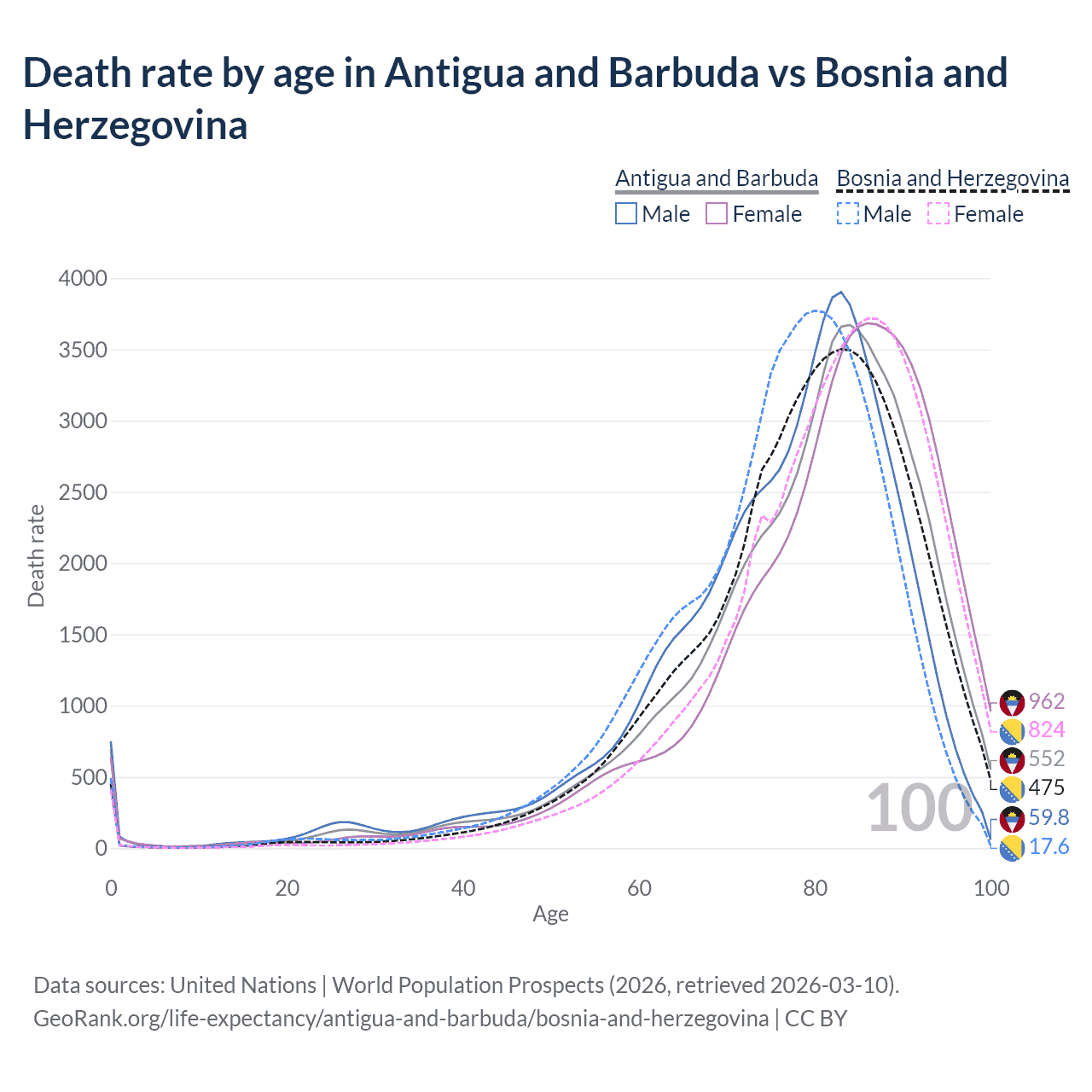 In Antigua and Barbuda, the most common age of death is 84, compared to 83 in Bosnia and Herzegovina. The median age of death is 81.7 in Antigua and Barbuda and 80.7 in Bosnia and Herzegovina, meaning only half of each cohort is expected to live past that age.
