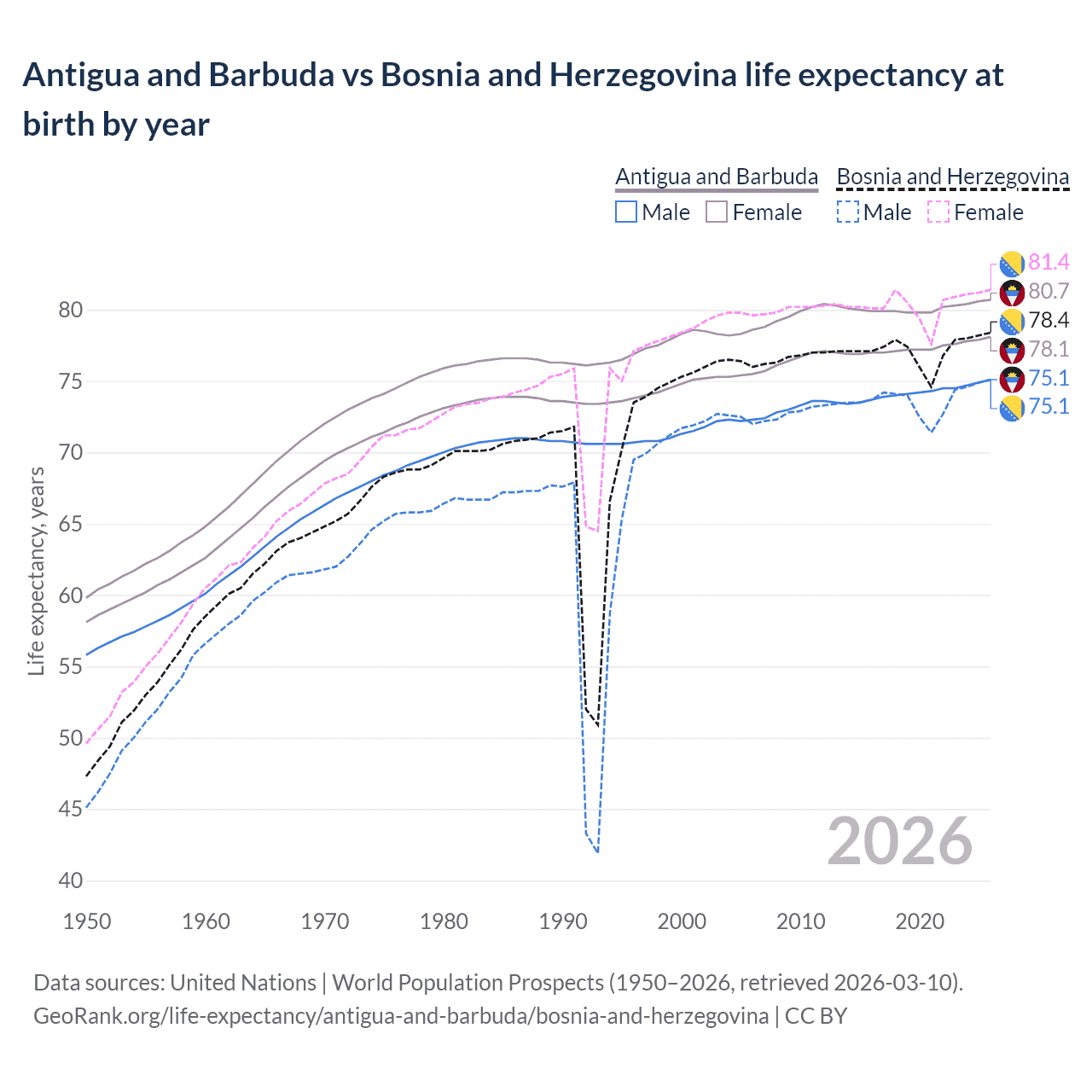 The average life expectancy at birth is 78.1 years in Antigua and Barbuda vs 78.4 in Bosnia and Herzegovina. Antigua and Barbuda is ranked 63/197 by life expectancy, and Bosnia and Herzegovina is 56/197. In Antigua and Barbuda, the life expectancy is 75.1 years for males and 80.7 years for females. In Bosnia and Herzegovina, it's 75.1 years for males and 81.4 years for females.