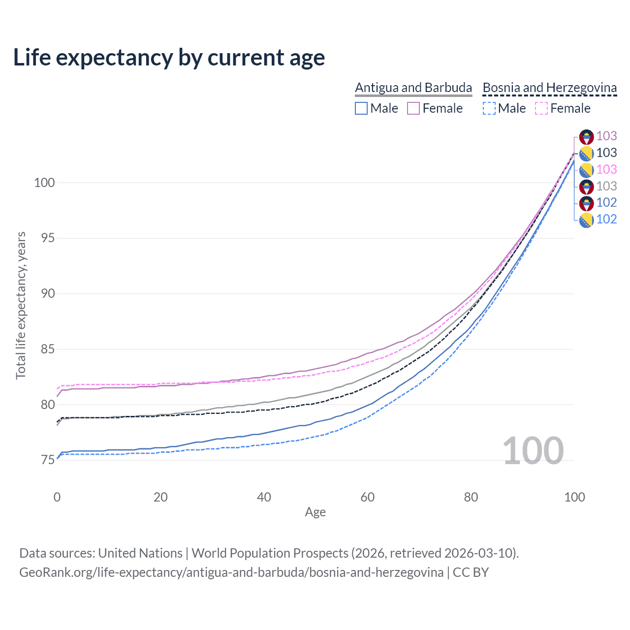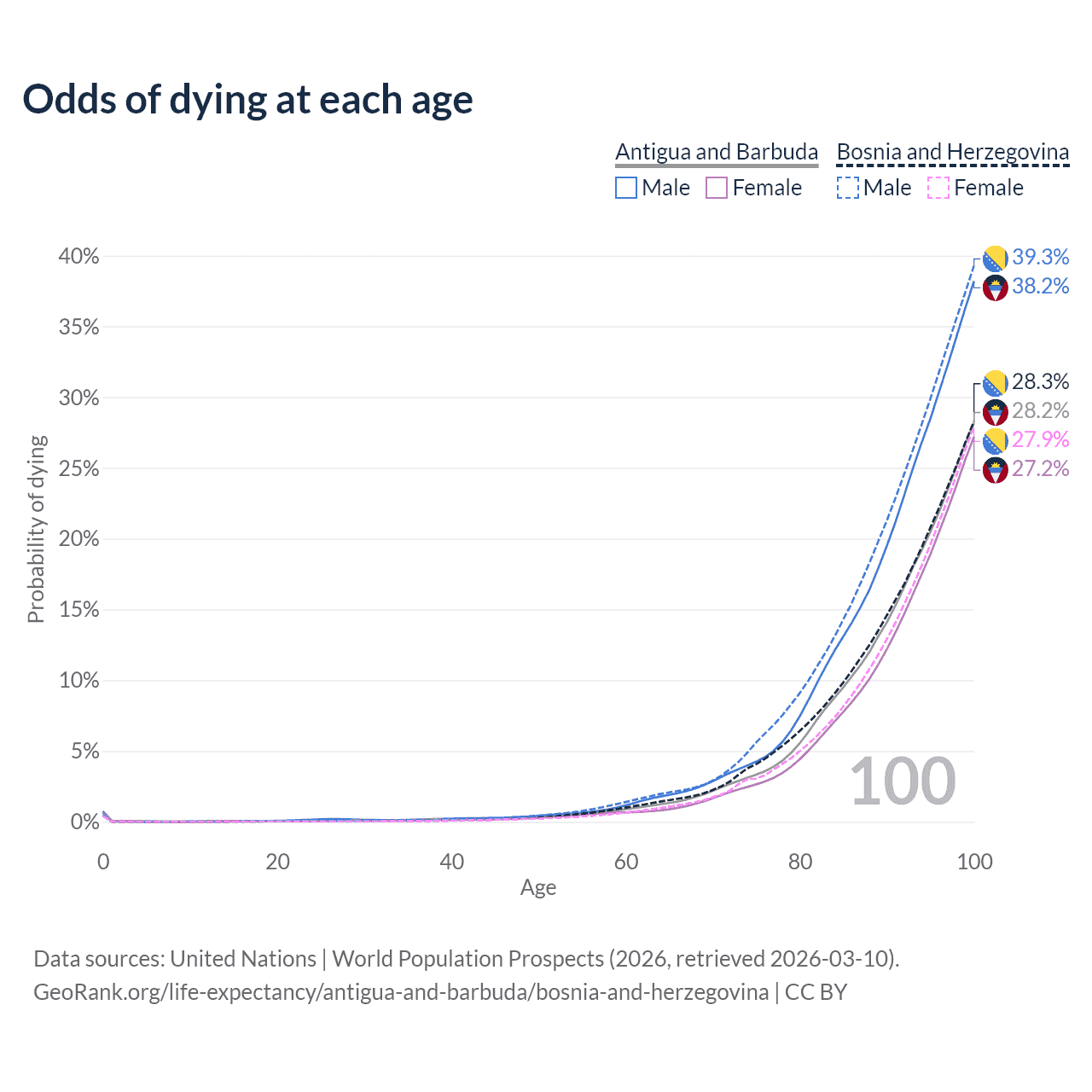 This life expectancy calculator shows the odds of living to 100, 95, 90, and below based on current age for both males and females in Antigua and Barbuda and Bosnia and Herzegovina, along with mean and median age of death. The calculations are based on the 2026 life tables (actuarial tables) from the UN World Population Prospects.