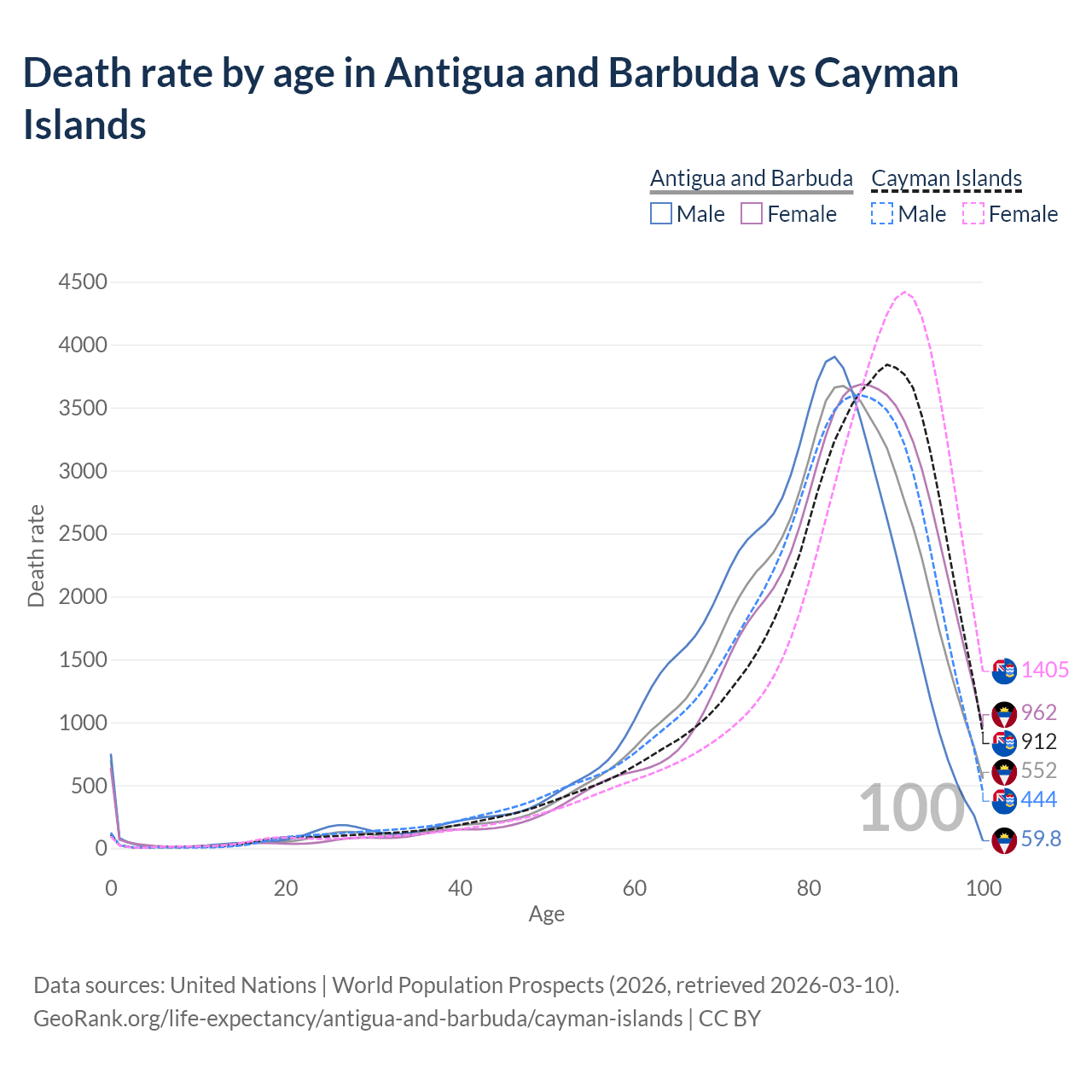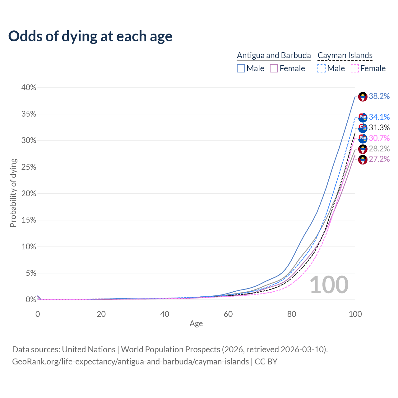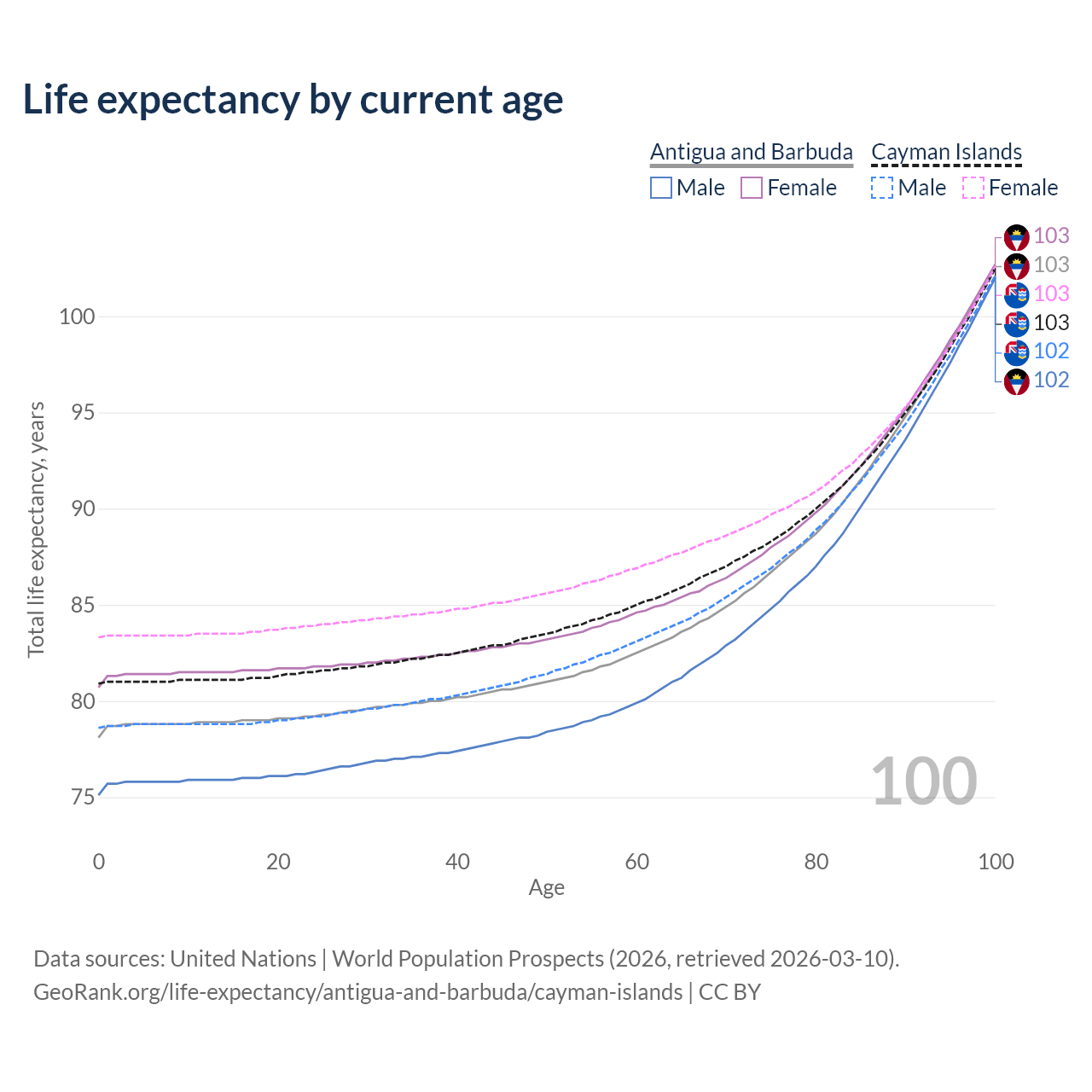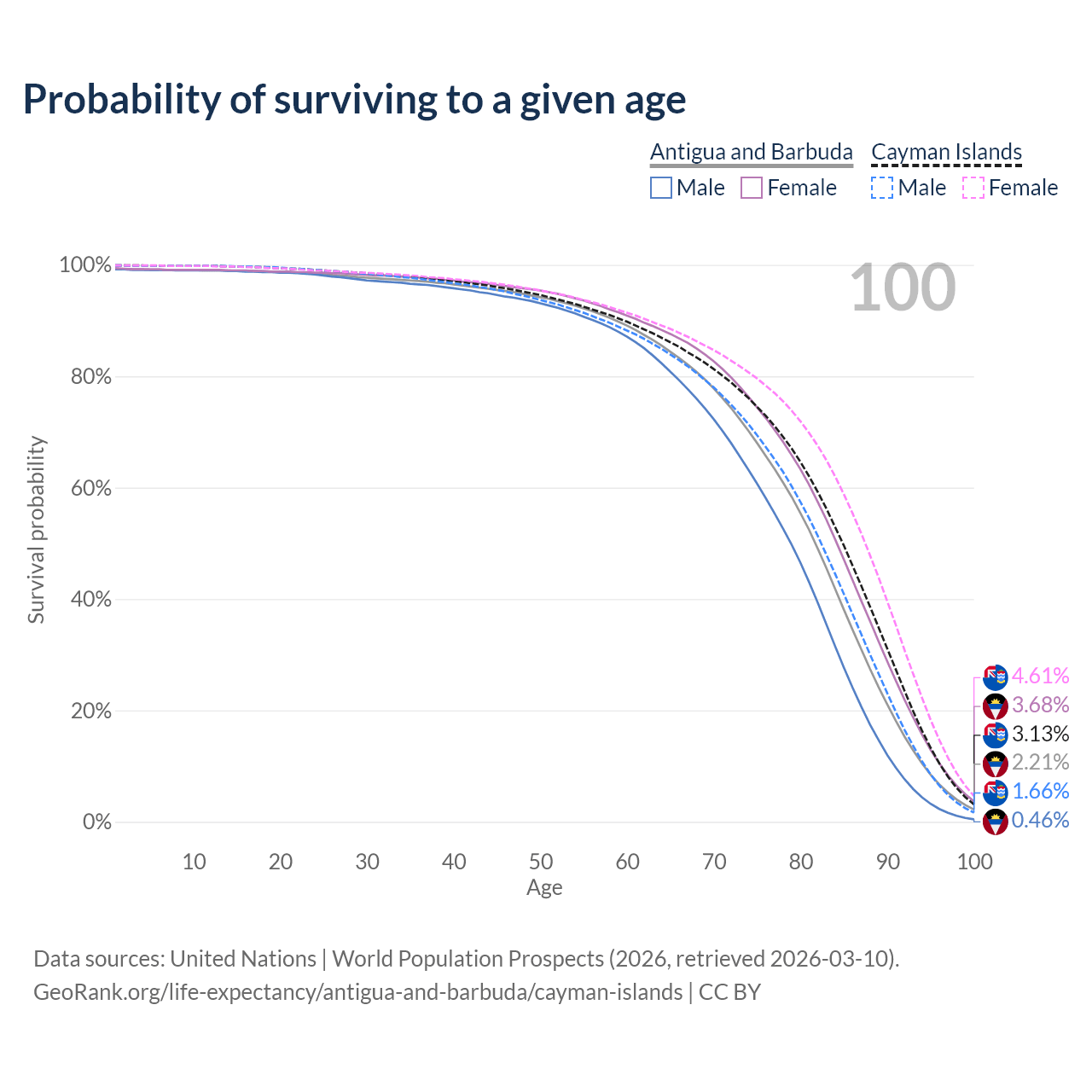 This life expectancy calculator shows the odds of living to 100, 95, 90, and below based on current age for both males and females in Antigua and Barbuda and the Cayman Islands, along with mean and median age of death. The calculations are based on the 2026 life tables (actuarial tables) from the UN World Population Prospects.