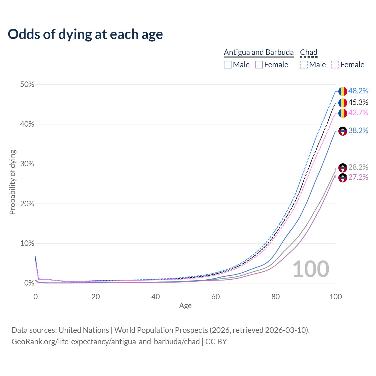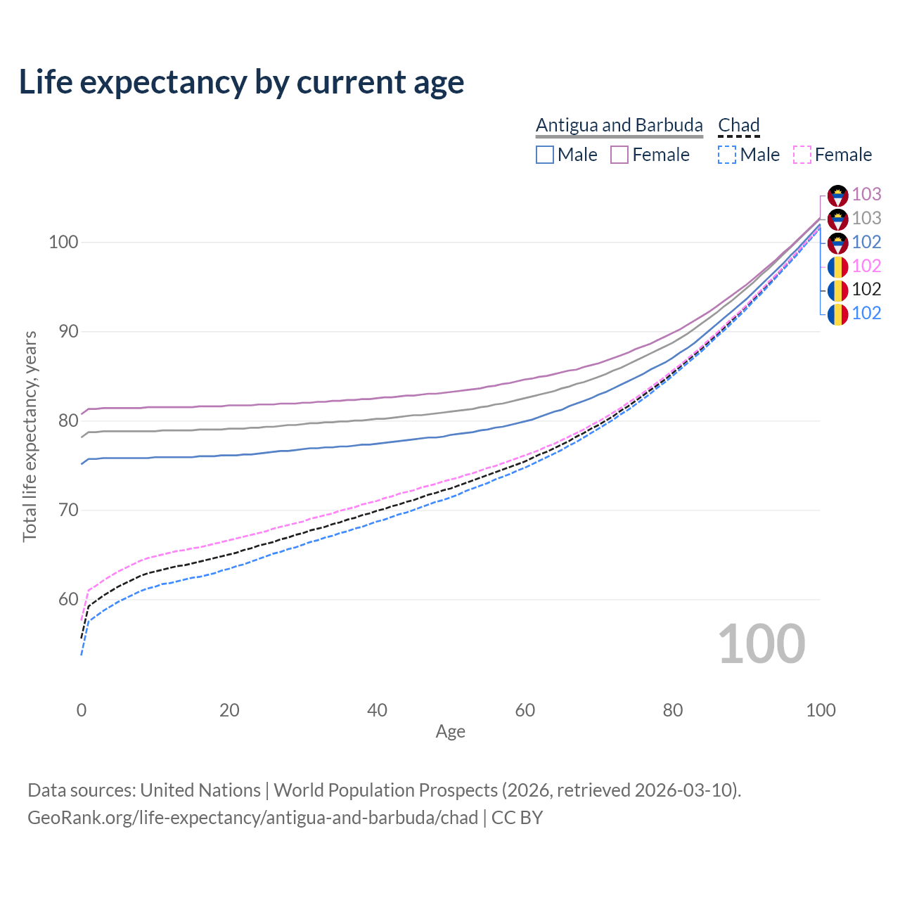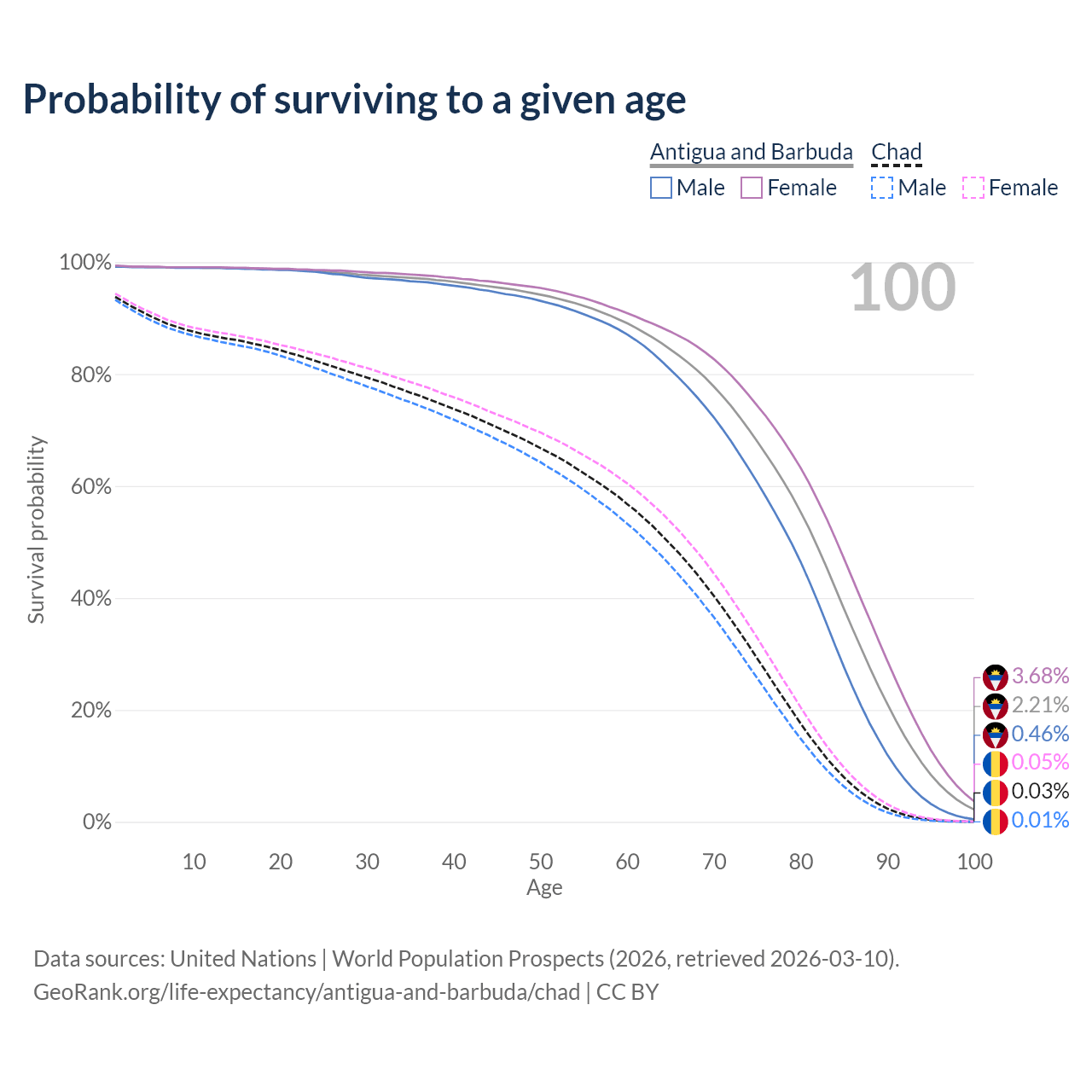 This life expectancy calculator shows the odds of living to 100, 95, 90, and below based on current age for both males and females in Antigua and Barbuda and Chad, along with mean and median age of death. The calculations are based on the 2026 life tables (actuarial tables) from the UN World Population Prospects.