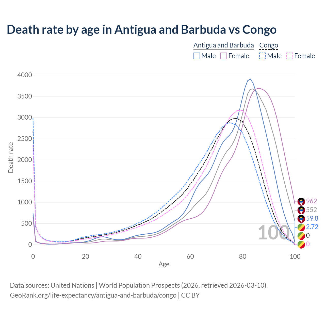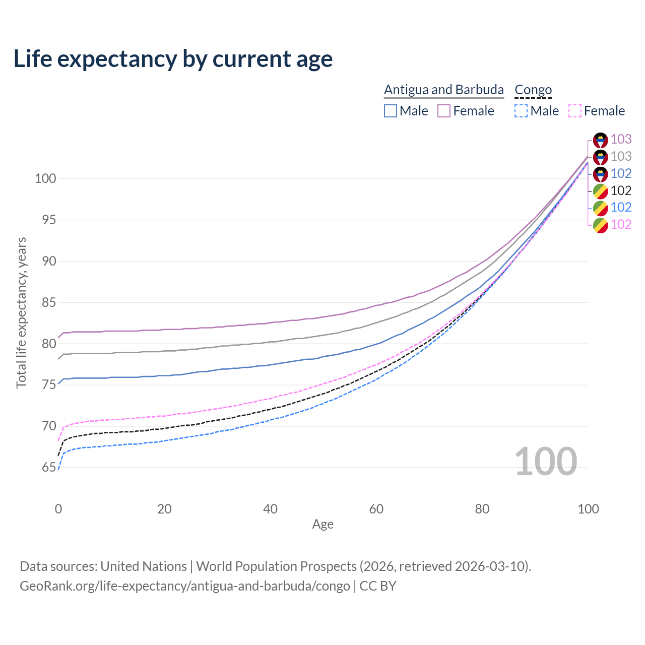 This life expectancy calculator shows the odds of living to 100, 95, 90, and below based on current age for both males and females in Antigua and Barbuda and the Congo, along with mean and median age of death. The calculations are based on the 2026 life tables (actuarial tables) from the UN World Population Prospects.