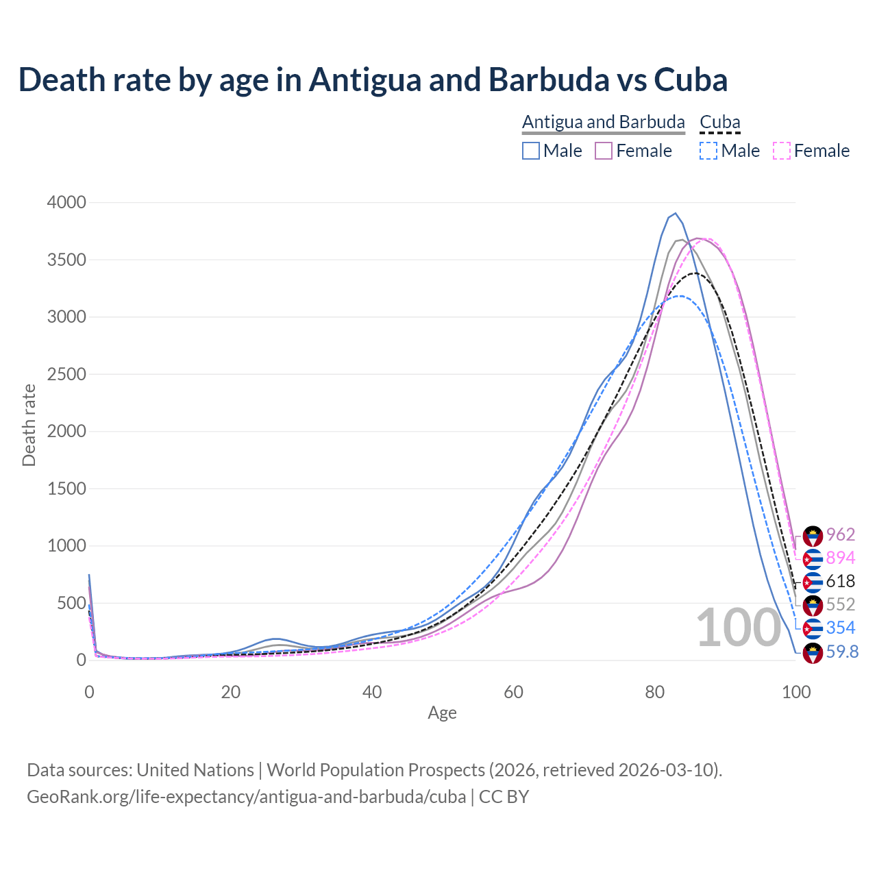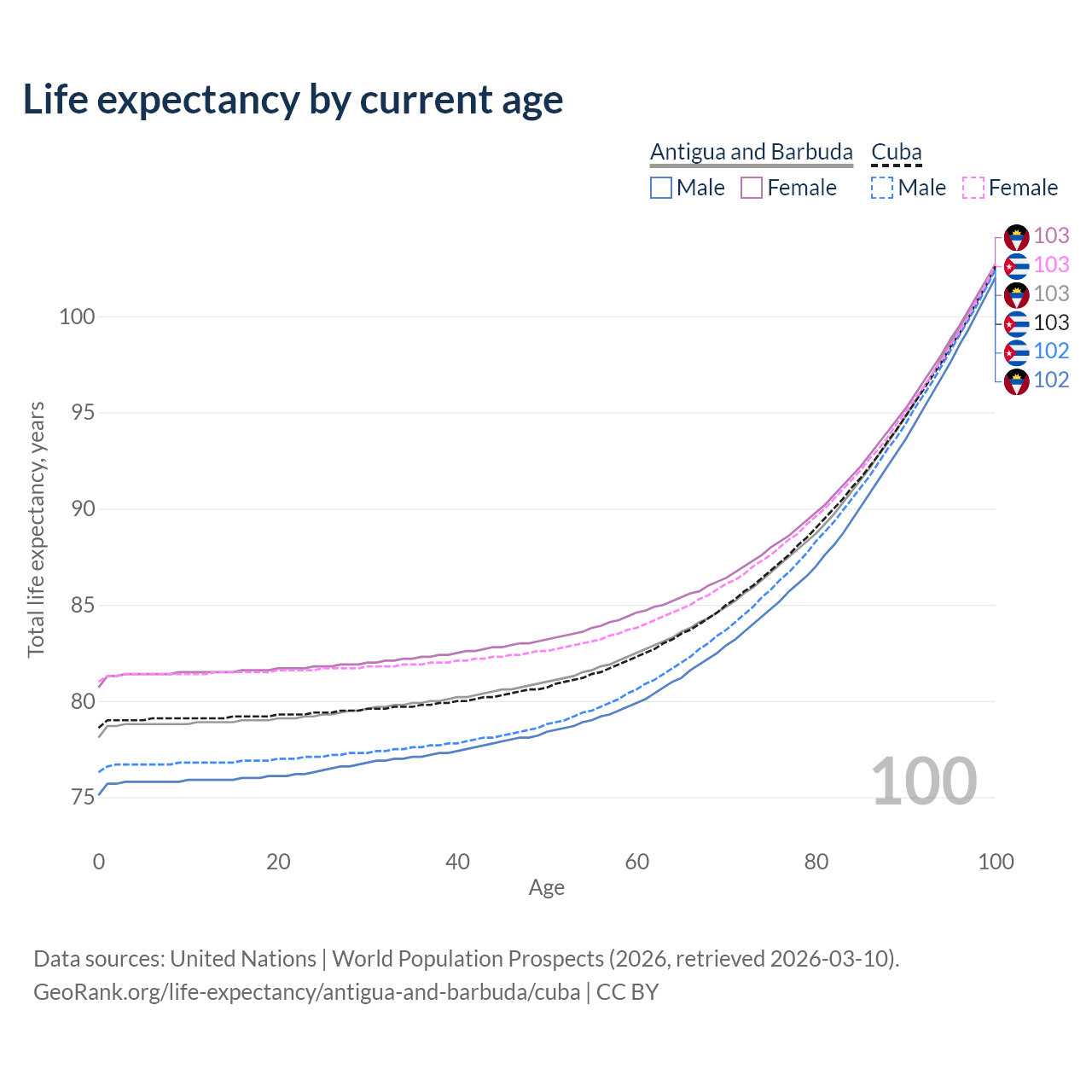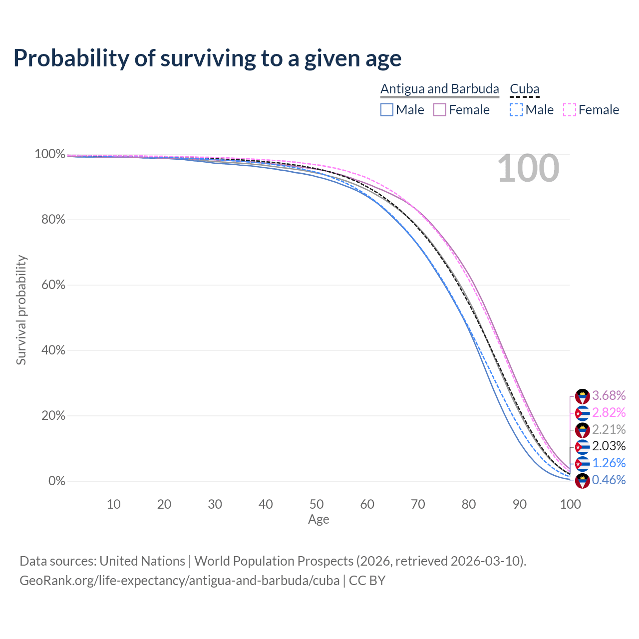 This life expectancy calculator shows the odds of living to 100, 95, 90, and below based on current age for both males and females in Antigua and Barbuda and Cuba, along with mean and median age of death. The calculations are based on the 2026 life tables (actuarial tables) from the UN World Population Prospects.