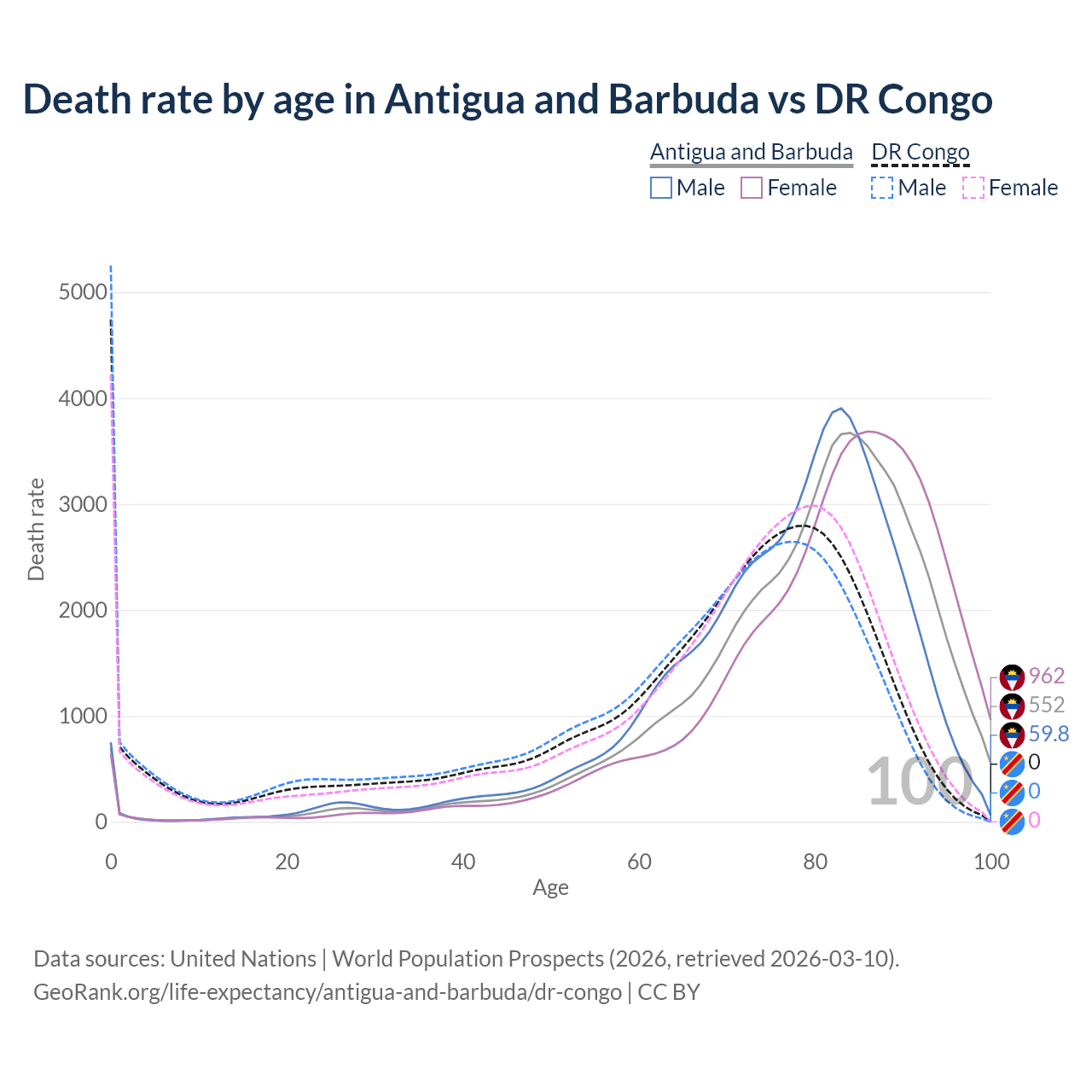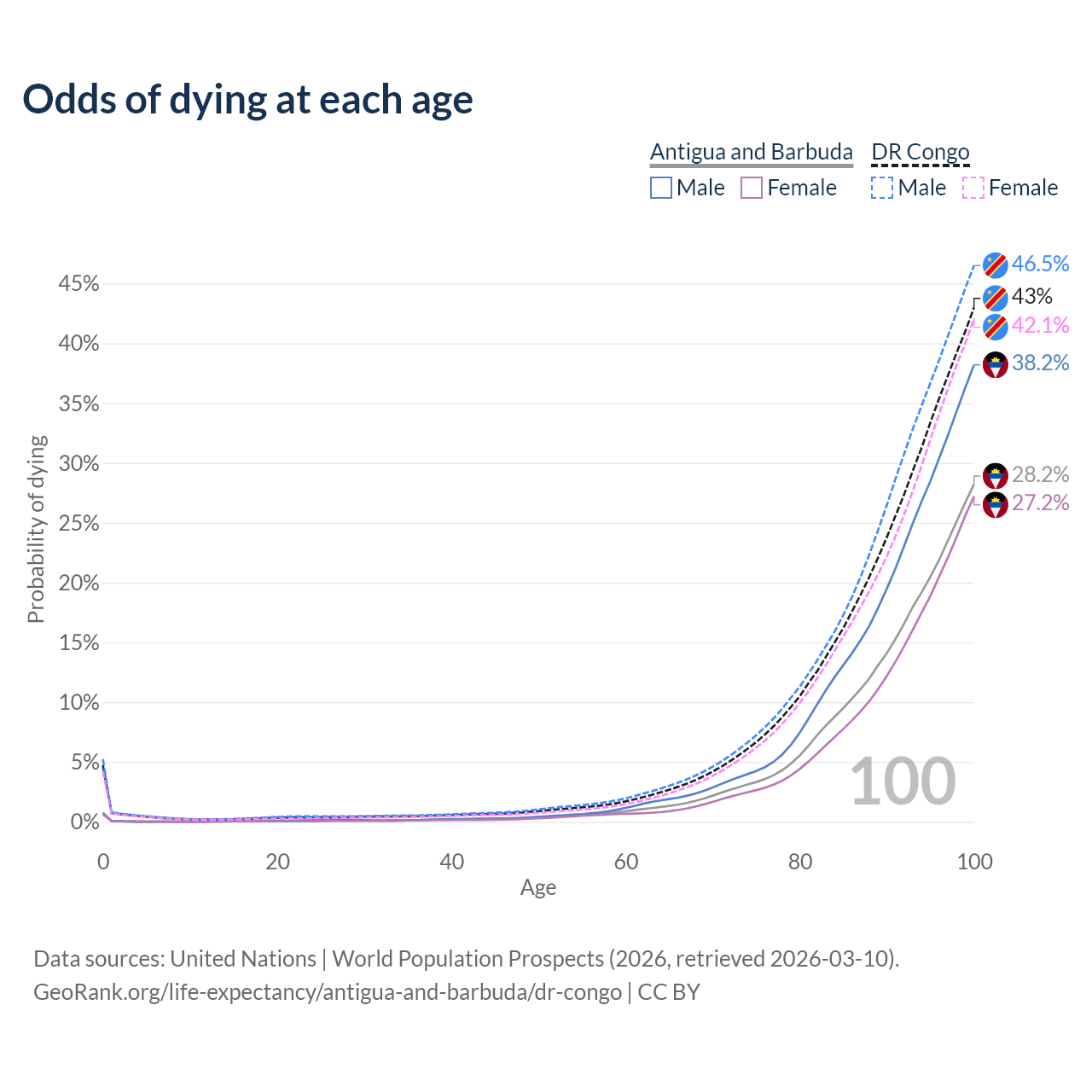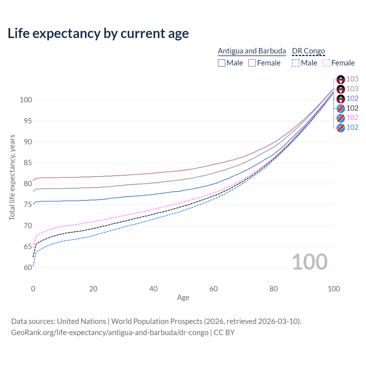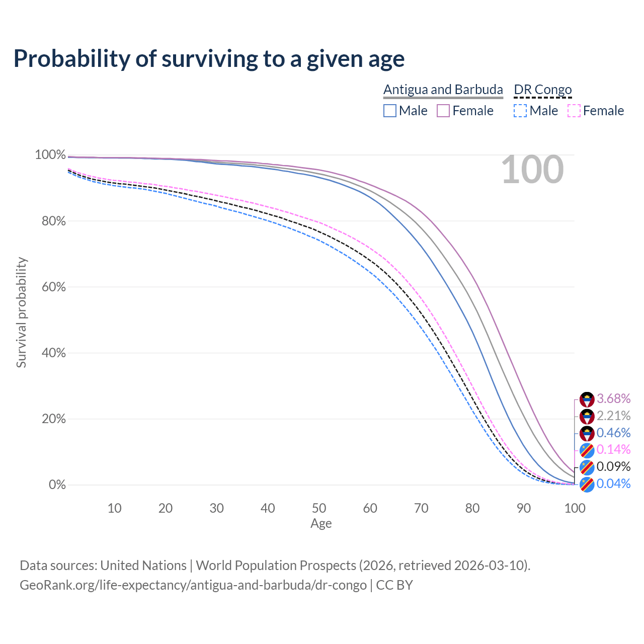 This life expectancy calculator shows the odds of living to 100, 95, 90, and below based on current age for both males and females in Antigua and Barbuda and the DR Congo, along with mean and median age of death. The calculations are based on the 2026 life tables (actuarial tables) from the UN World Population Prospects.