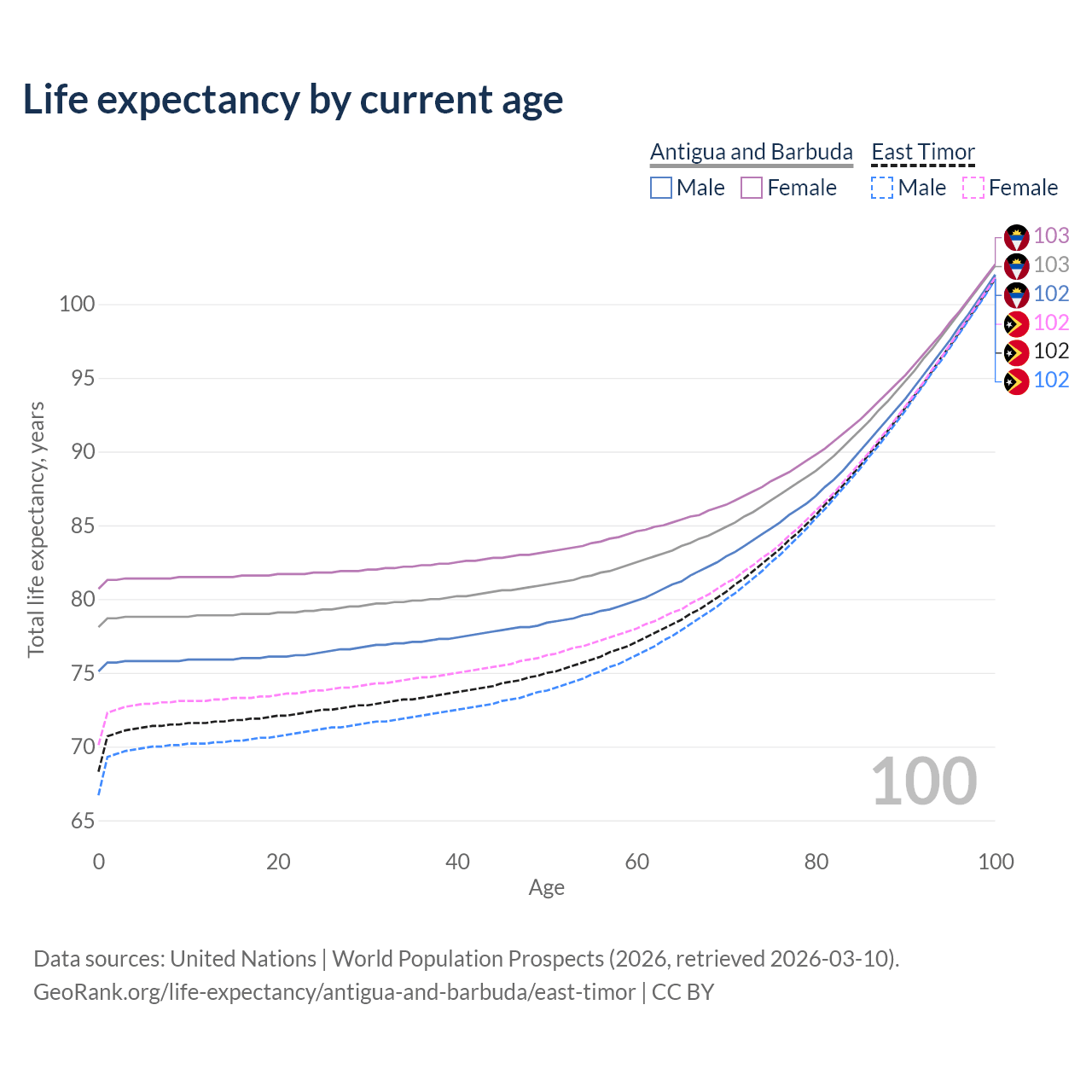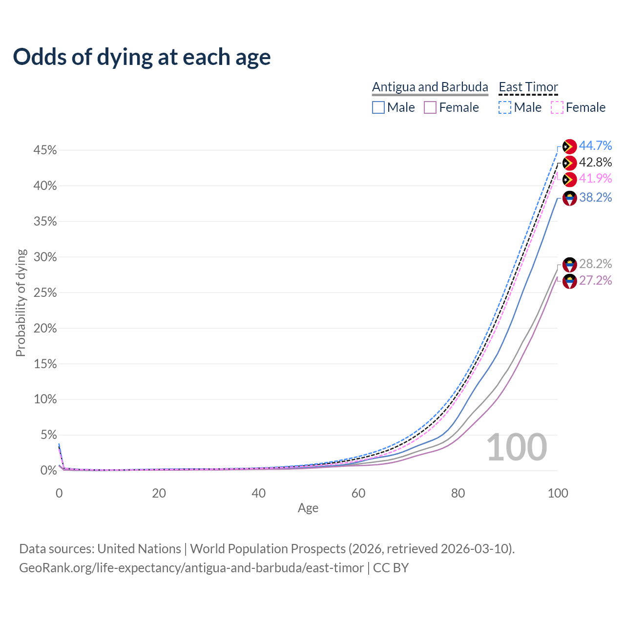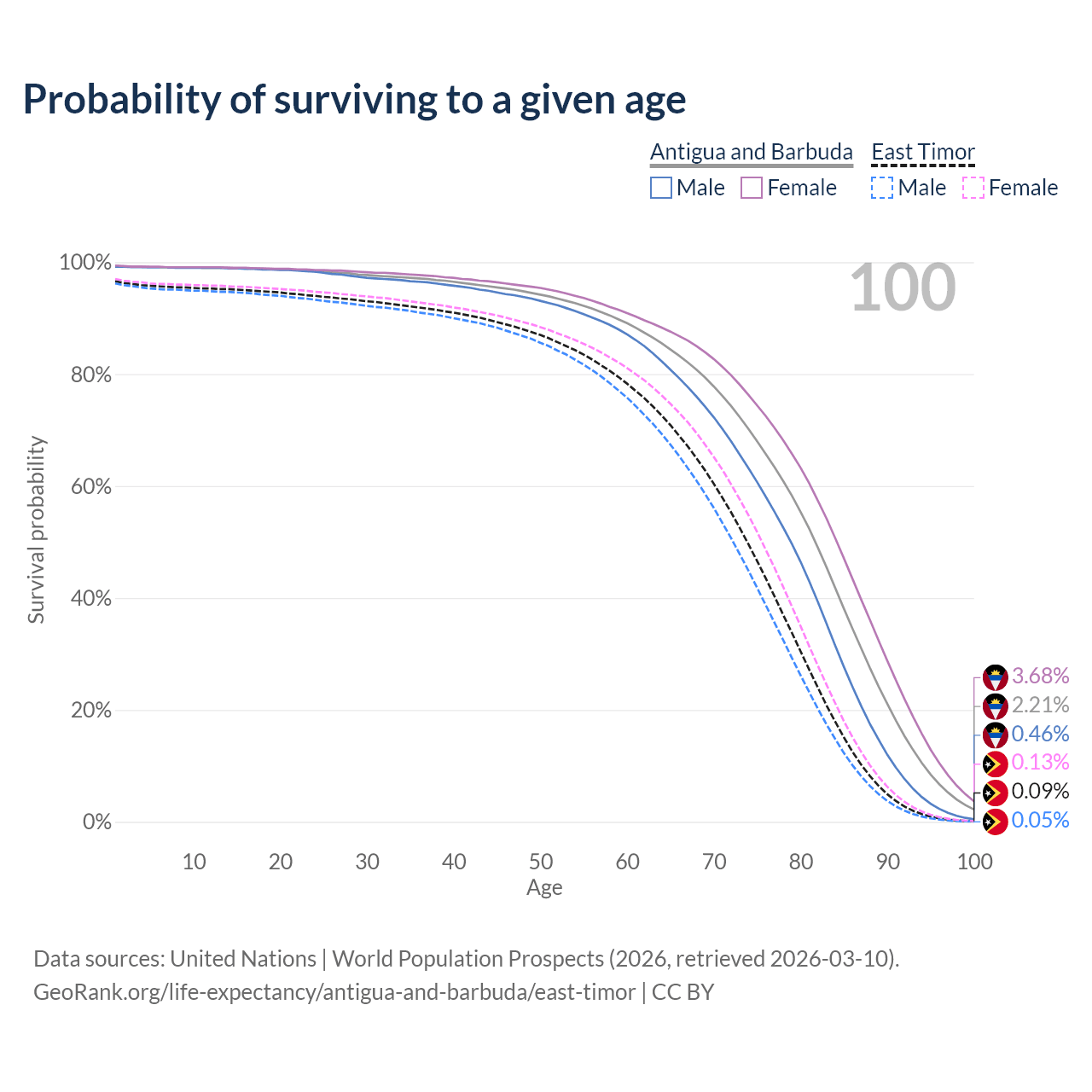 This life expectancy calculator shows the odds of living to 100, 95, 90, and below based on current age for both males and females in Antigua and Barbuda and East Timor, along with mean and median age of death. The calculations are based on the 2026 life tables (actuarial tables) from the UN World Population Prospects.
