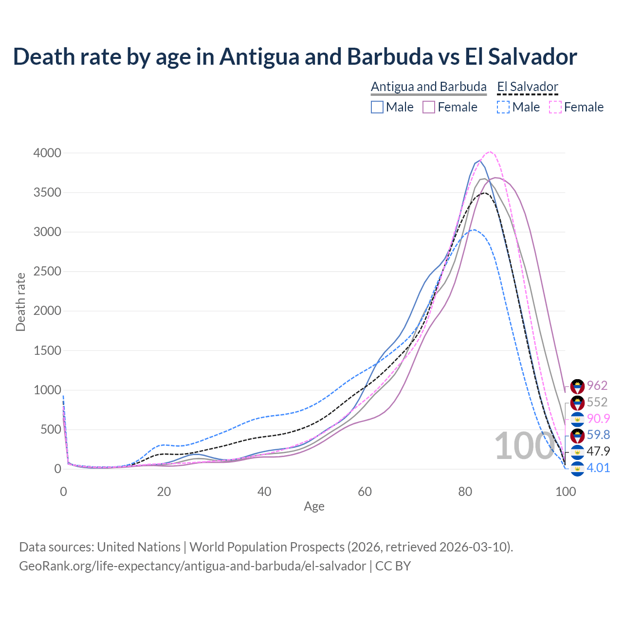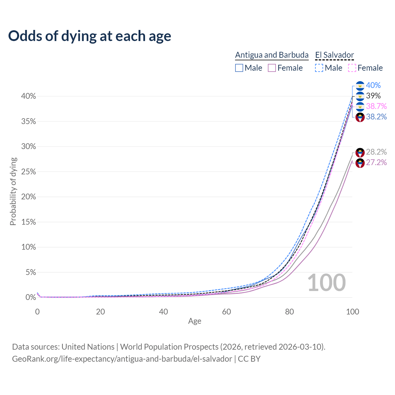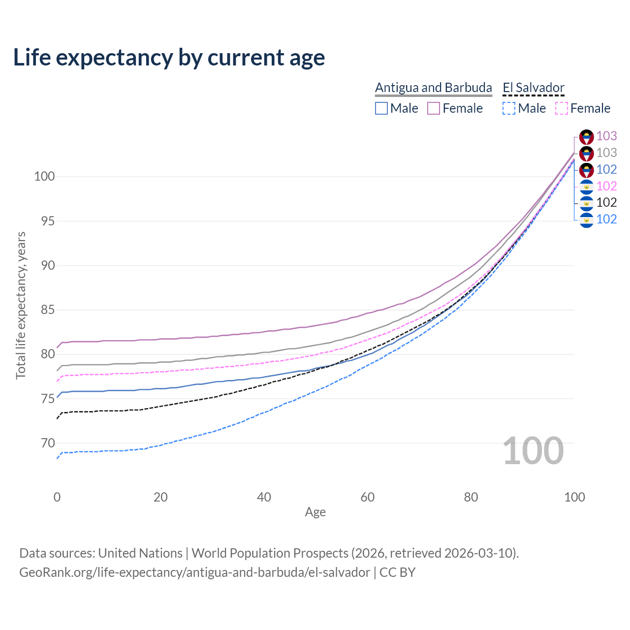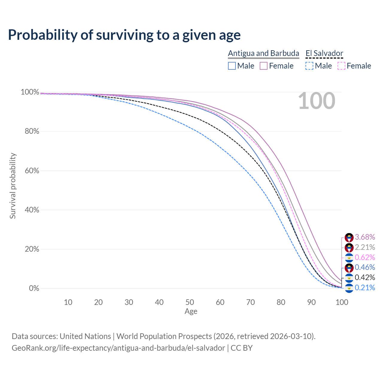 This life expectancy calculator shows the odds of living to 100, 95, 90, and below based on current age for both males and females in Antigua and Barbuda and El Salvador, along with mean and median age of death. The calculations are based on the 2026 life tables (actuarial tables) from the UN World Population Prospects.