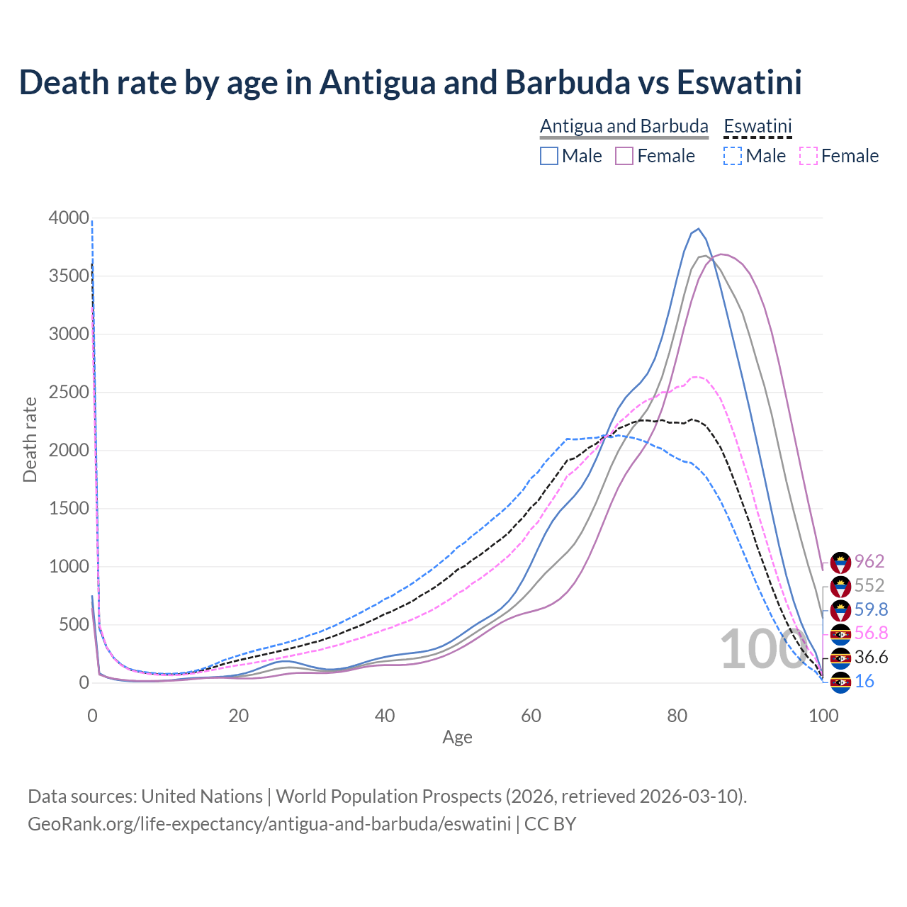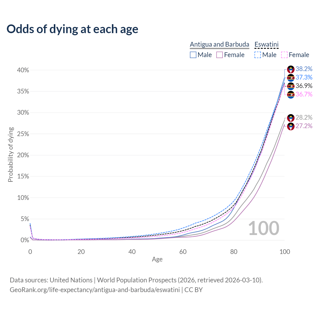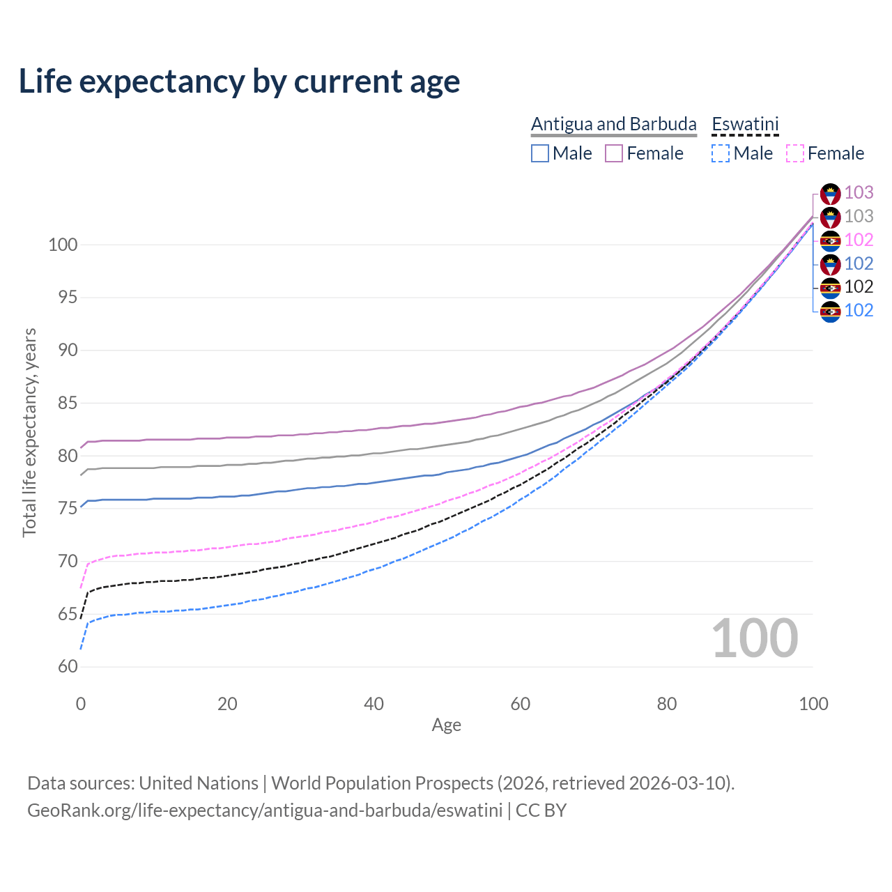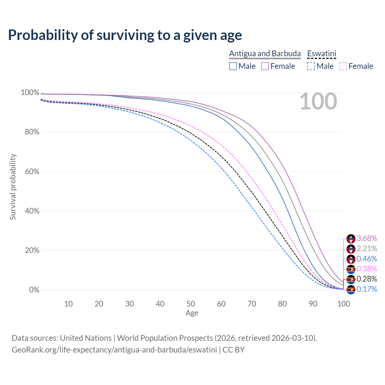This life expectancy calculator shows the odds of living to 100, 95, 90, and below based on current age for both males and females in Antigua and Barbuda and Eswatini, along with mean and median age of death. The calculations are based on the 2026 life tables (actuarial tables) from the UN World Population Prospects.