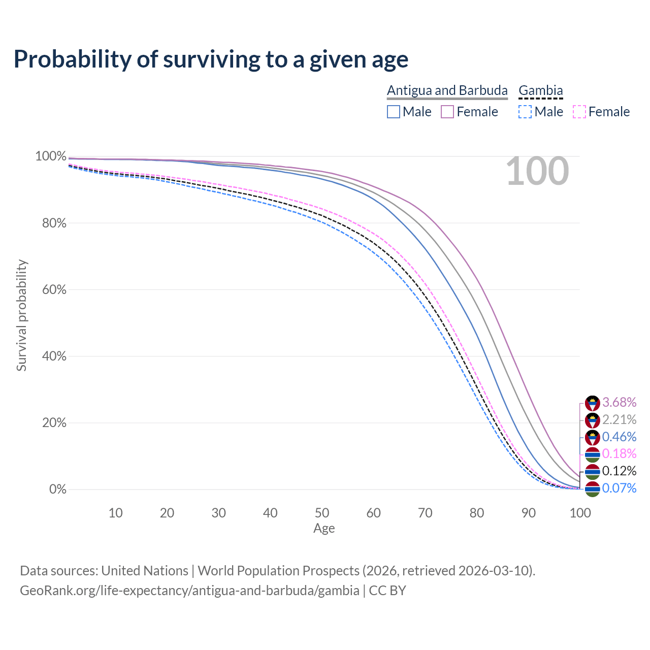 This life expectancy calculator shows the odds of living to 100, 95, 90, and below based on current age for both males and females in Antigua and Barbuda and the Gambia, along with mean and median age of death. The calculations are based on the 2026 life tables (actuarial tables) from the UN World Population Prospects.