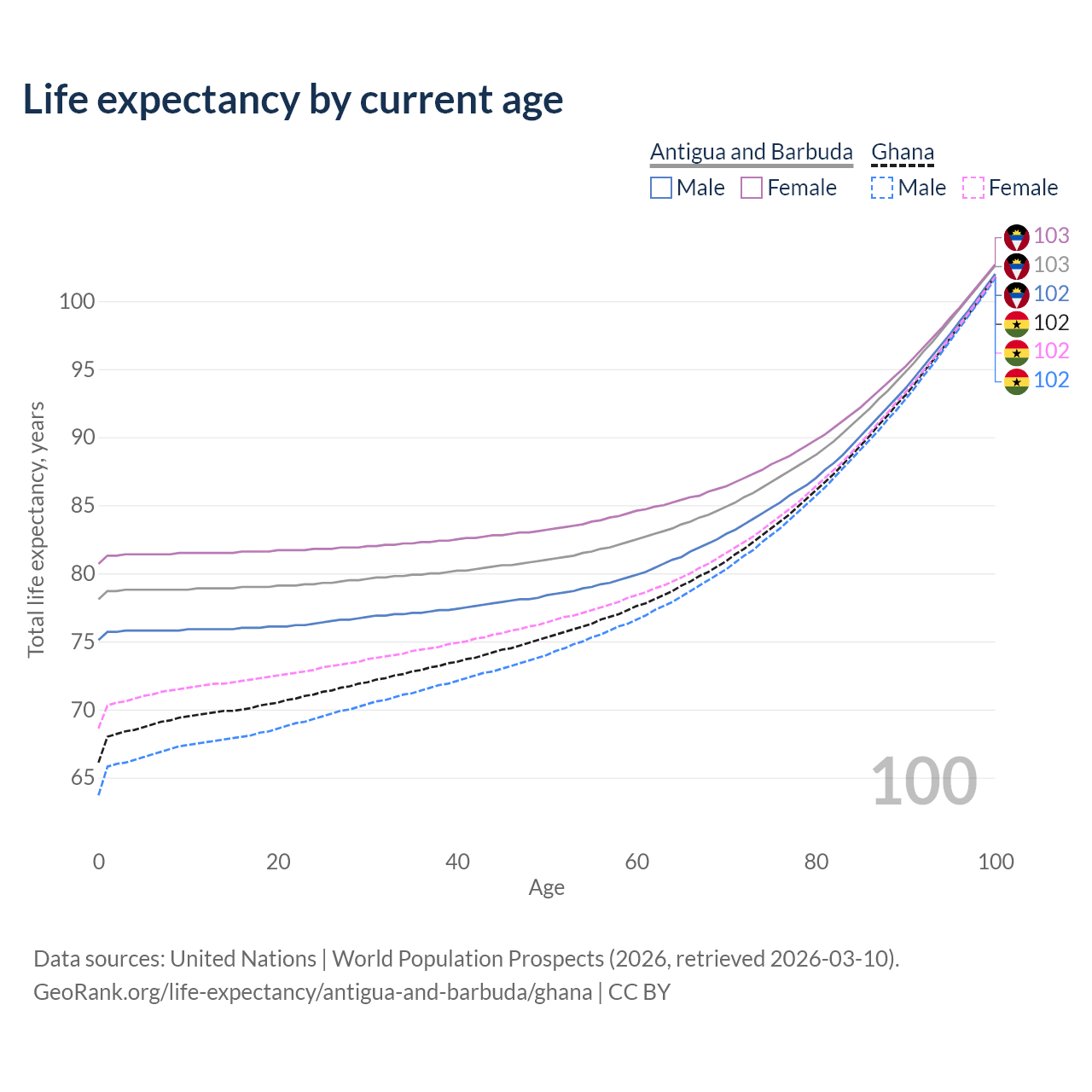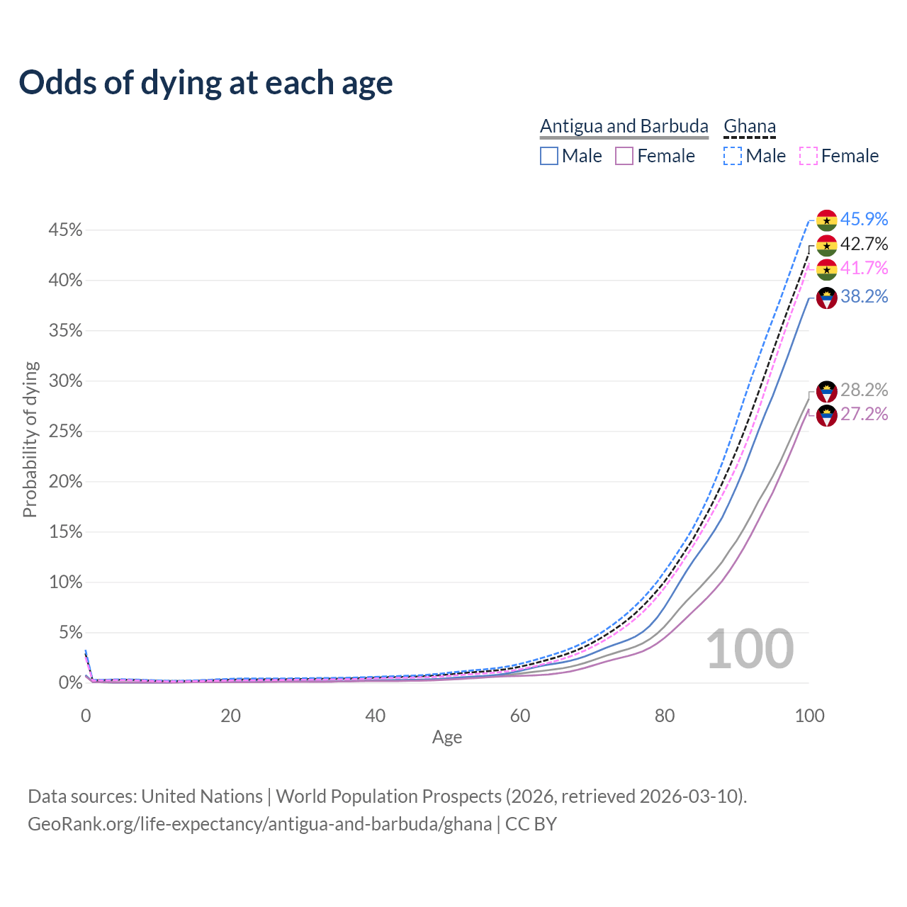 This life expectancy calculator shows the odds of living to 100, 95, 90, and below based on current age for both males and females in Antigua and Barbuda and Ghana, along with mean and median age of death. The calculations are based on the 2026 life tables (actuarial tables) from the UN World Population Prospects.