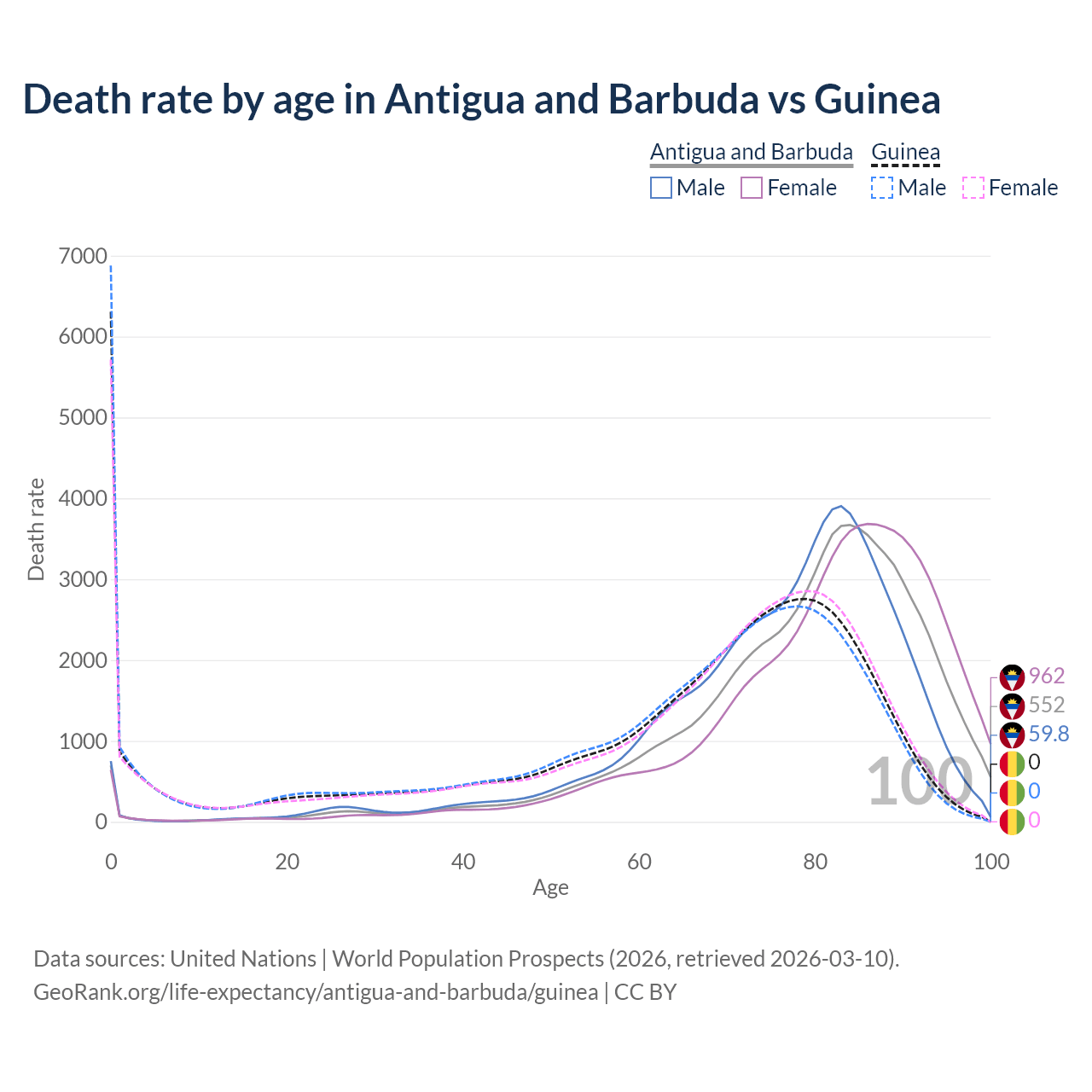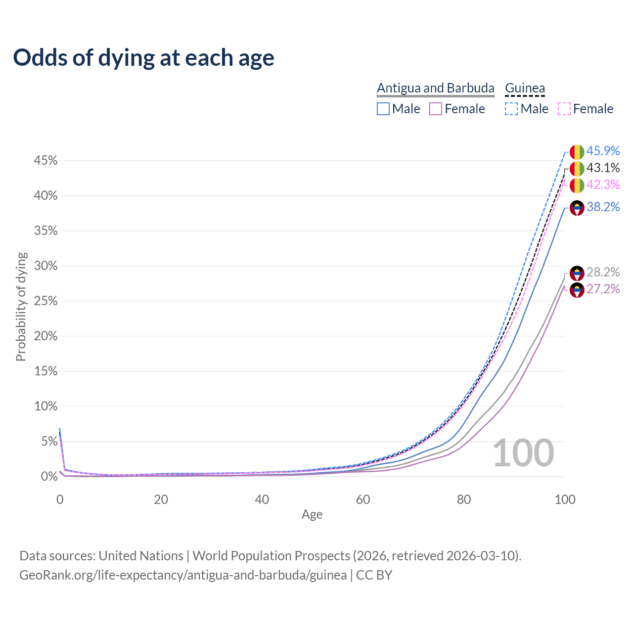 This life expectancy calculator shows the odds of living to 100, 95, 90, and below based on current age for both males and females in Antigua and Barbuda and Guinea, along with mean and median age of death. The calculations are based on the 2026 life tables (actuarial tables) from the UN World Population Prospects.