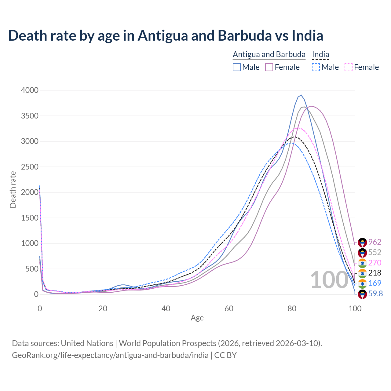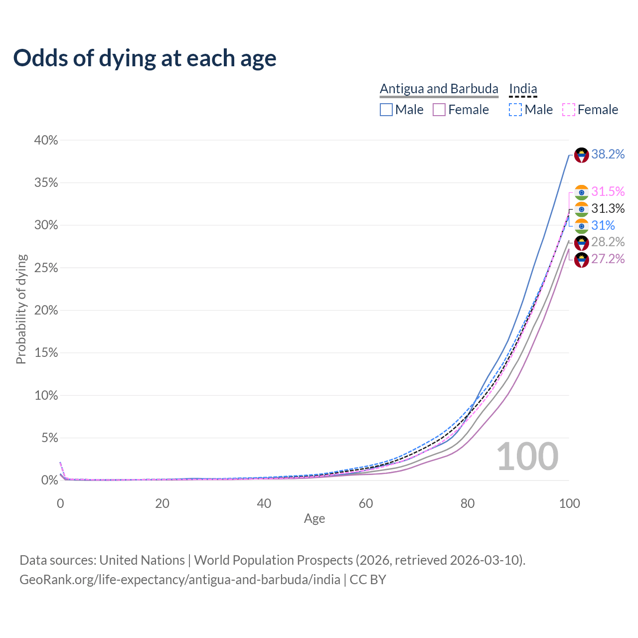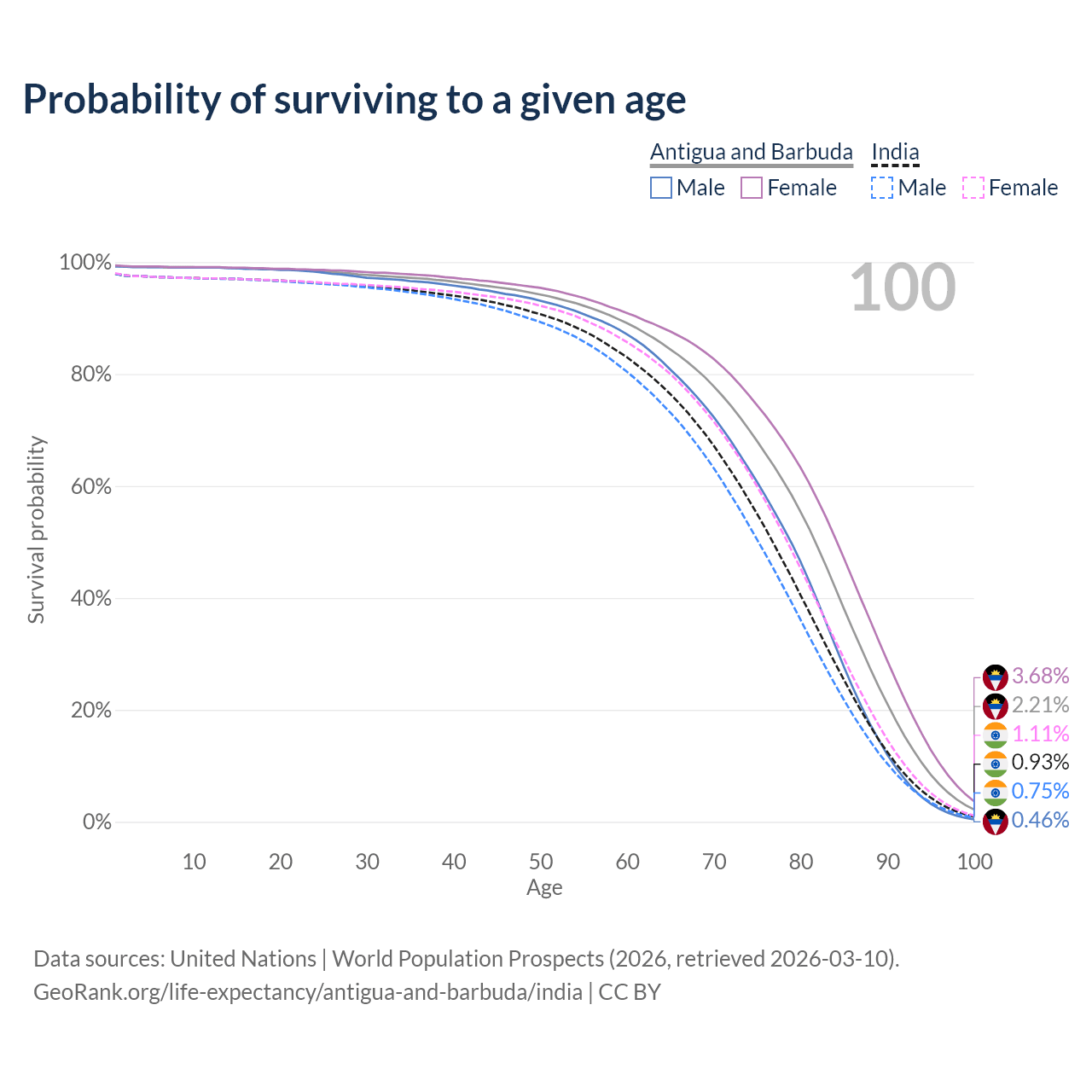 This life expectancy calculator shows the odds of living to 100, 95, 90, and below based on current age for both males and females in Antigua and Barbuda and India, along with mean and median age of death. The calculations are based on the 2026 life tables (actuarial tables) from the UN World Population Prospects.