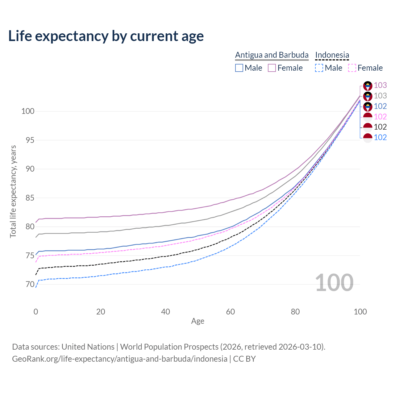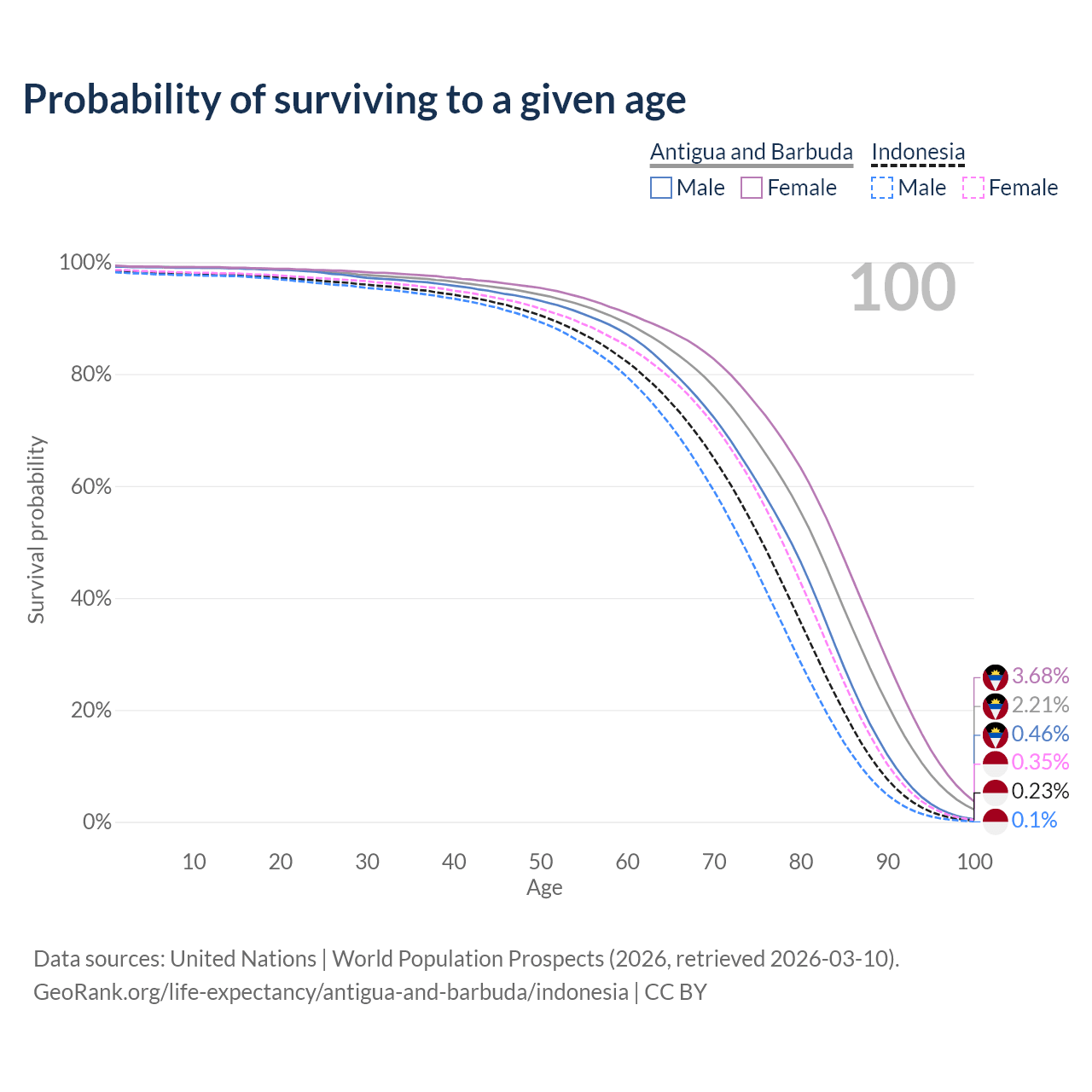This life expectancy calculator shows the odds of living to 100, 95, 90, and below based on current age for both males and females in Antigua and Barbuda and Indonesia, along with mean and median age of death. The calculations are based on the 2026 life tables (actuarial tables) from the UN World Population Prospects.