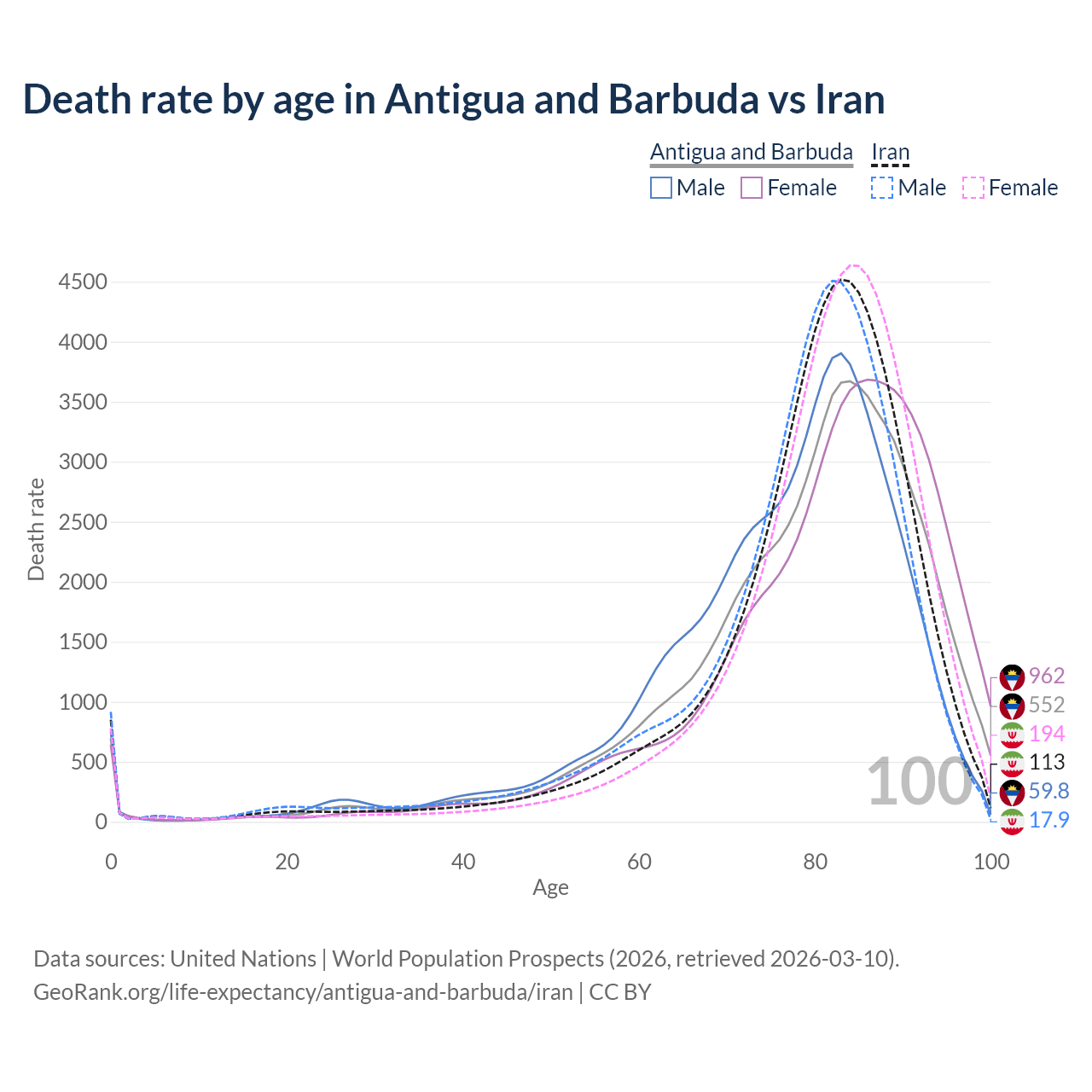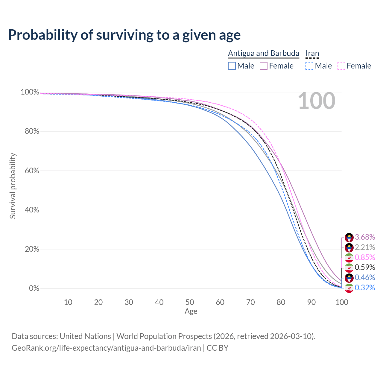 This life expectancy calculator shows the odds of living to 100, 95, 90, and below based on current age for both males and females in Antigua and Barbuda and Iran, along with mean and median age of death. The calculations are based on the 2026 life tables (actuarial tables) from the UN World Population Prospects.