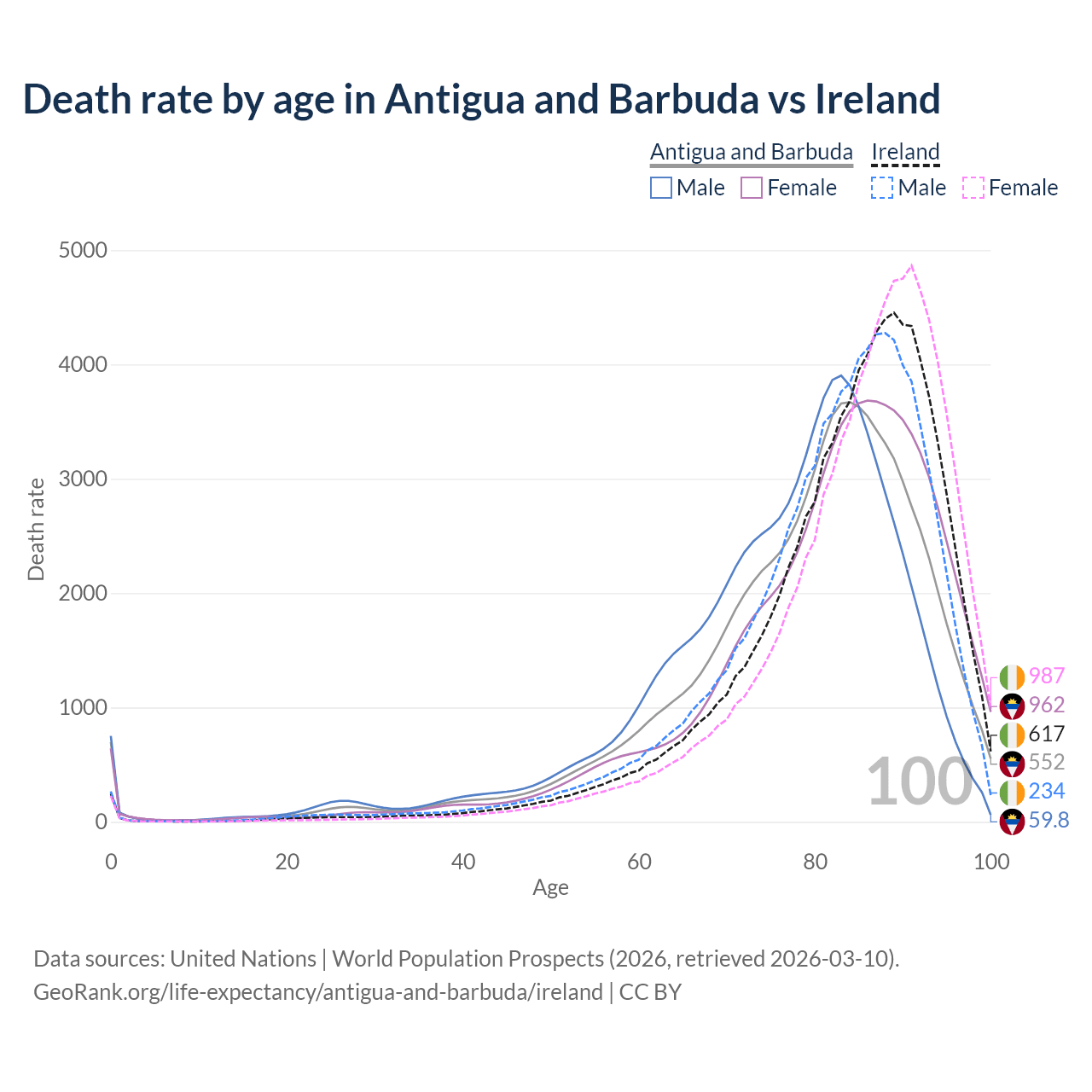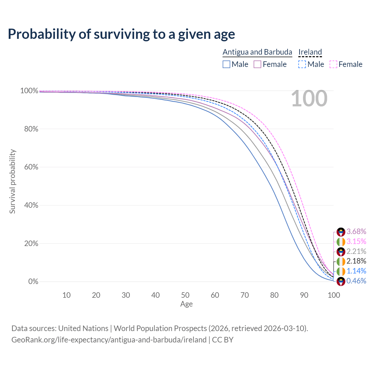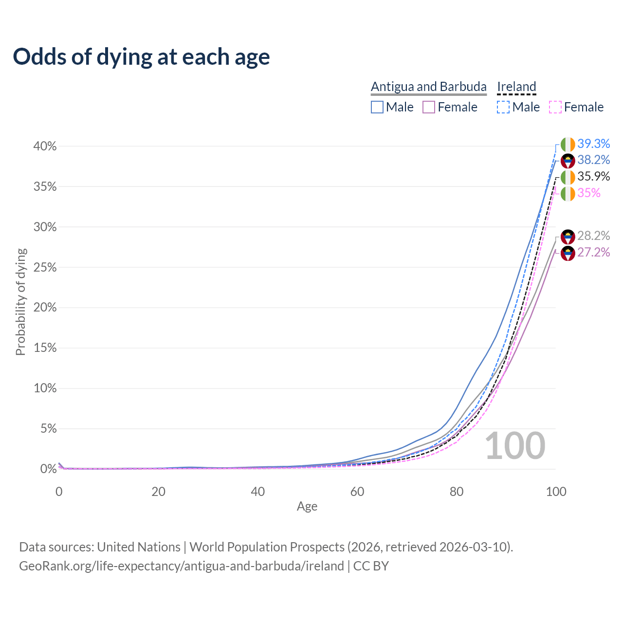 This life expectancy calculator shows the odds of living to 100, 95, 90, and below based on current age for both males and females in Antigua and Barbuda and Ireland, along with mean and median age of death. The calculations are based on the 2026 life tables (actuarial tables) from the UN World Population Prospects.