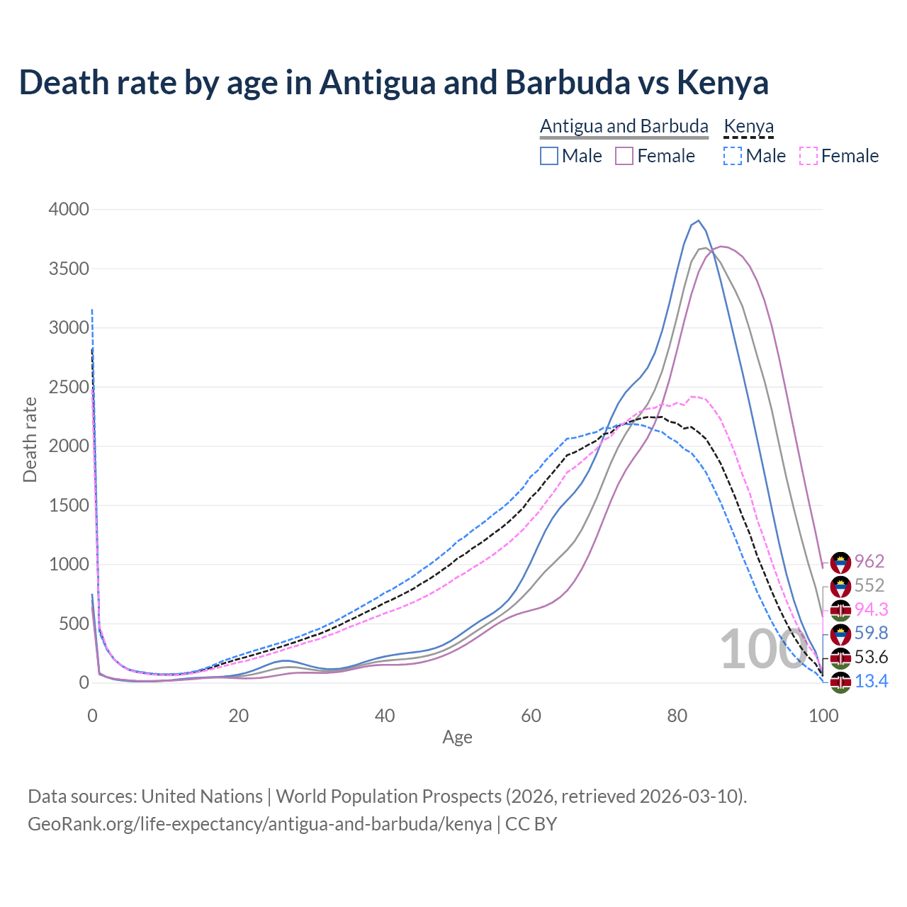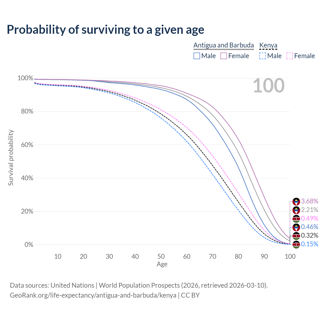 This life expectancy calculator shows the odds of living to 100, 95, 90, and below based on current age for both males and females in Antigua and Barbuda and Kenya, along with mean and median age of death. The calculations are based on the 2026 life tables (actuarial tables) from the UN World Population Prospects.
