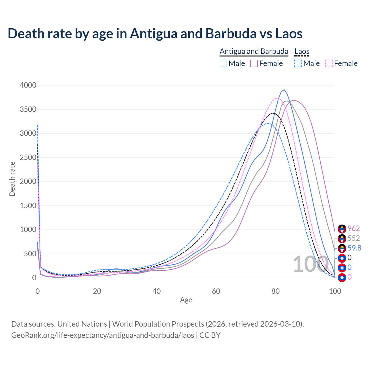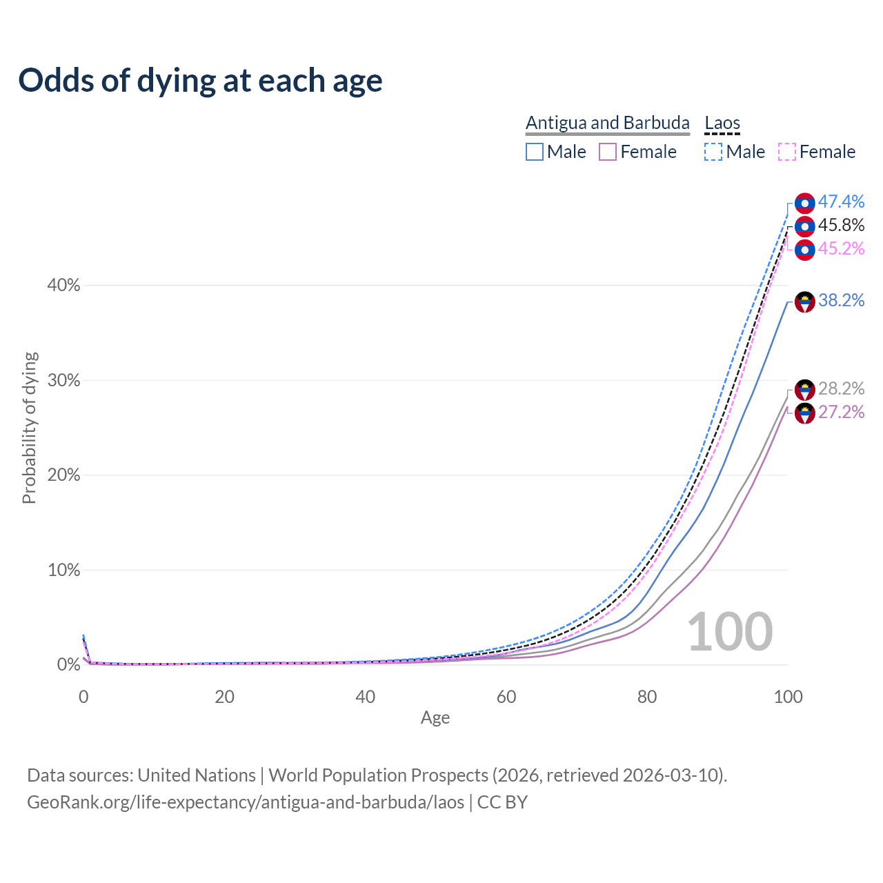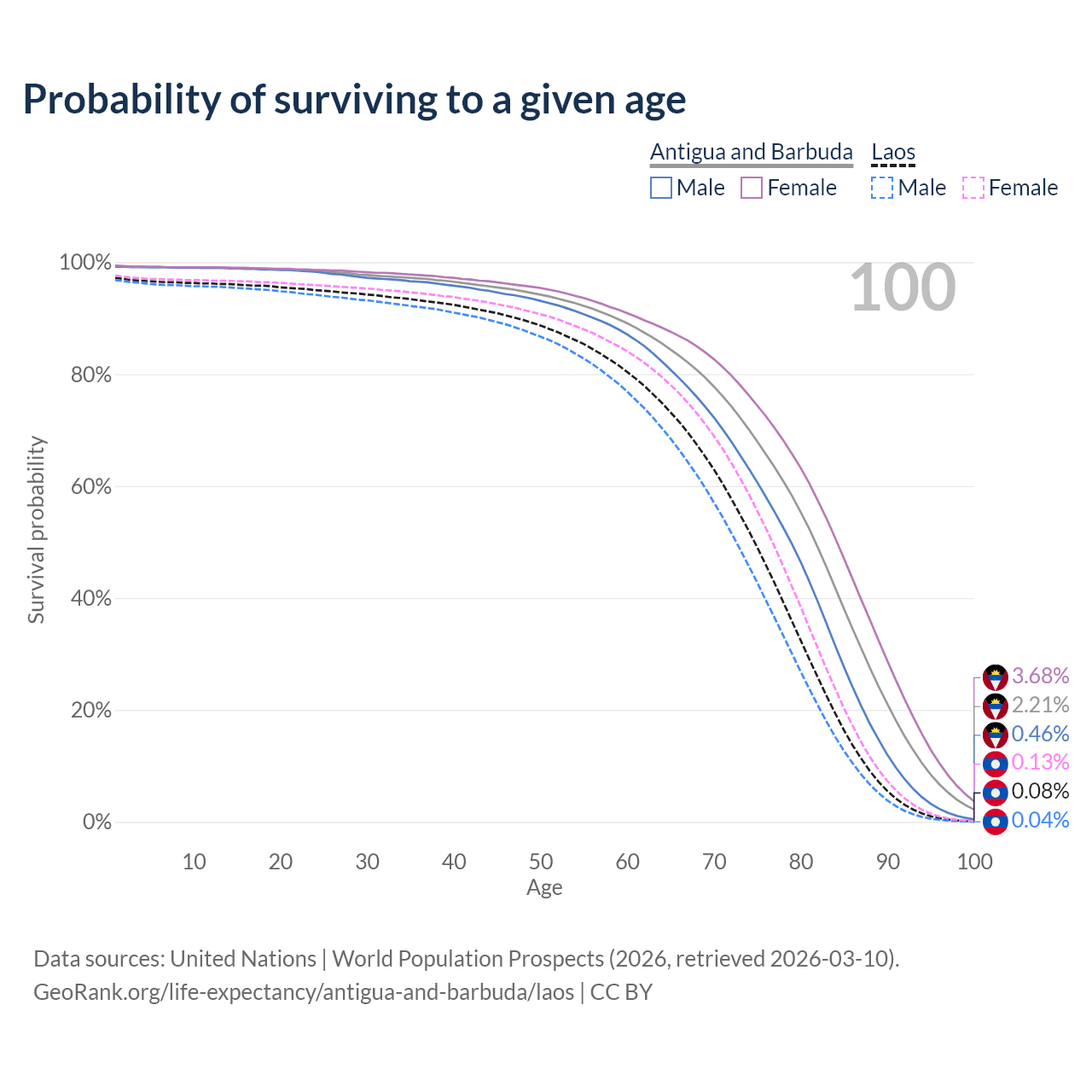 This life expectancy calculator shows the odds of living to 100, 95, 90, and below based on current age for both males and females in Antigua and Barbuda and Laos, along with mean and median age of death. The calculations are based on the 2026 life tables (actuarial tables) from the UN World Population Prospects.