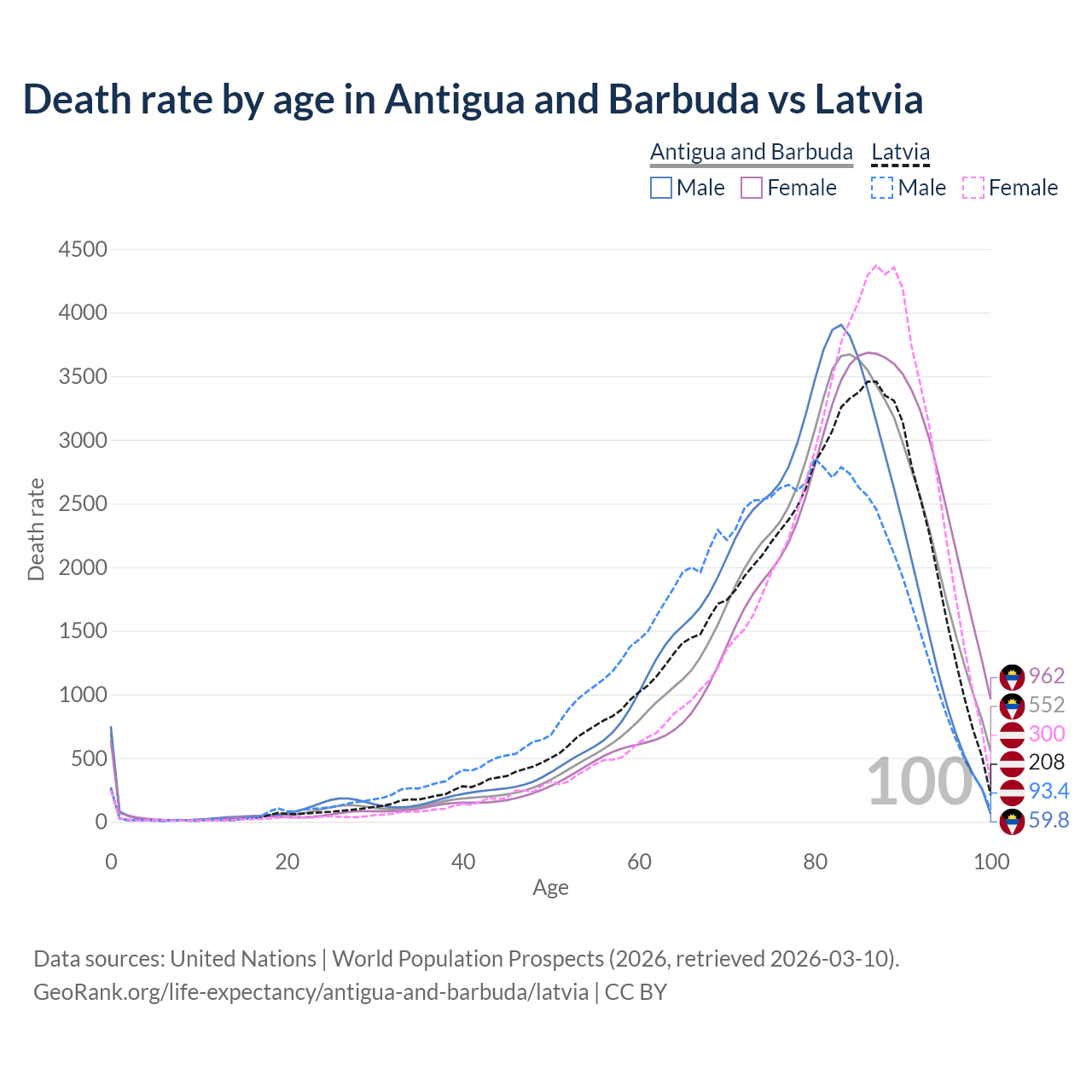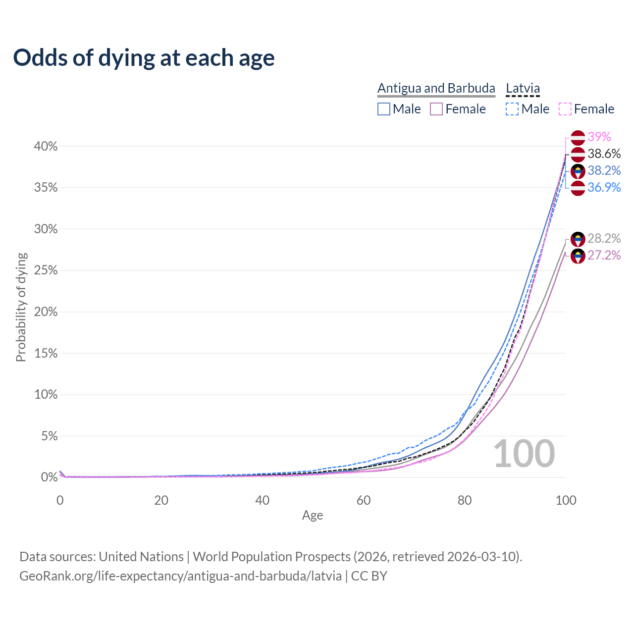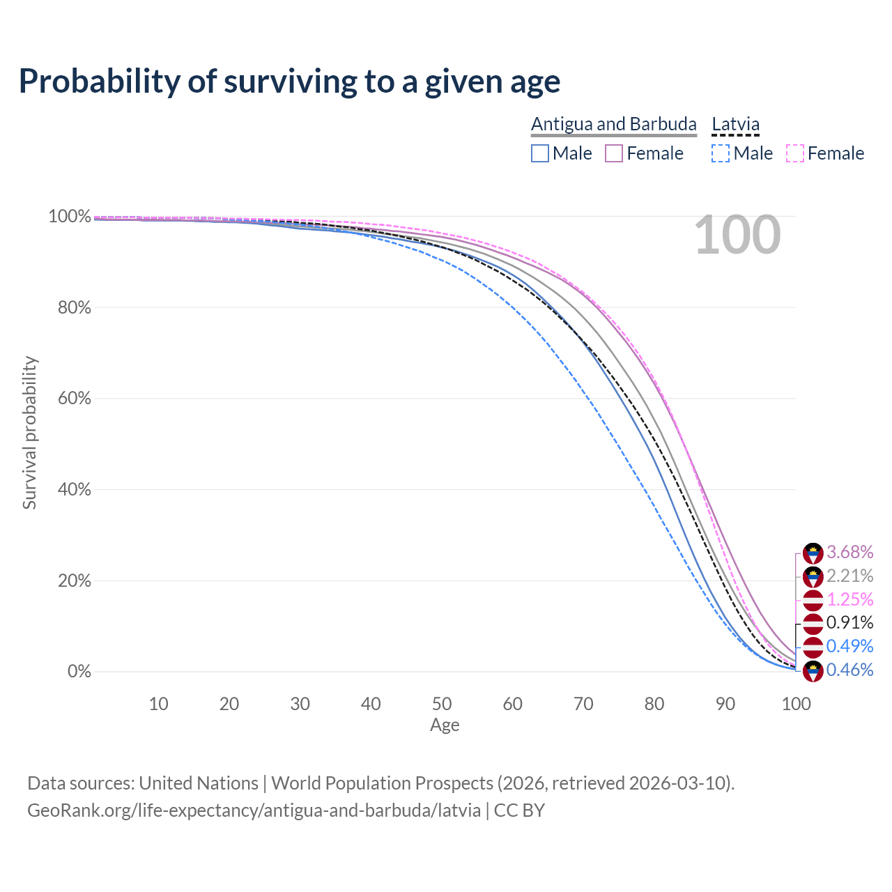 This life expectancy calculator shows the odds of living to 100, 95, 90, and below based on current age for both males and females in Antigua and Barbuda and Latvia, along with mean and median age of death. The calculations are based on the 2026 life tables (actuarial tables) from the UN World Population Prospects.