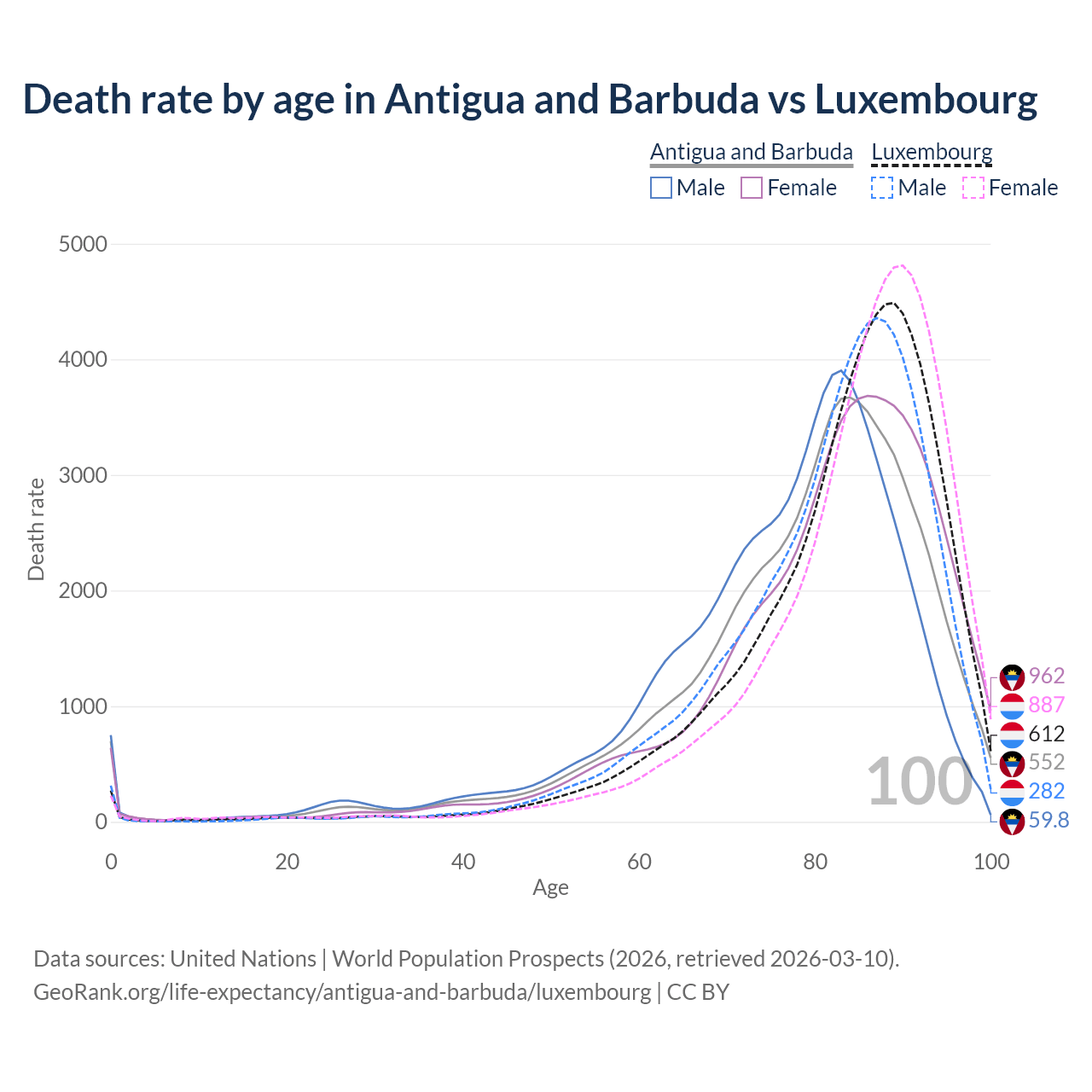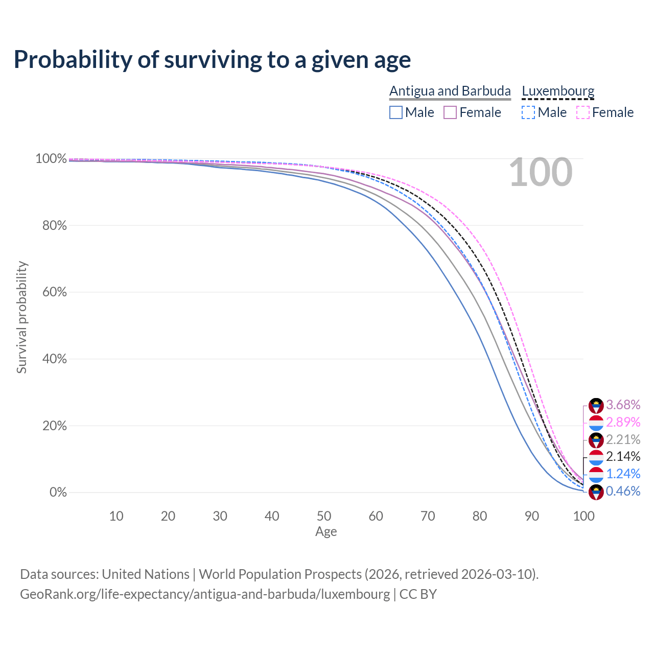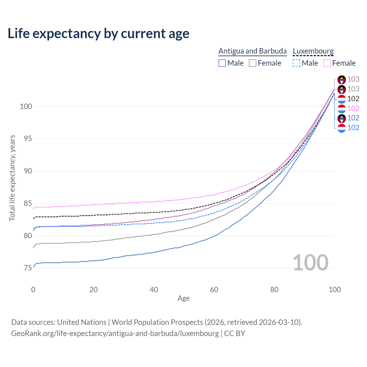 This life expectancy calculator shows the odds of living to 100, 95, 90, and below based on current age for both males and females in Antigua and Barbuda and Luxembourg, along with mean and median age of death. The calculations are based on the 2026 life tables (actuarial tables) from the UN World Population Prospects.