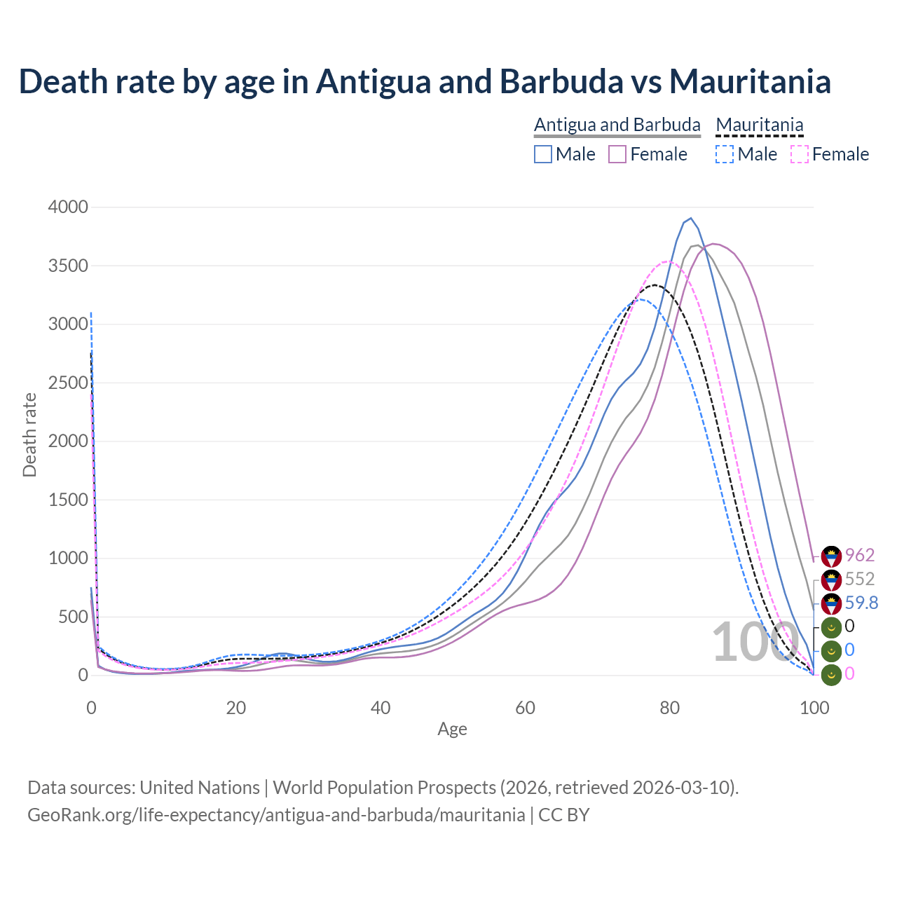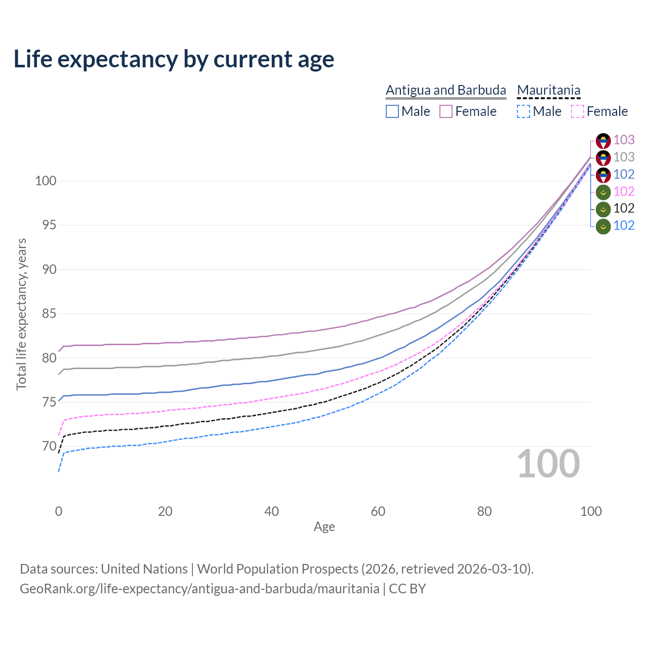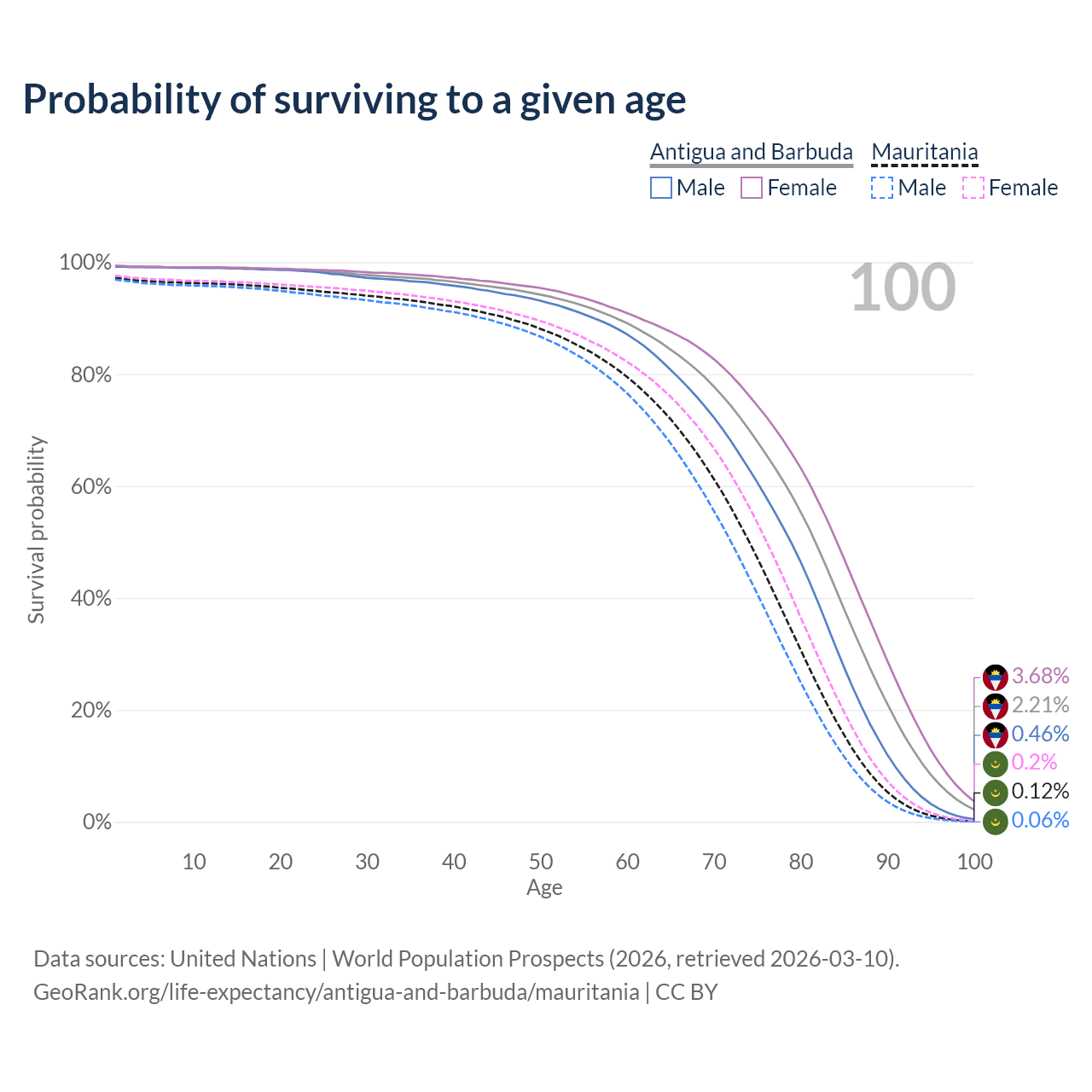 This life expectancy calculator shows the odds of living to 100, 95, 90, and below based on current age for both males and females in Antigua and Barbuda and Mauritania, along with mean and median age of death. The calculations are based on the 2026 life tables (actuarial tables) from the UN World Population Prospects.