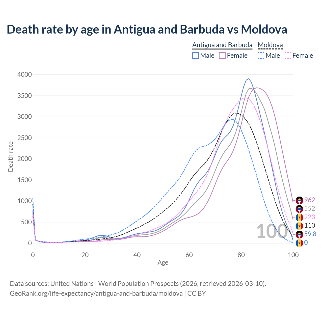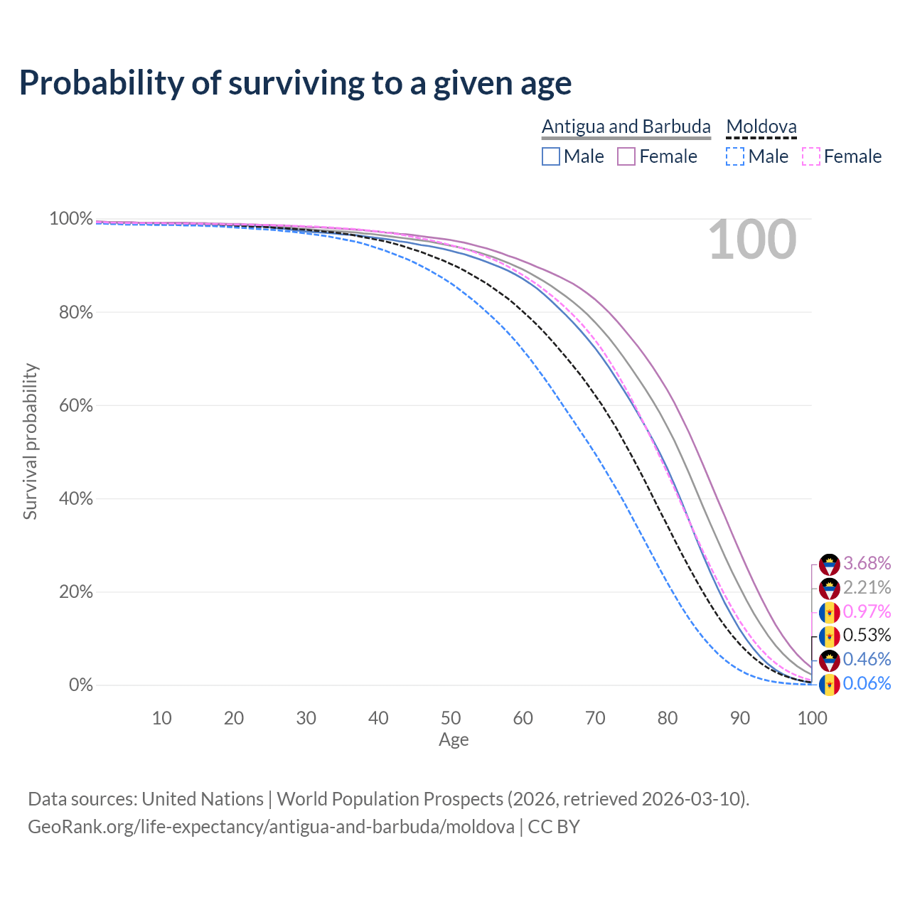 This life expectancy calculator shows the odds of living to 100, 95, 90, and below based on current age for both males and females in Antigua and Barbuda and Moldova, along with mean and median age of death. The calculations are based on the 2026 life tables (actuarial tables) from the UN World Population Prospects.