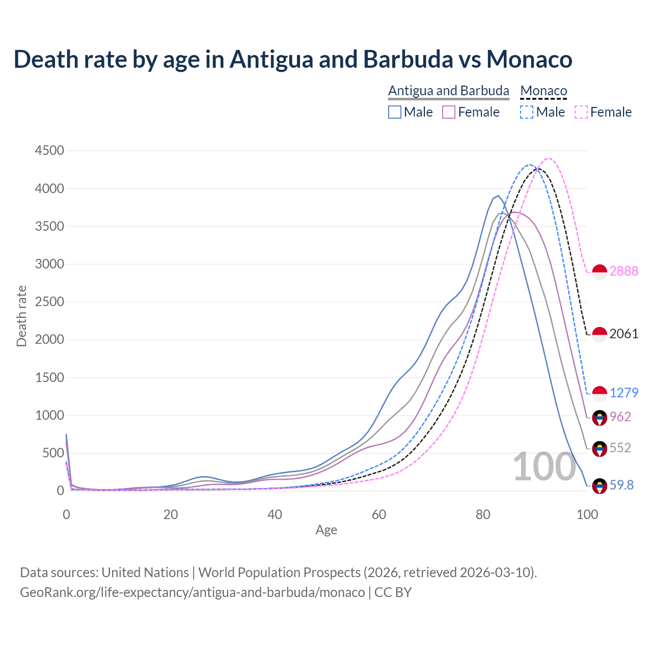 In Antigua and Barbuda, the most common age of death is 84, compared to 91 in Monaco. The median age of death is 81.7 in Antigua and Barbuda and 88.7 in Monaco, meaning only half of each cohort is expected to live past that age.