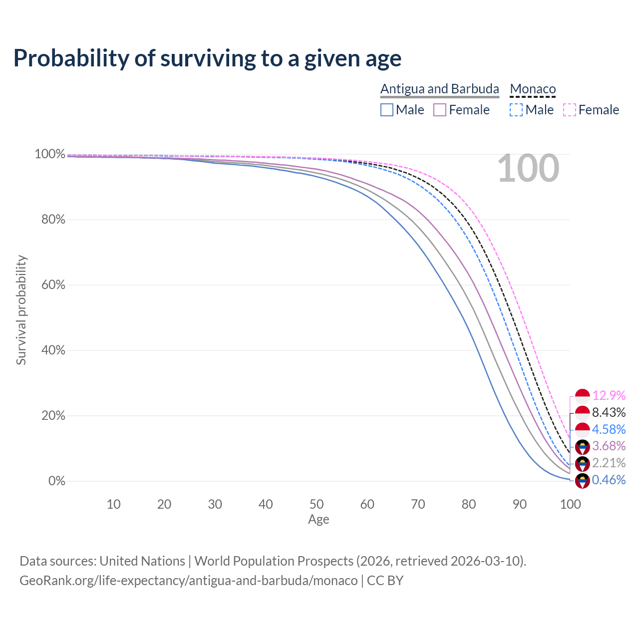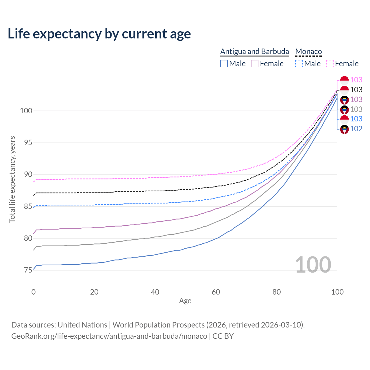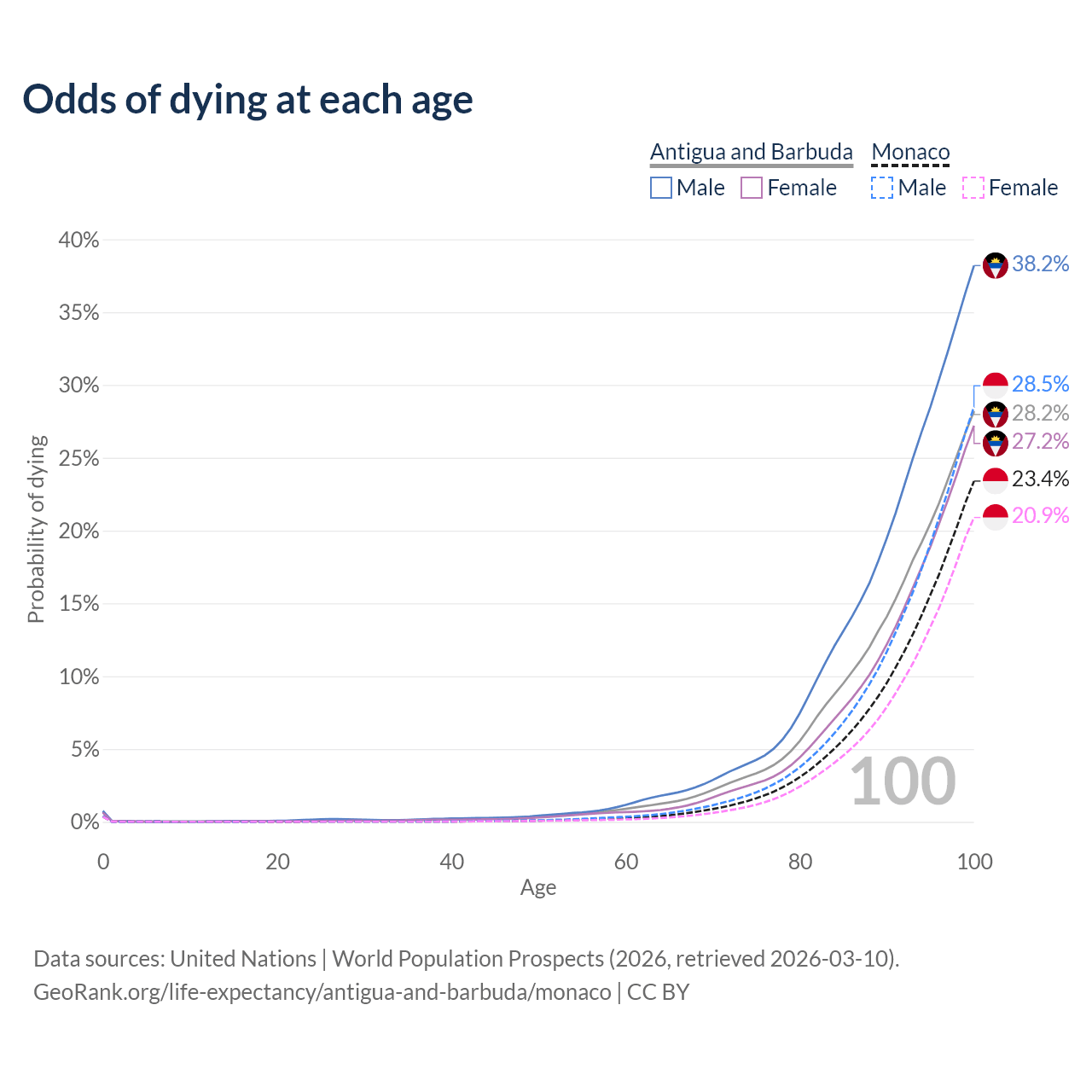 This life expectancy calculator shows the odds of living to 100, 95, 90, and below based on current age for both males and females in Antigua and Barbuda and Monaco, along with mean and median age of death. The calculations are based on the 2026 life tables (actuarial tables) from the UN World Population Prospects.