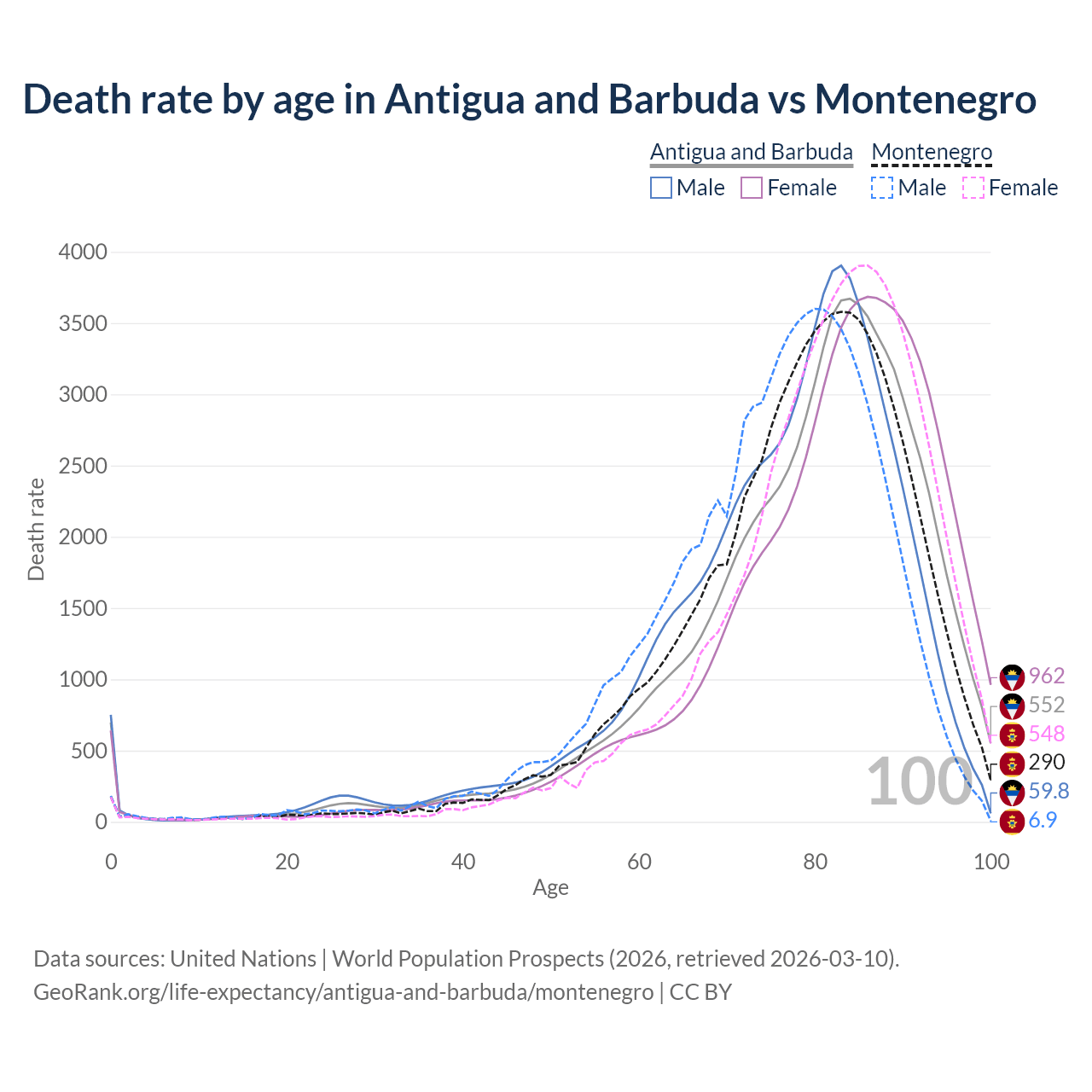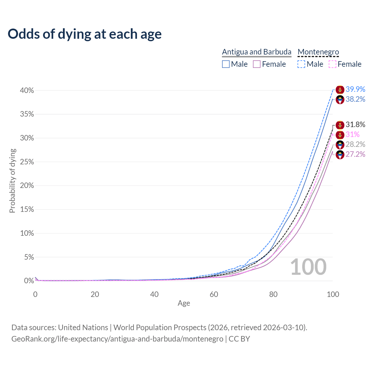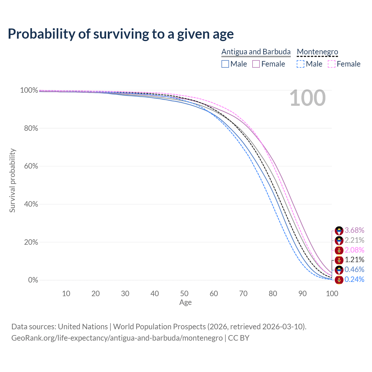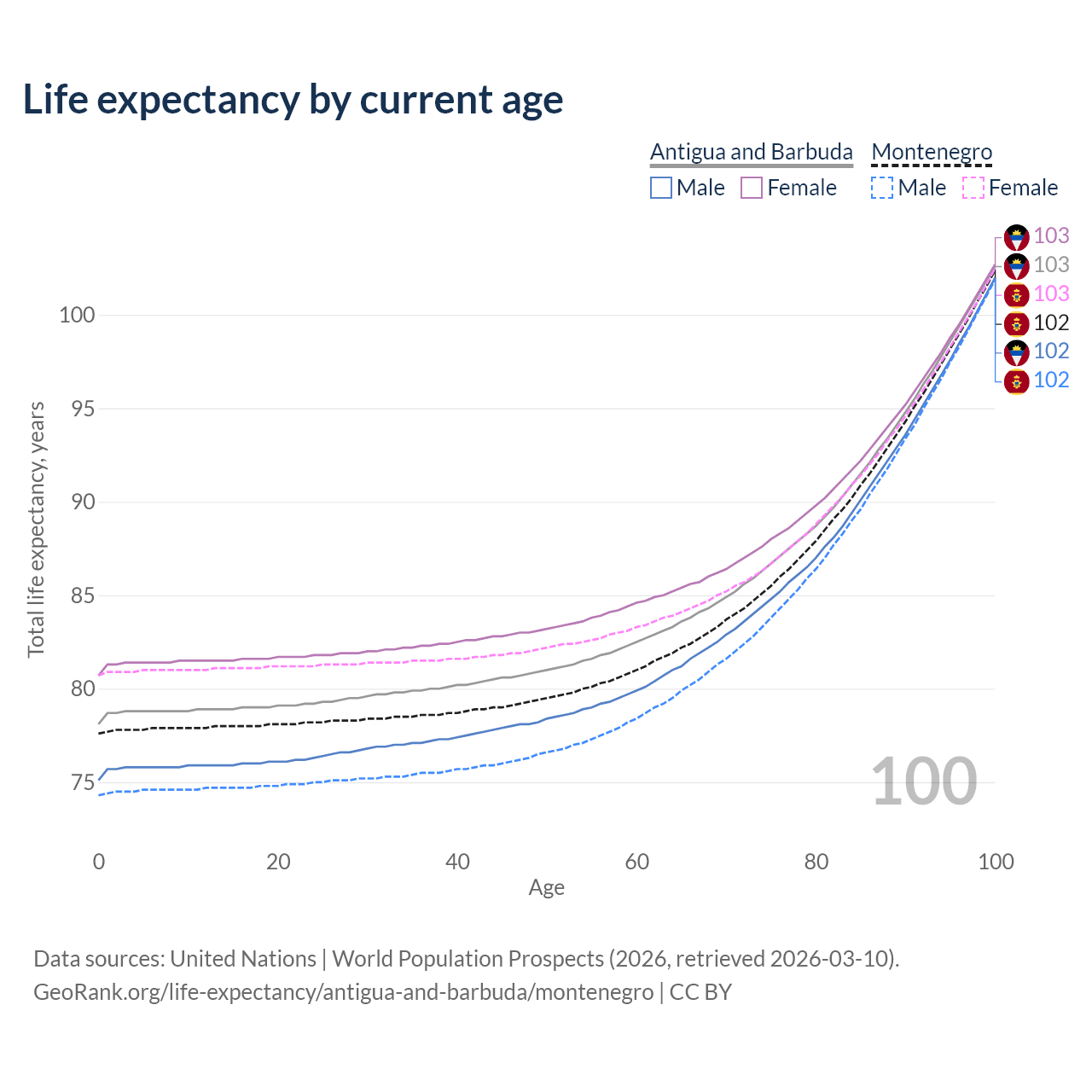 This life expectancy calculator shows the odds of living to 100, 95, 90, and below based on current age for both males and females in Antigua and Barbuda and Montenegro, along with mean and median age of death. The calculations are based on the 2026 life tables (actuarial tables) from the UN World Population Prospects.