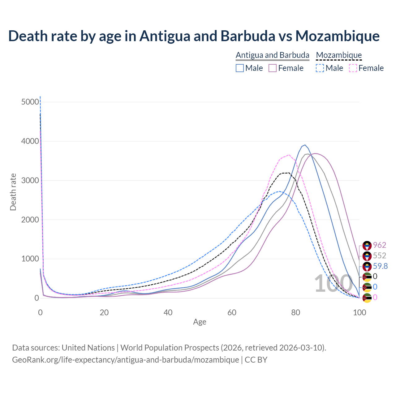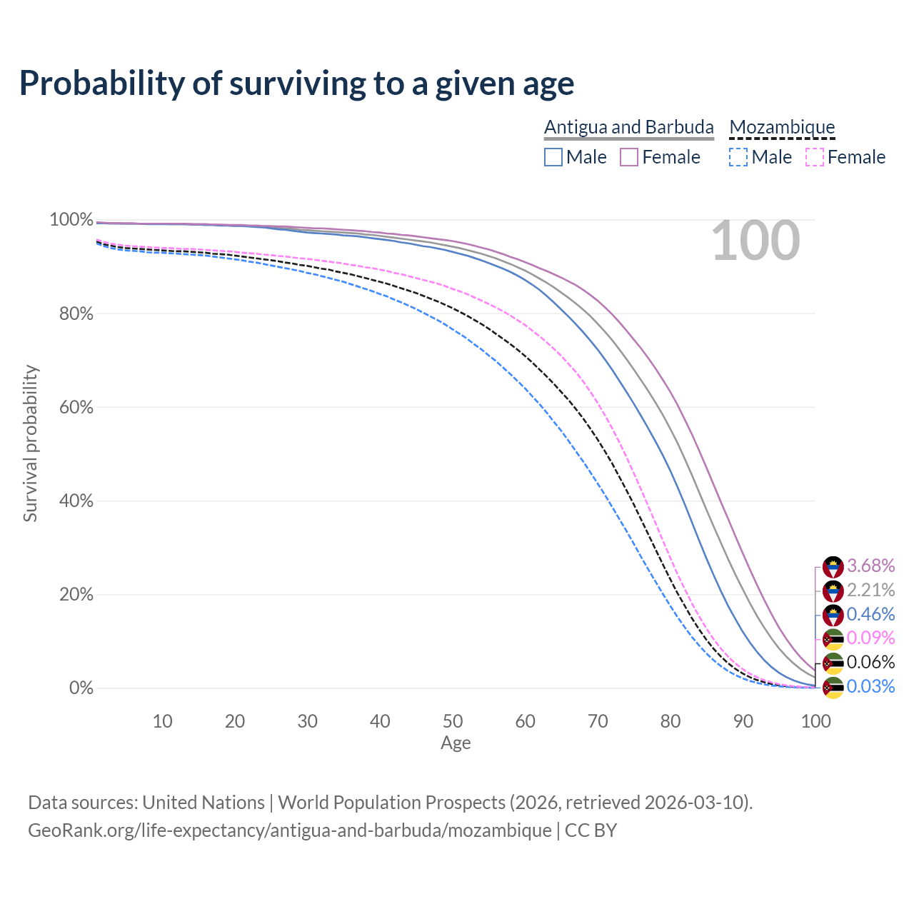 This life expectancy calculator shows the odds of living to 100, 95, 90, and below based on current age for both males and females in Antigua and Barbuda and Mozambique, along with mean and median age of death. The calculations are based on the 2026 life tables (actuarial tables) from the UN World Population Prospects.