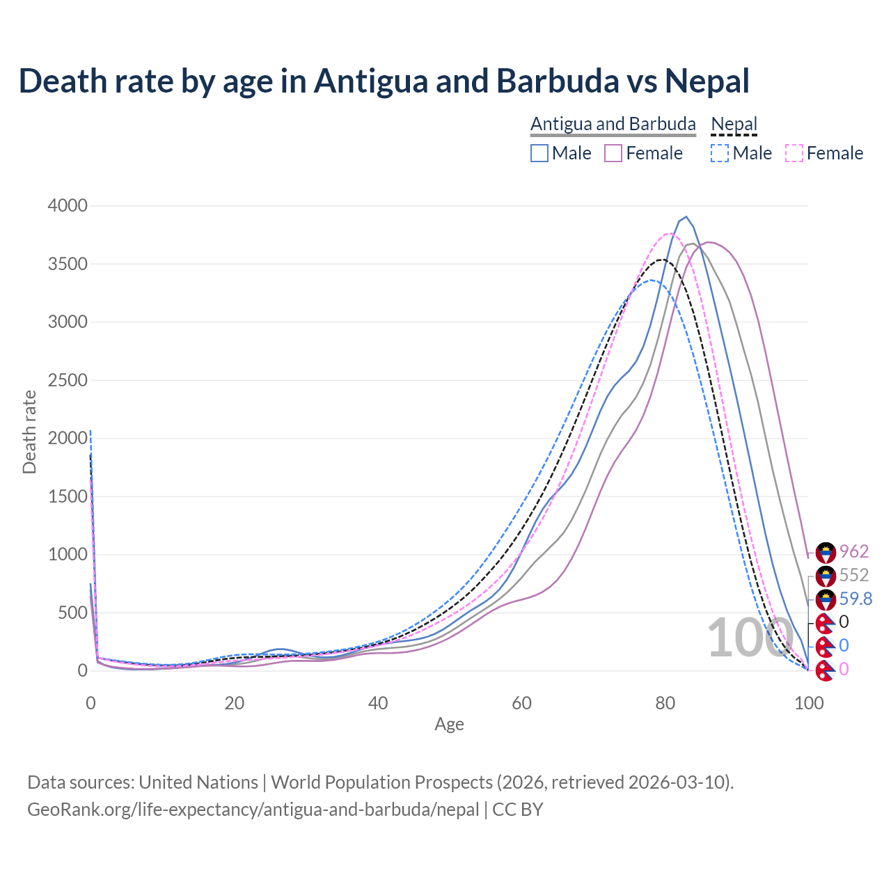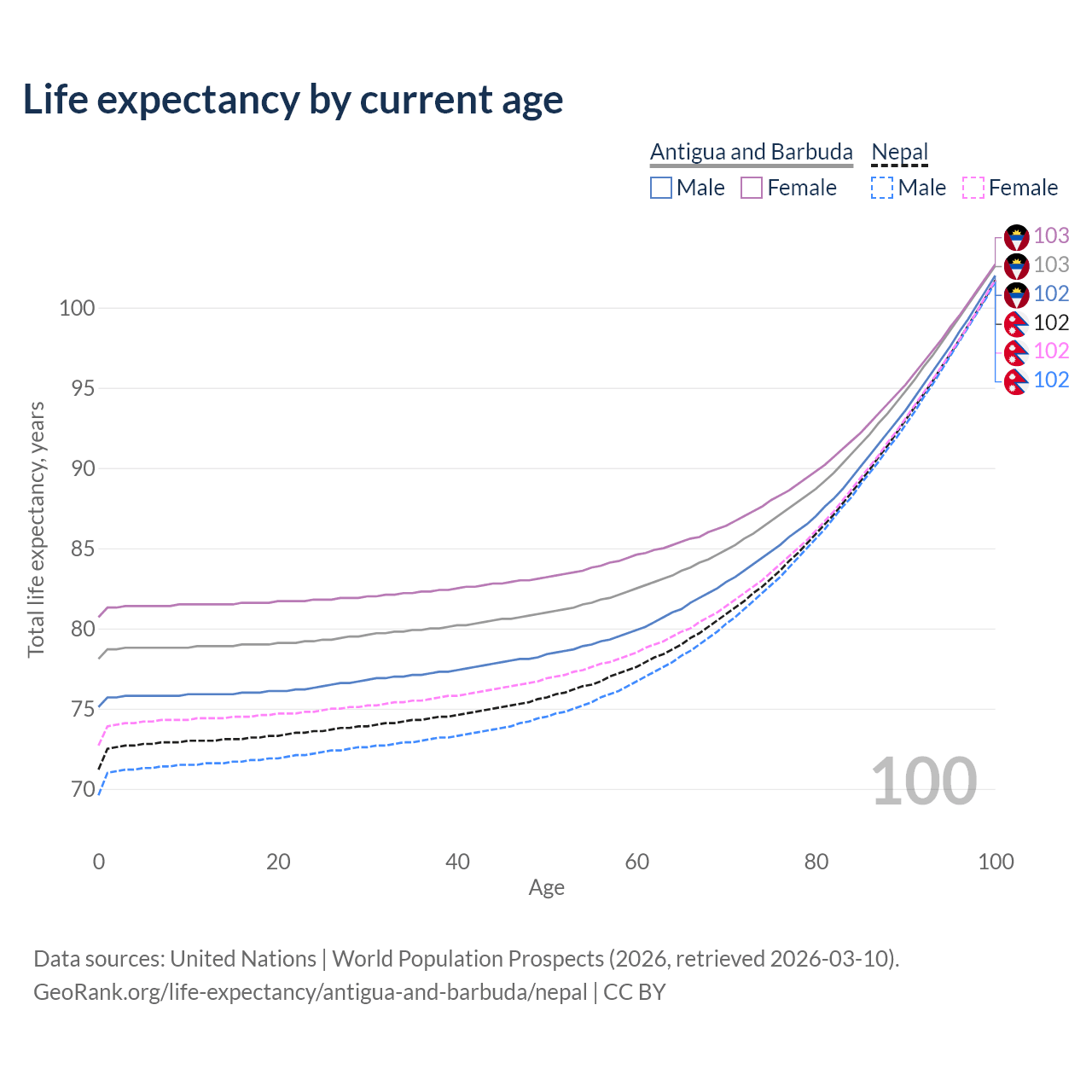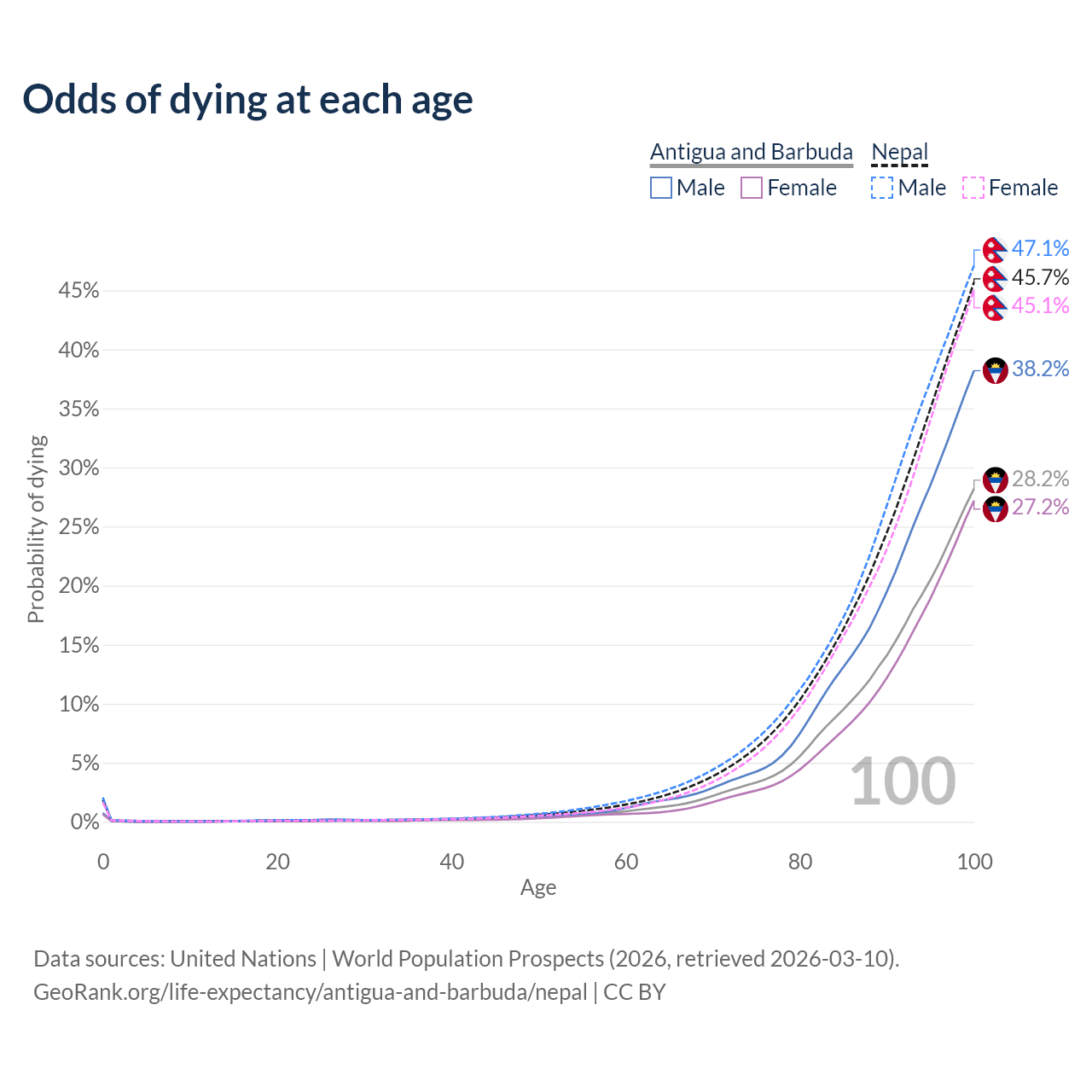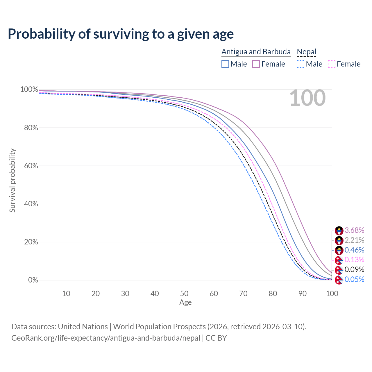 This life expectancy calculator shows the odds of living to 100, 95, 90, and below based on current age for both males and females in Antigua and Barbuda and Nepal, along with mean and median age of death. The calculations are based on the 2026 life tables (actuarial tables) from the UN World Population Prospects.