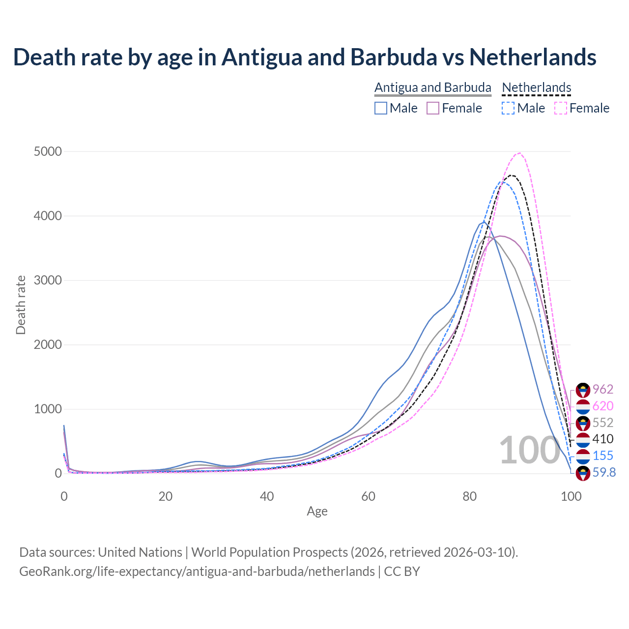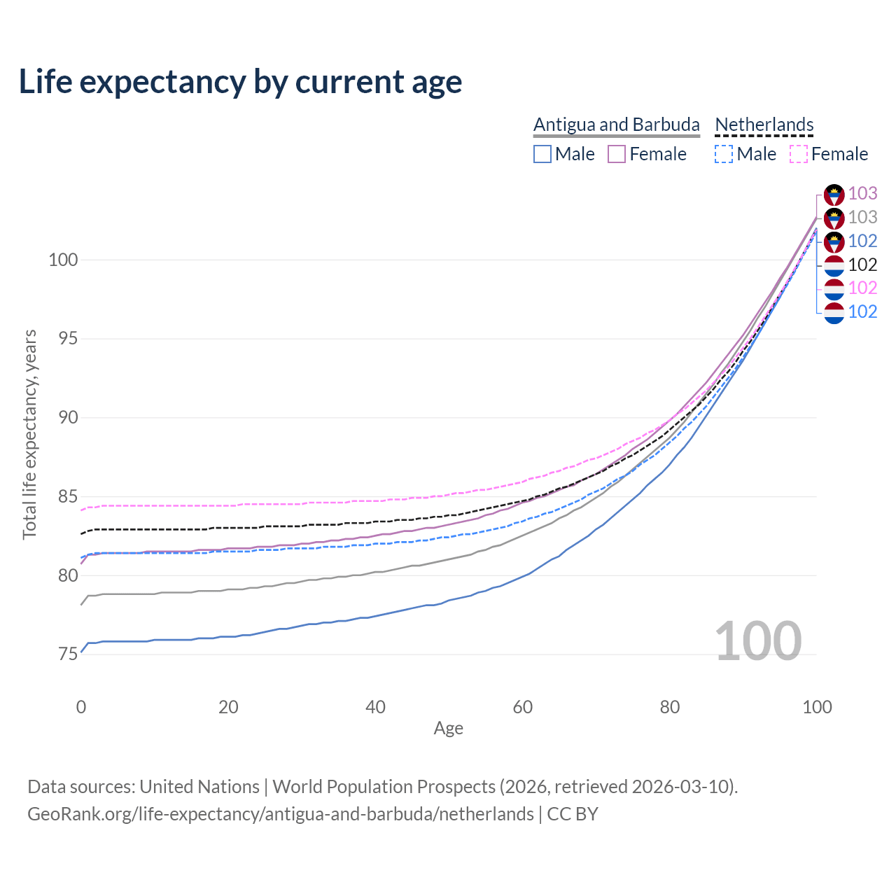 This life expectancy calculator shows the odds of living to 100, 95, 90, and below based on current age for both males and females in Antigua and Barbuda and the Netherlands, along with mean and median age of death. The calculations are based on the 2026 life tables (actuarial tables) from the UN World Population Prospects.