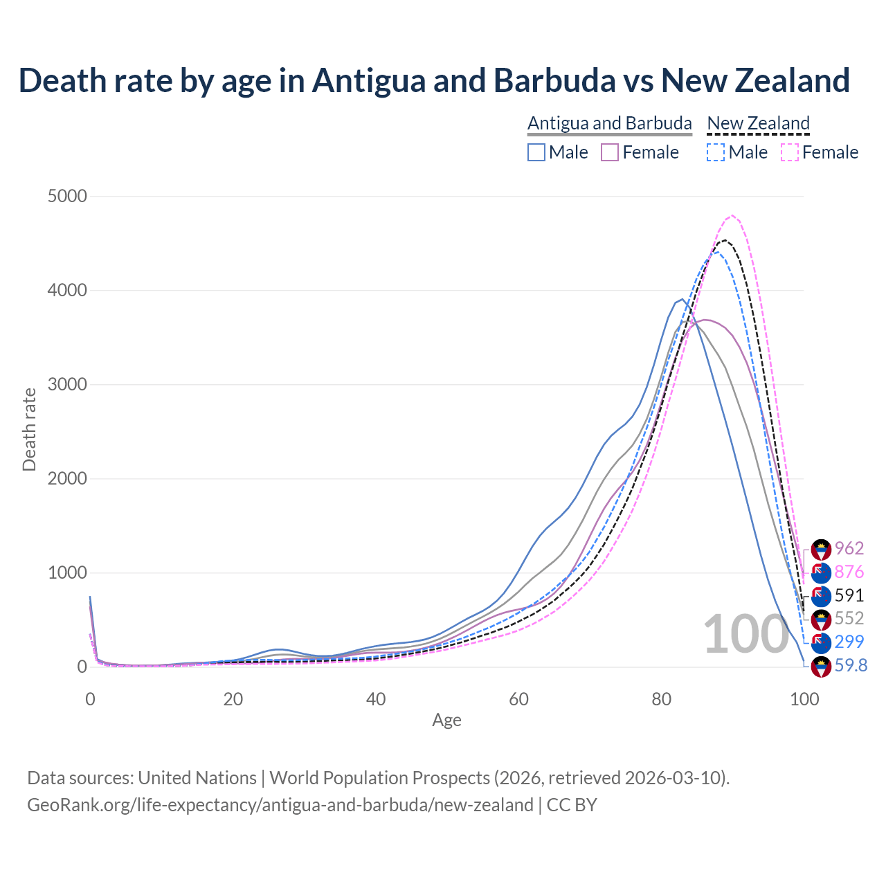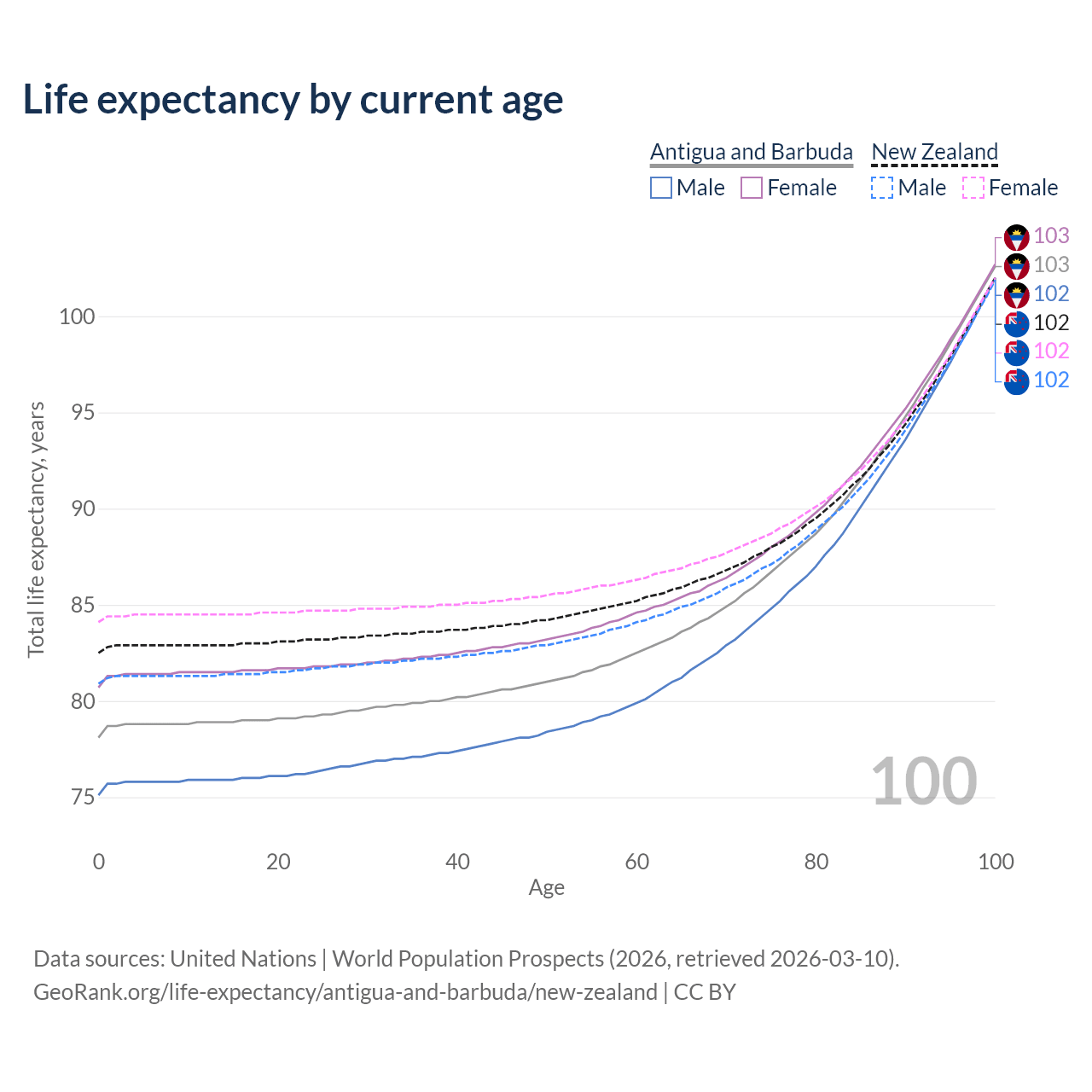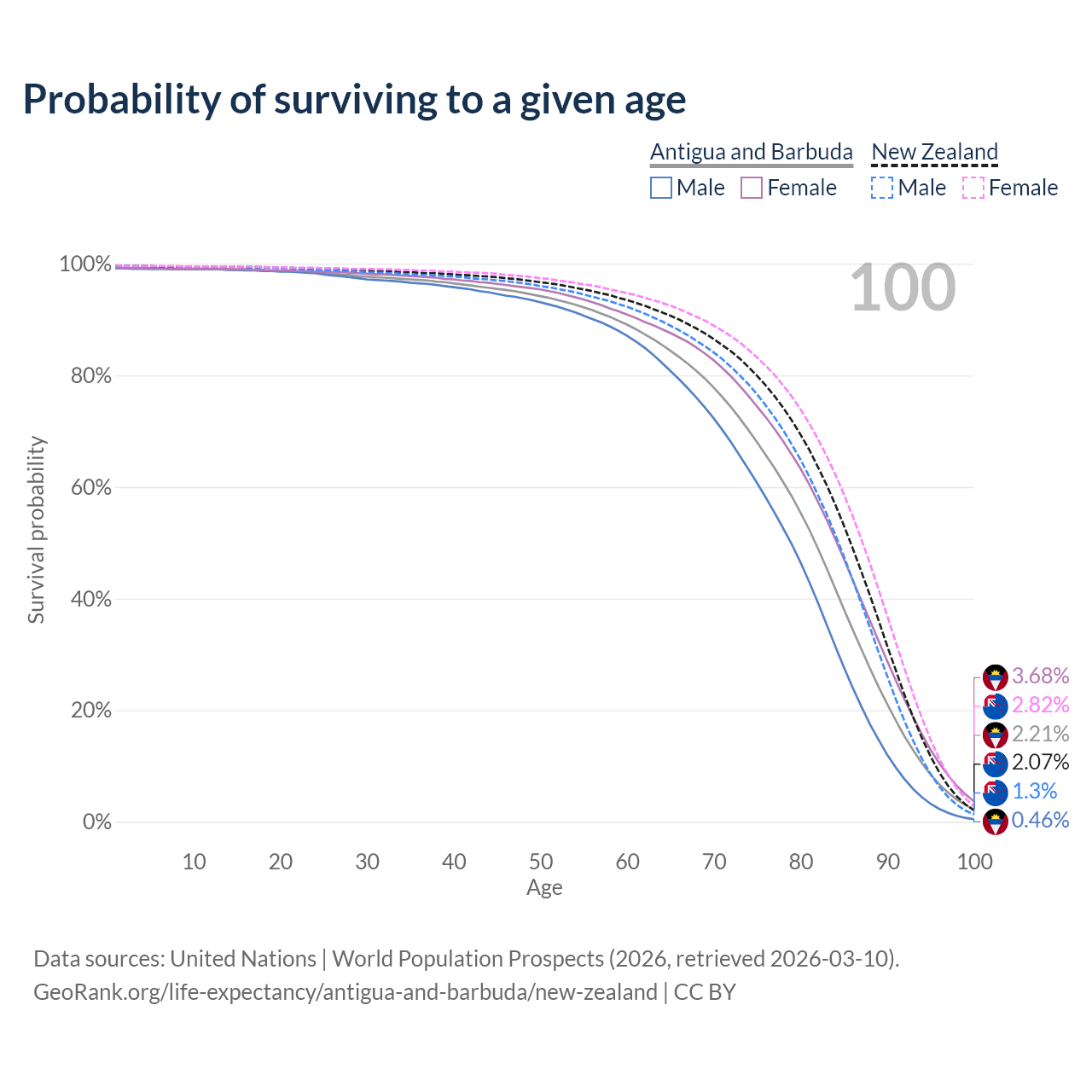 This life expectancy calculator shows the odds of living to 100, 95, 90, and below based on current age for both males and females in Antigua and Barbuda and New Zealand, along with mean and median age of death. The calculations are based on the 2026 life tables (actuarial tables) from the UN World Population Prospects.