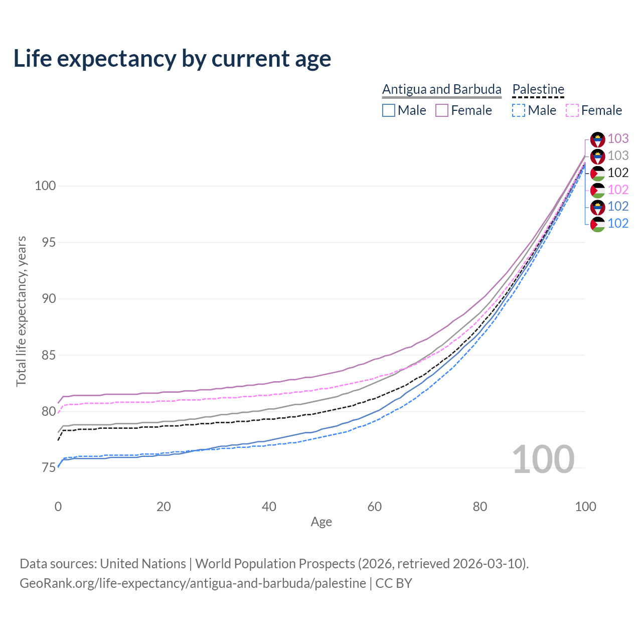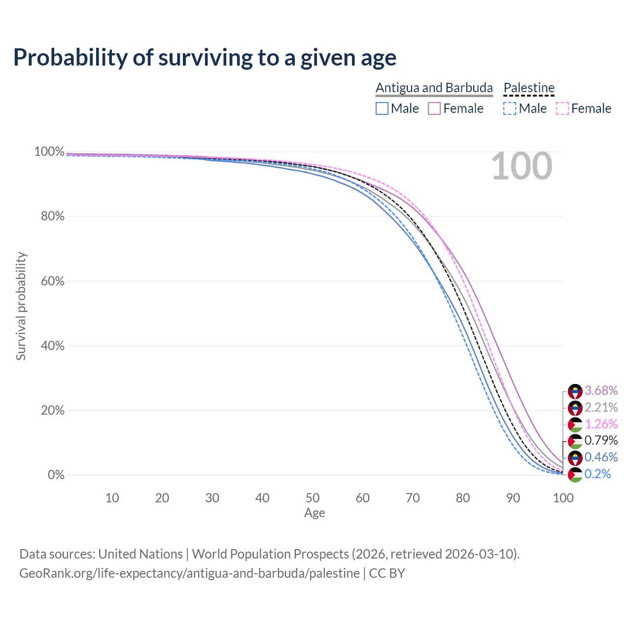 This life expectancy calculator shows the odds of living to 100, 95, 90, and below based on current age for both males and females in Antigua and Barbuda and Palestine, along with mean and median age of death. The calculations are based on the 2026 life tables (actuarial tables) from the UN World Population Prospects.
