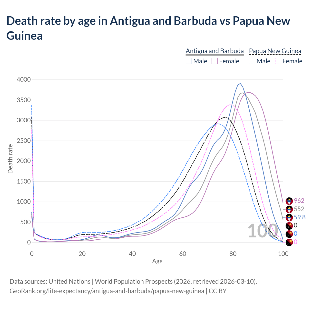 In Antigua and Barbuda, the most common age of death is 84, compared to 0 in Papua New Guinea. The median age of death is 81.7 in Antigua and Barbuda and 71.7 in Papua New Guinea, meaning only half of each cohort is expected to live past that age.