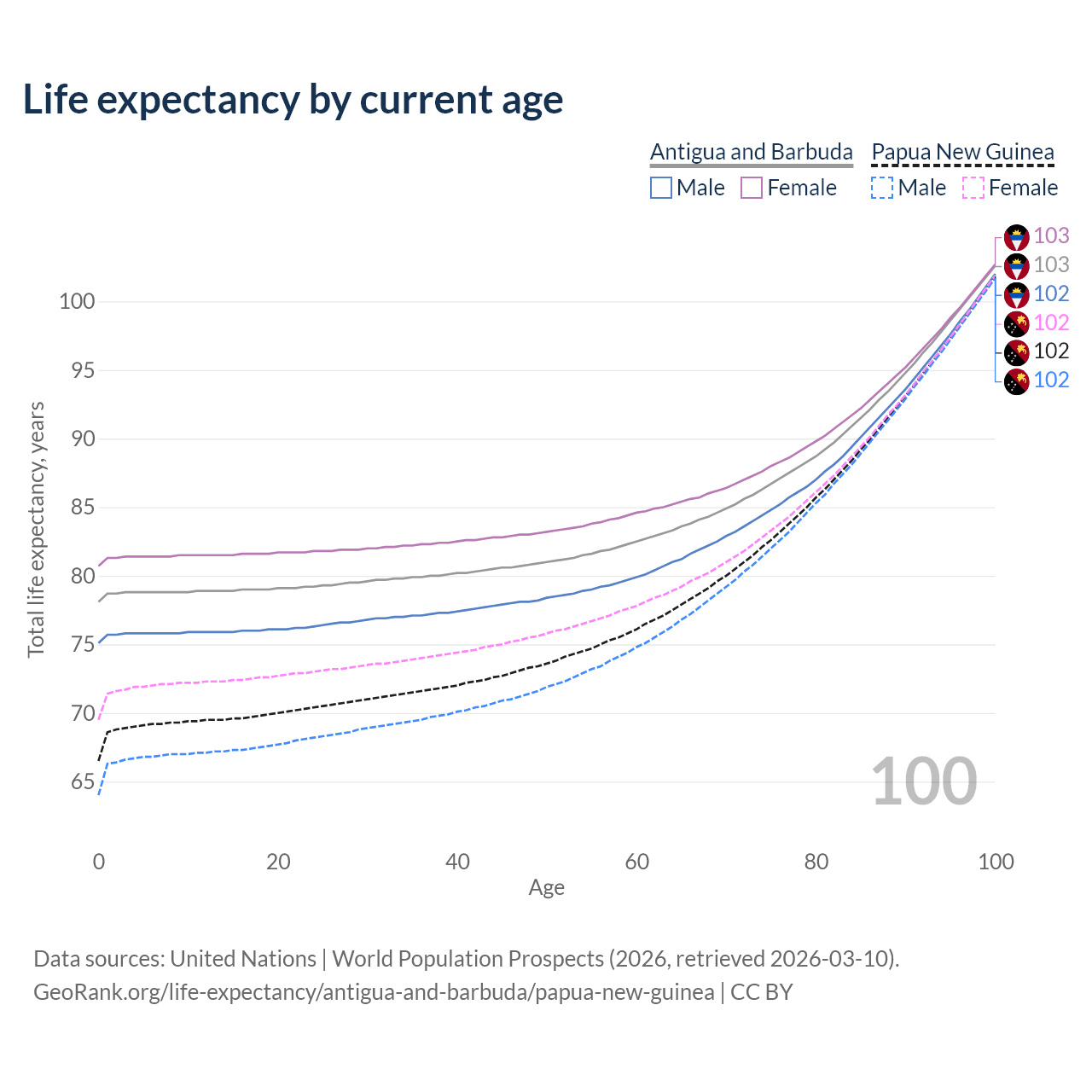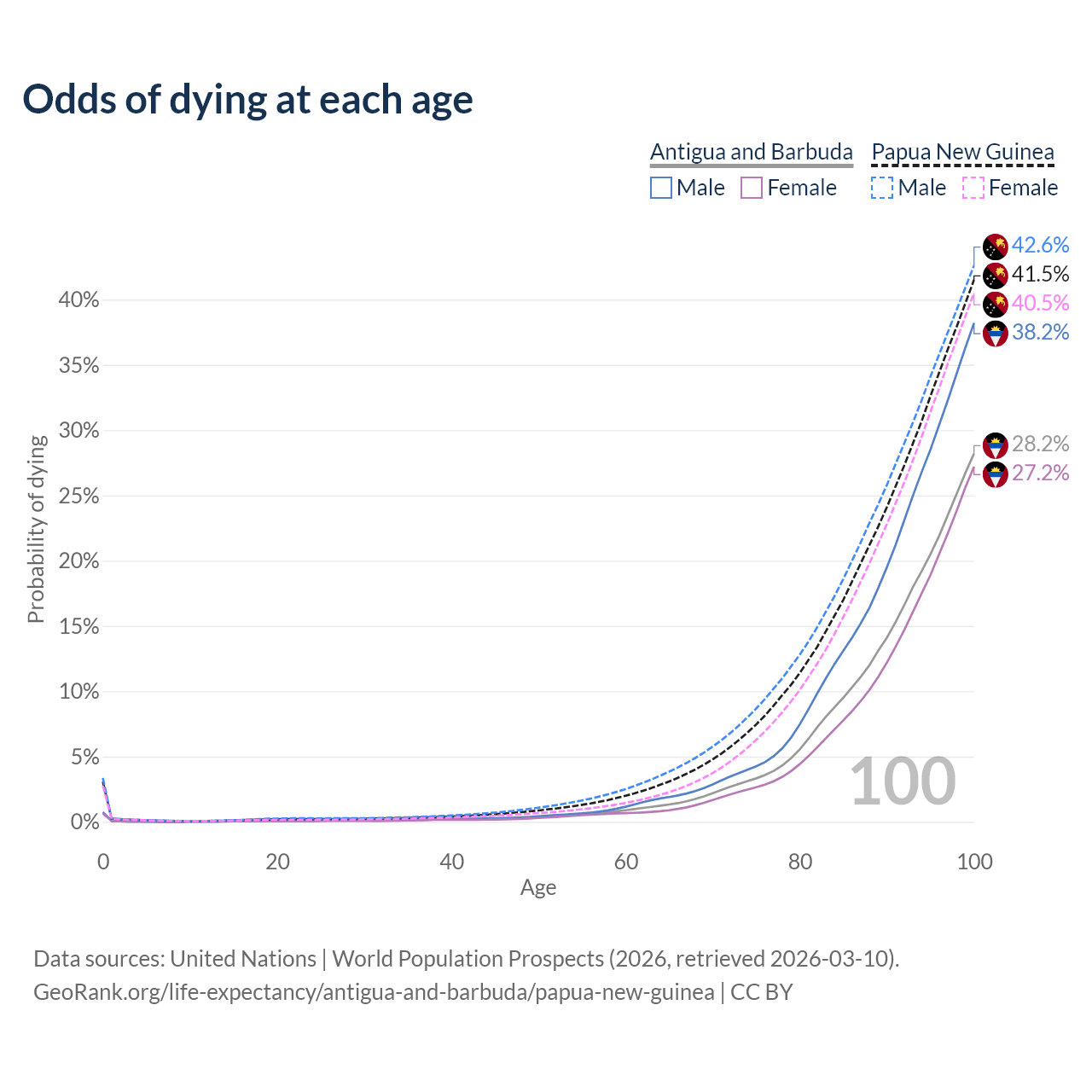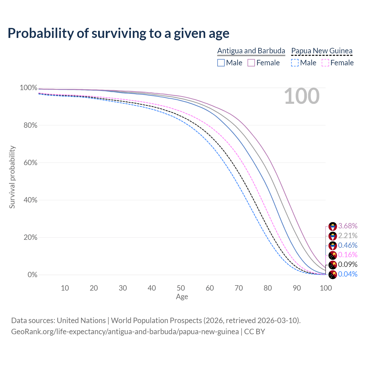 This life expectancy calculator shows the odds of living to 100, 95, 90, and below based on current age for both males and females in Antigua and Barbuda and Papua New Guinea, along with mean and median age of death. The calculations are based on the 2026 life tables (actuarial tables) from the UN World Population Prospects.