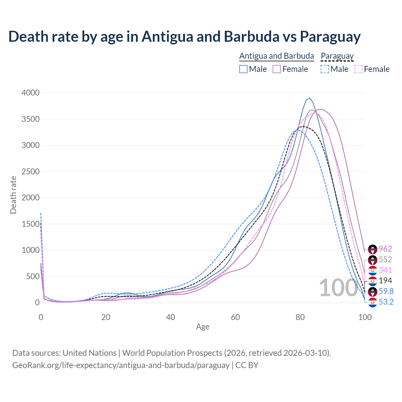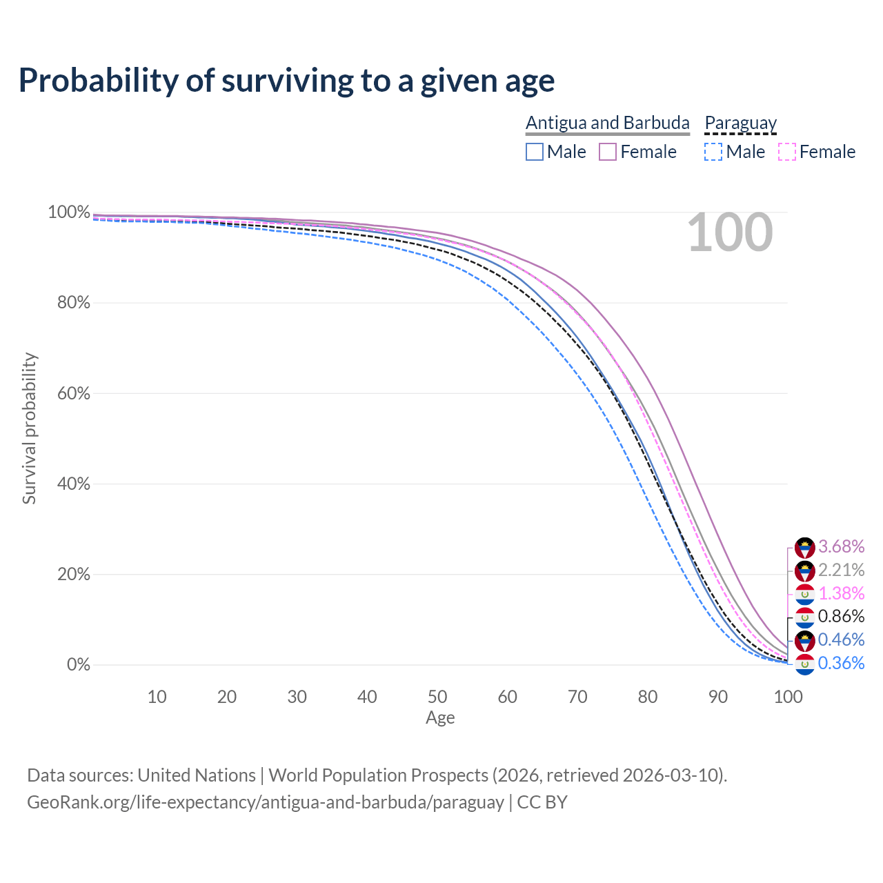 This life expectancy calculator shows the odds of living to 100, 95, 90, and below based on current age for both males and females in Antigua and Barbuda and Paraguay, along with mean and median age of death. The calculations are based on the 2026 life tables (actuarial tables) from the UN World Population Prospects.