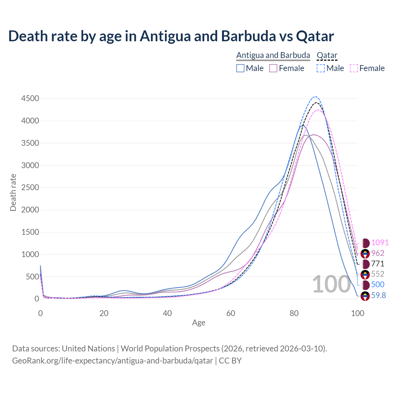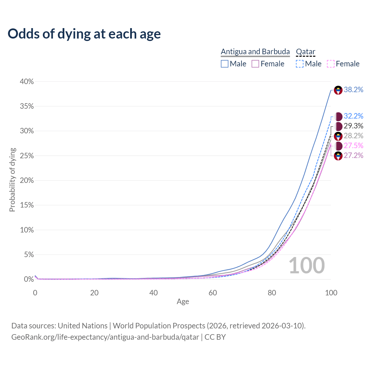 This life expectancy calculator shows the odds of living to 100, 95, 90, and below based on current age for both males and females in Antigua and Barbuda and Qatar, along with mean and median age of death. The calculations are based on the 2026 life tables (actuarial tables) from the UN World Population Prospects.