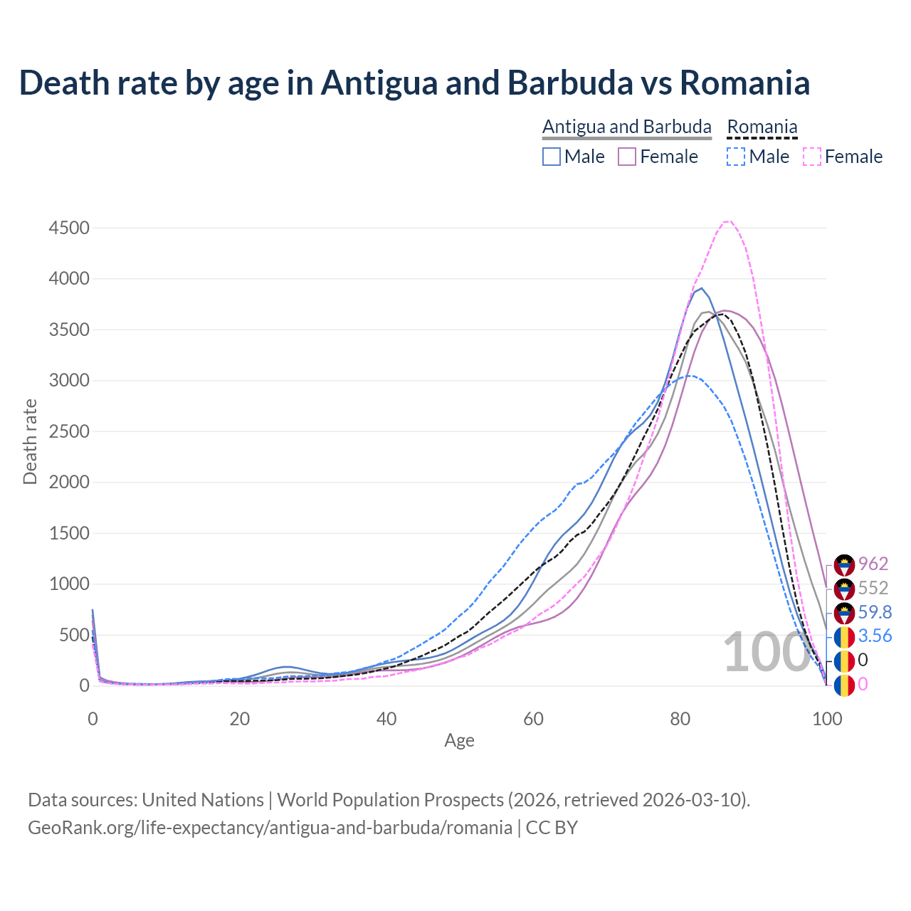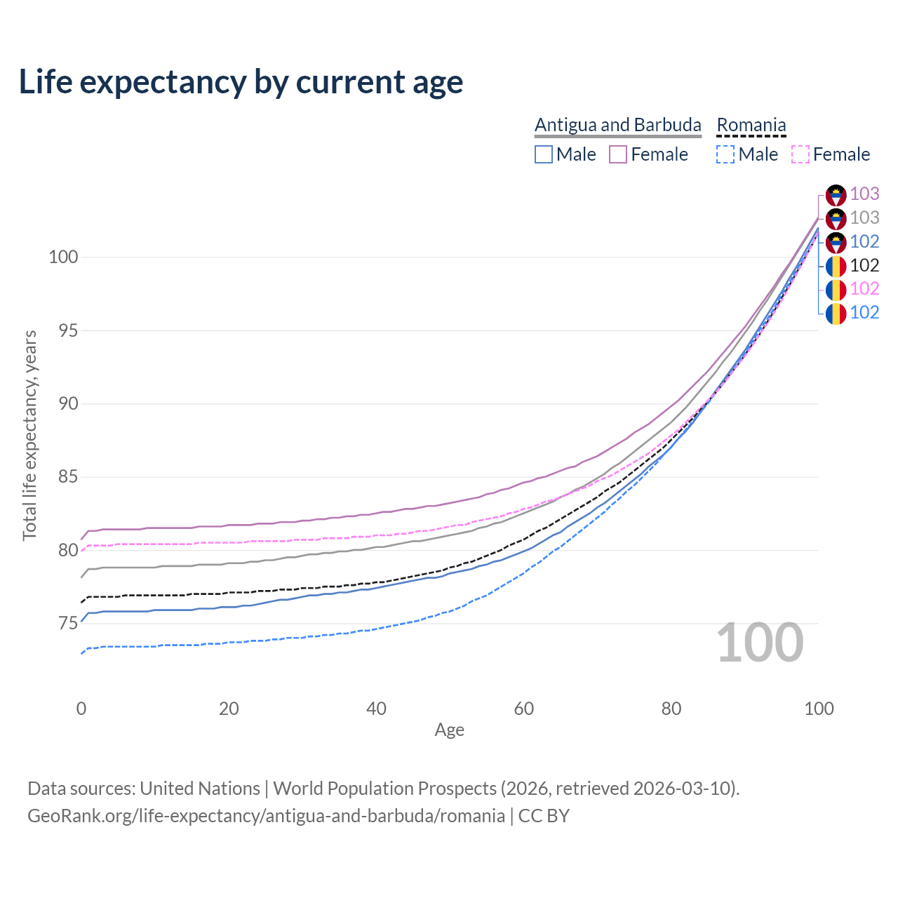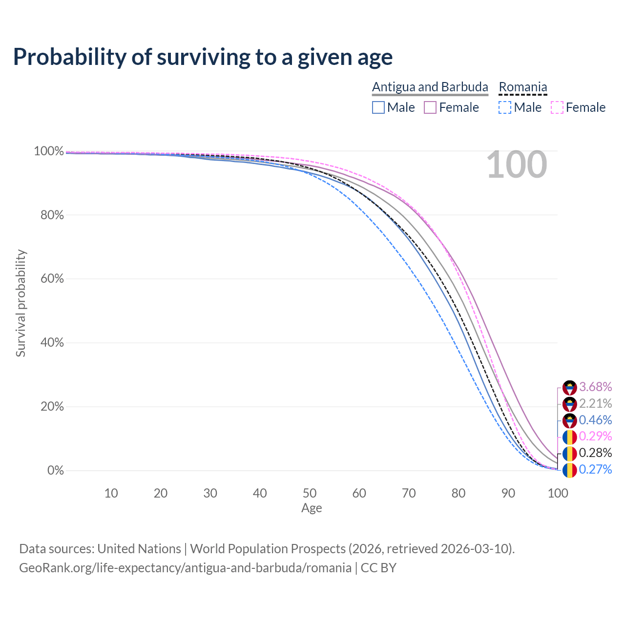 This life expectancy calculator shows the odds of living to 100, 95, 90, and below based on current age for both males and females in Antigua and Barbuda and Romania, along with mean and median age of death. The calculations are based on the 2026 life tables (actuarial tables) from the UN World Population Prospects.