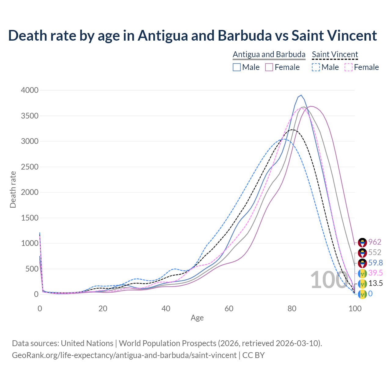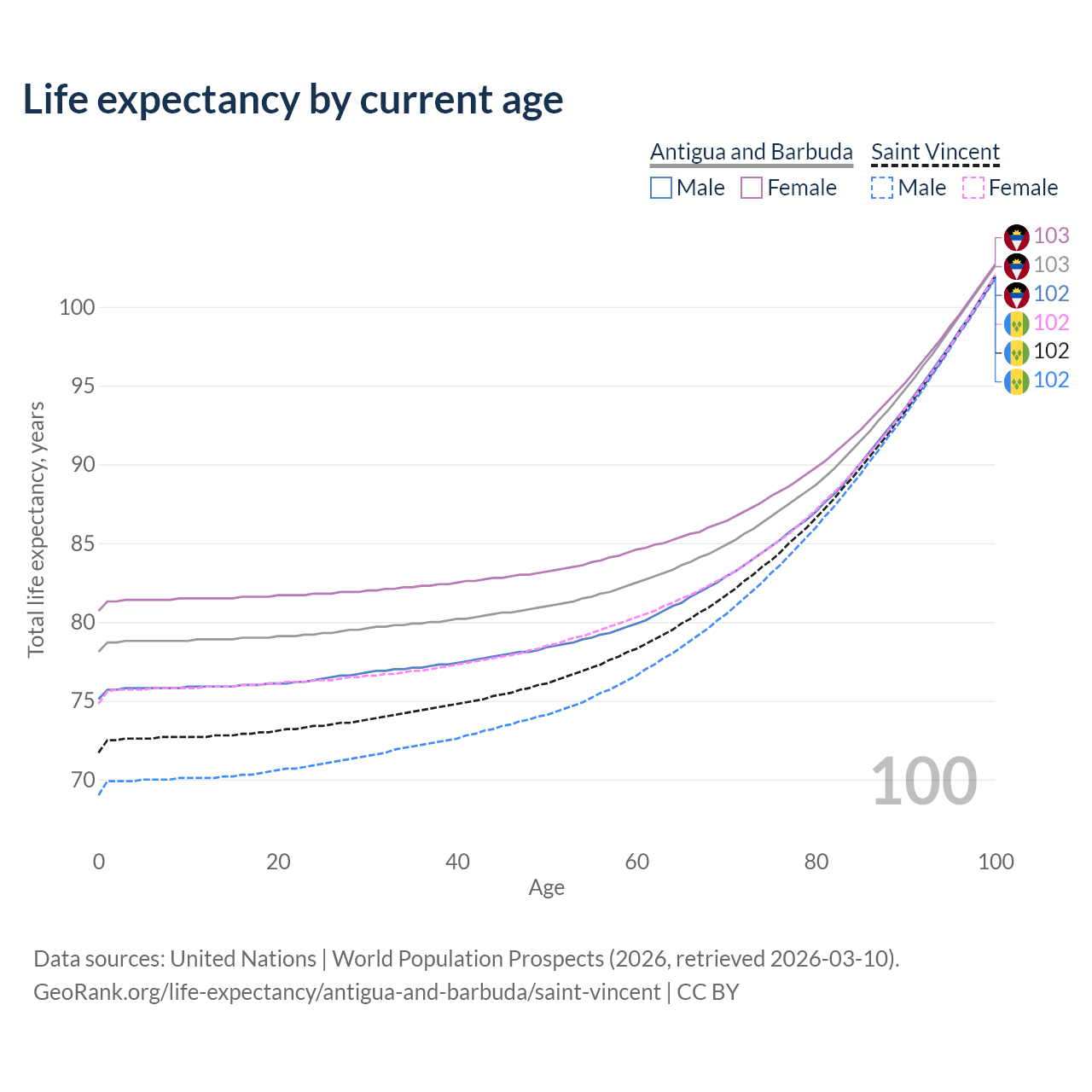 This life expectancy calculator shows the odds of living to 100, 95, 90, and below based on current age for both males and females in Antigua and Barbuda and Saint Vincent, along with mean and median age of death. The calculations are based on the 2026 life tables (actuarial tables) from the UN World Population Prospects.