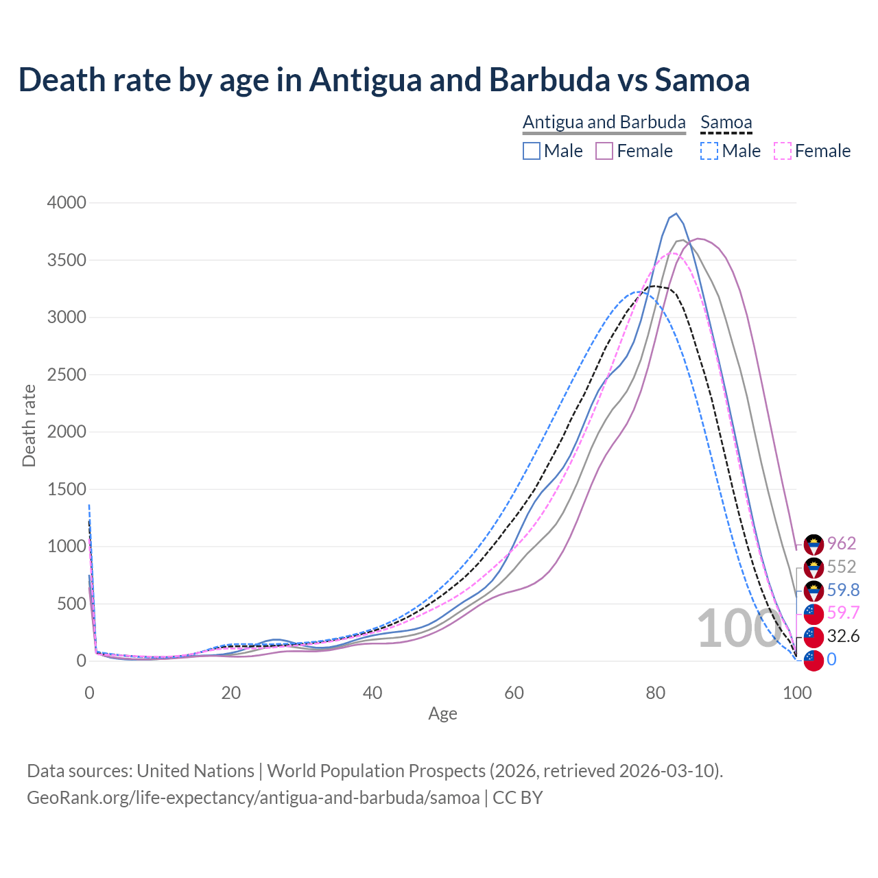 In Antigua and Barbuda, the most common age of death is 84, compared to 80 in Samoa. The median age of death is 81.7 in Antigua and Barbuda and 75.9 in Samoa, meaning only half of each cohort is expected to live past that age.