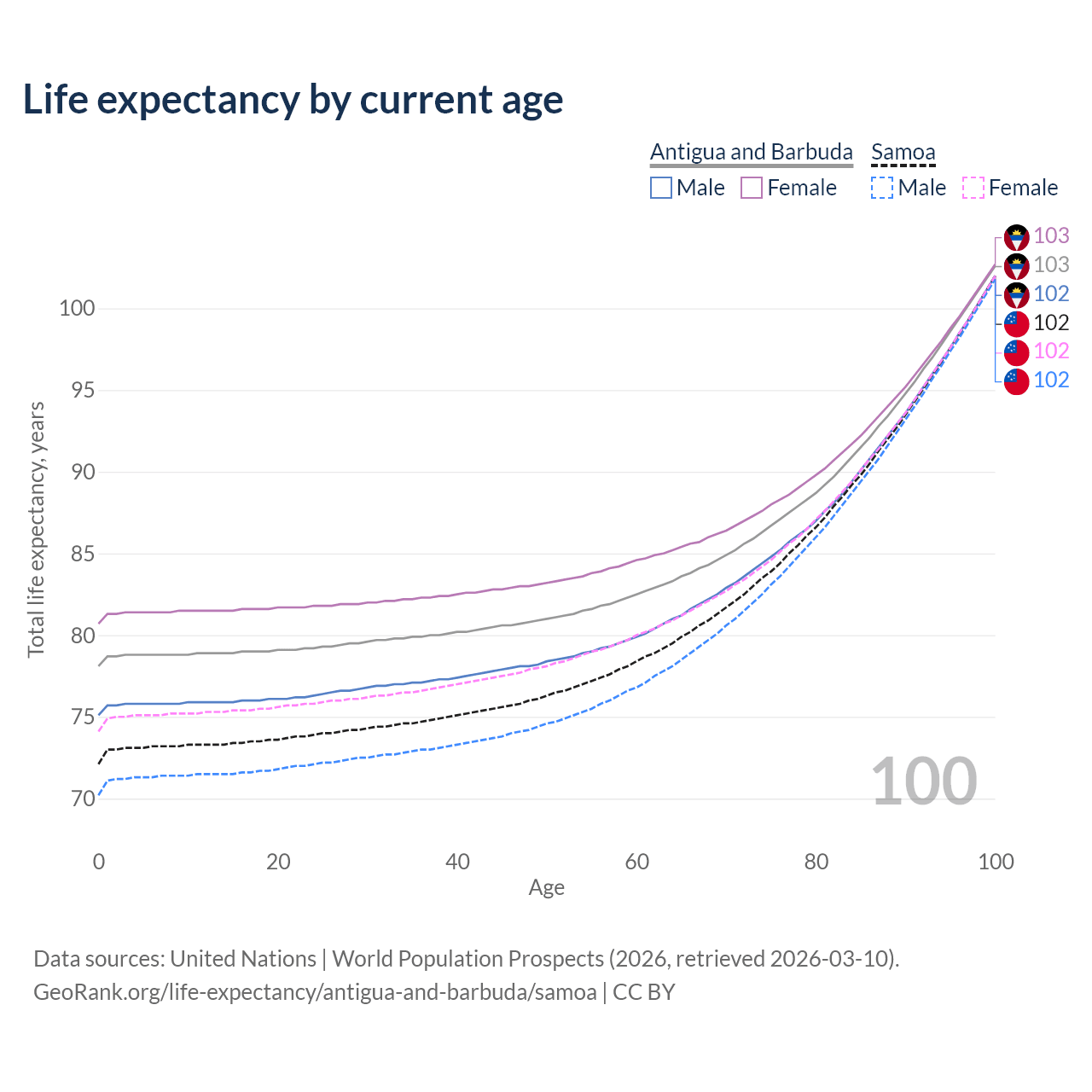 This life expectancy calculator shows the odds of living to 100, 95, 90, and below based on current age for both males and females in Antigua and Barbuda and Samoa, along with mean and median age of death. The calculations are based on the 2026 life tables (actuarial tables) from the UN World Population Prospects.