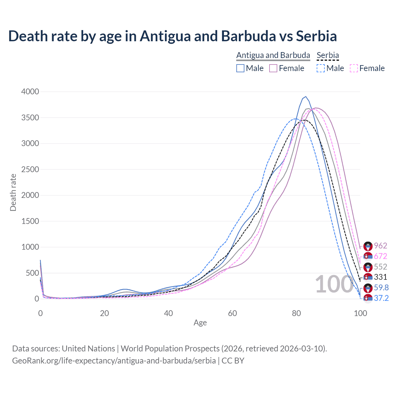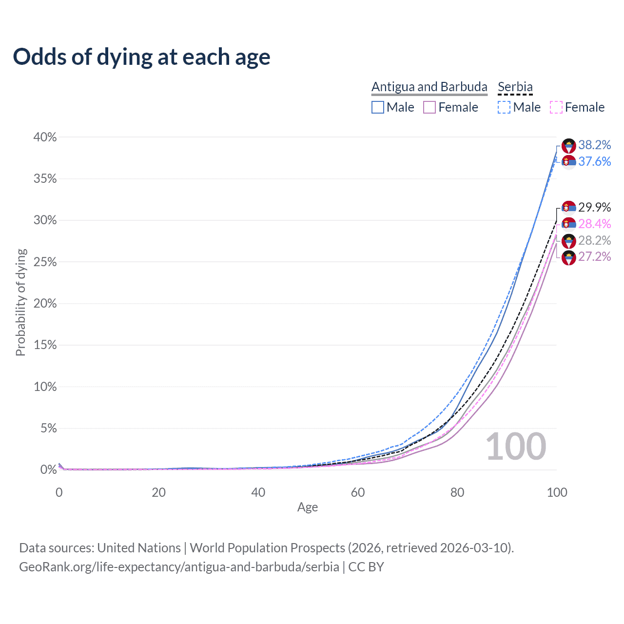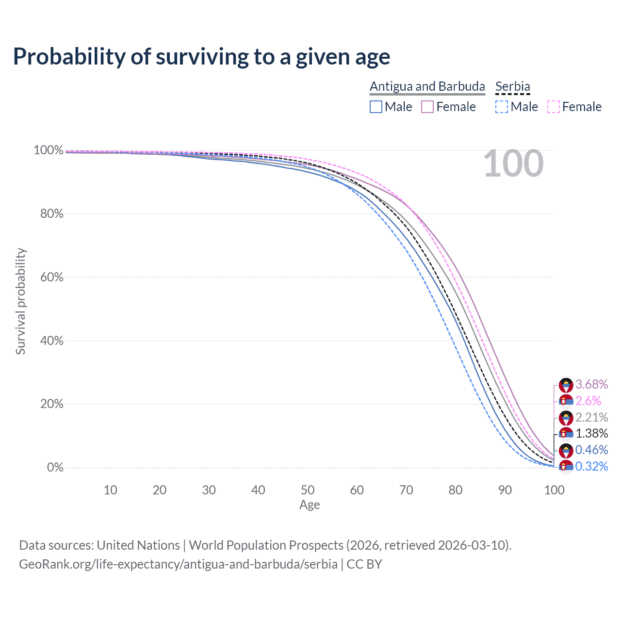 This life expectancy calculator shows the odds of living to 100, 95, 90, and below based on current age for both males and females in Antigua and Barbuda and Serbia, along with mean and median age of death. The calculations are based on the 2026 life tables (actuarial tables) from the UN World Population Prospects.