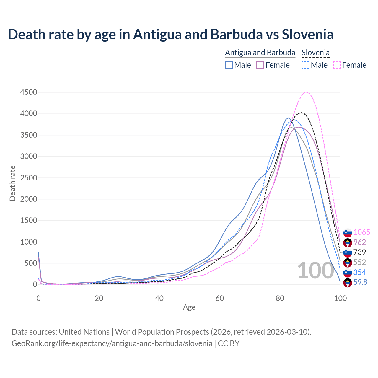 This life expectancy calculator shows the odds of living to 100, 95, 90, and below based on current age for both males and females in Antigua and Barbuda and Slovenia, along with mean and median age of death. The calculations are based on the 2026 life tables (actuarial tables) from the UN World Population Prospects.