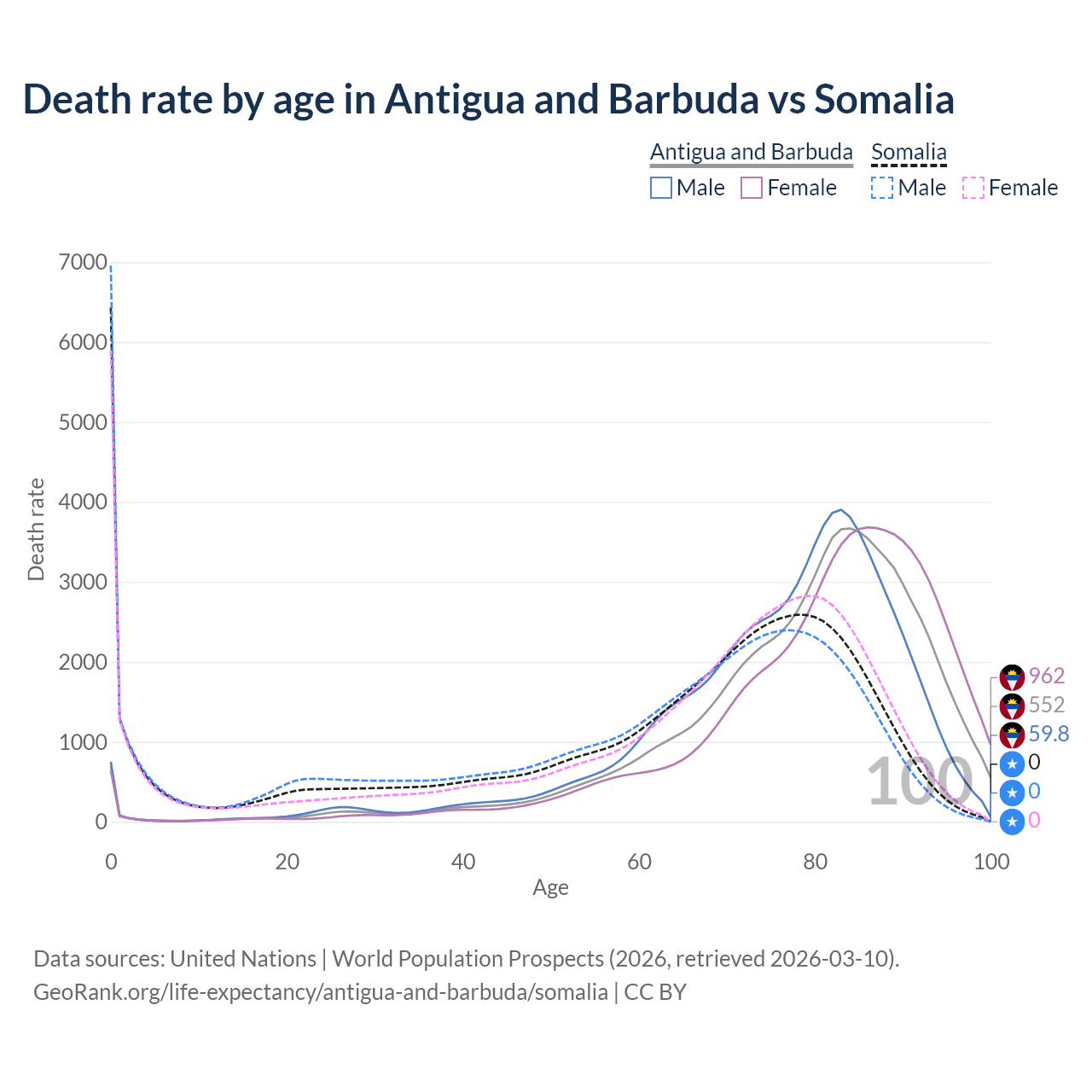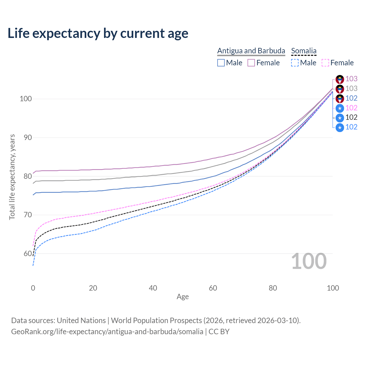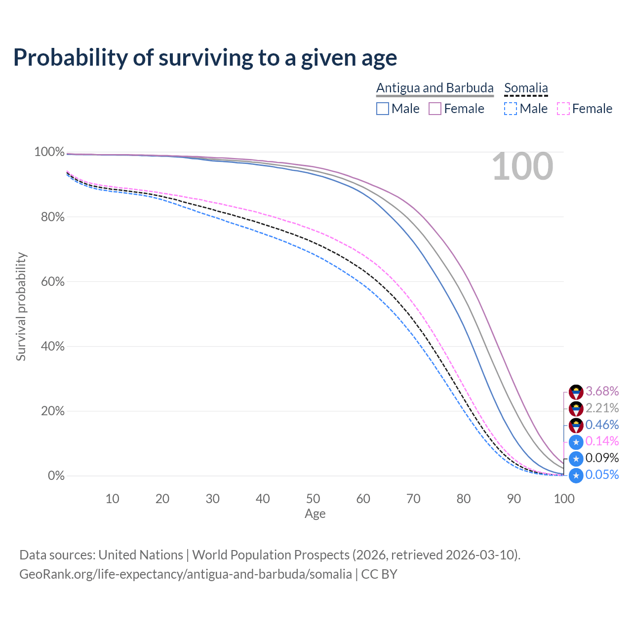 This life expectancy calculator shows the odds of living to 100, 95, 90, and below based on current age for both males and females in Antigua and Barbuda and Somalia, along with mean and median age of death. The calculations are based on the 2026 life tables (actuarial tables) from the UN World Population Prospects.