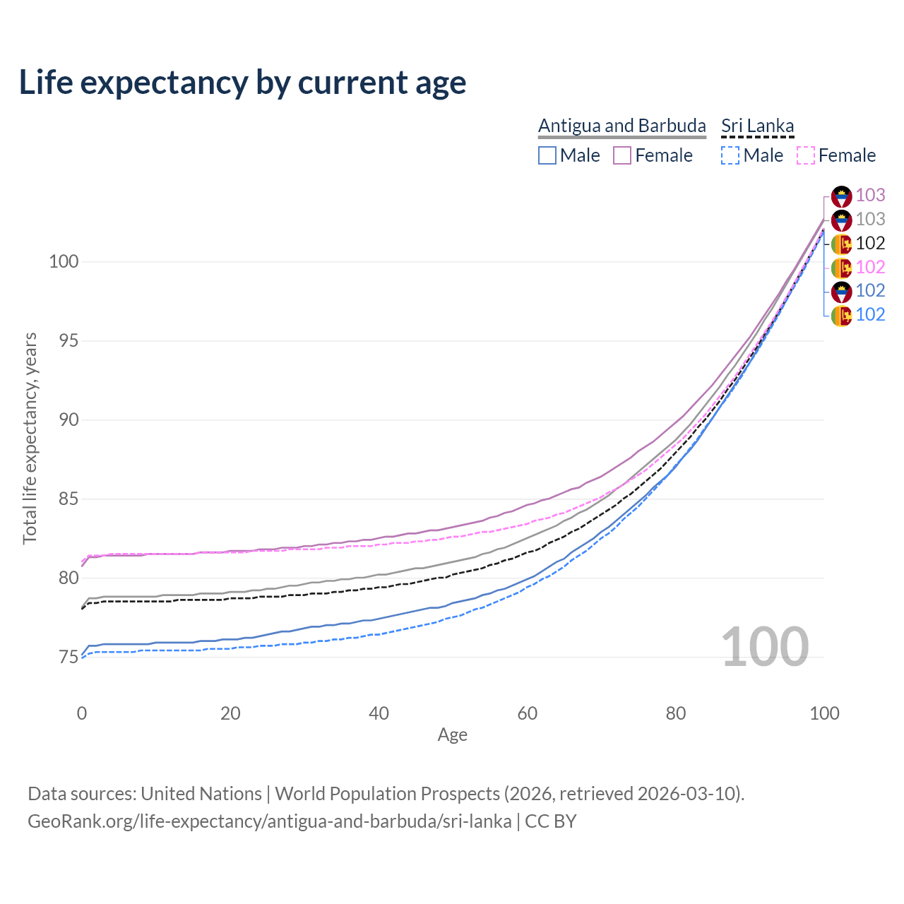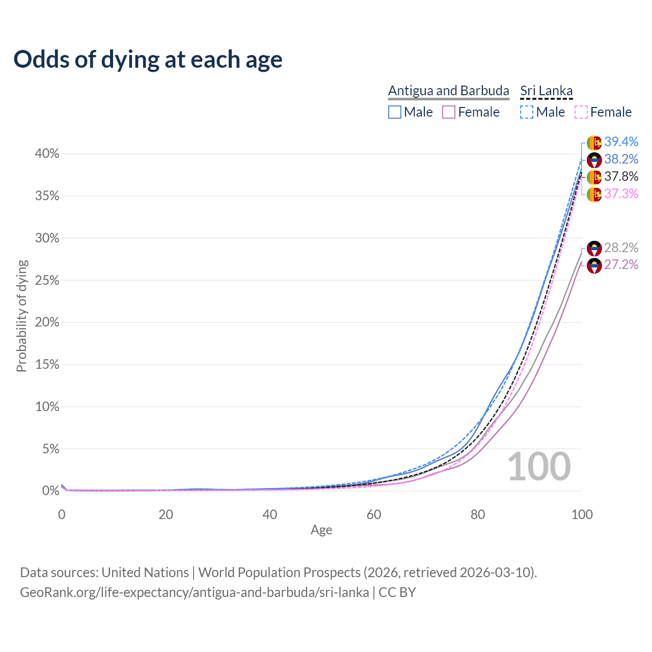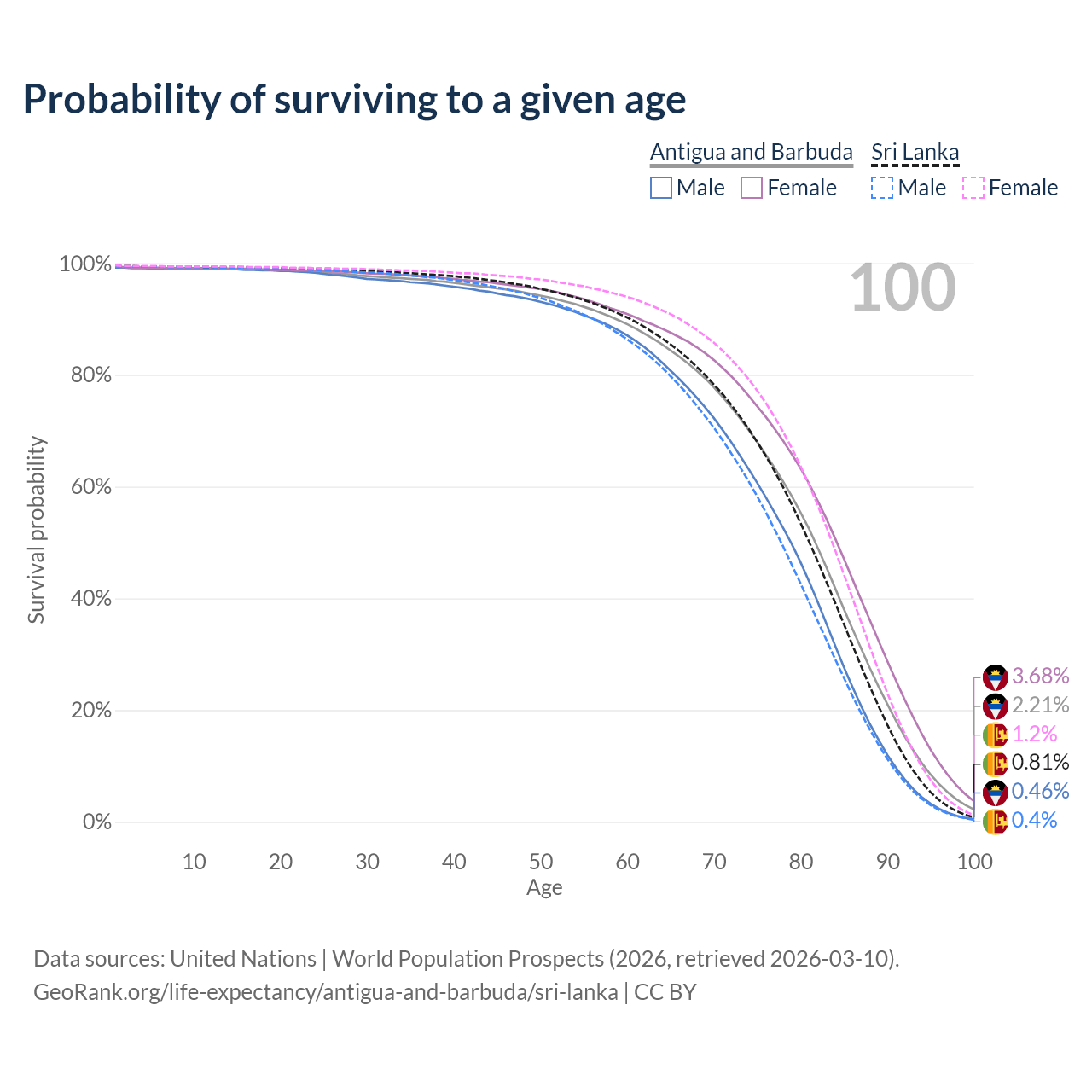 This life expectancy calculator shows the odds of living to 100, 95, 90, and below based on current age for both males and females in Antigua and Barbuda and Sri Lanka, along with mean and median age of death. The calculations are based on the 2026 life tables (actuarial tables) from the UN World Population Prospects.