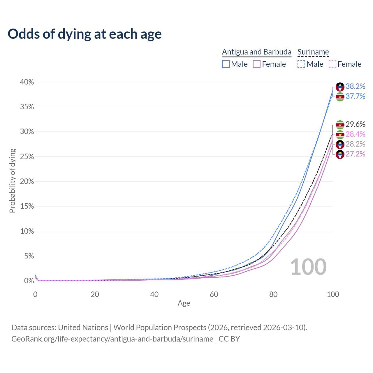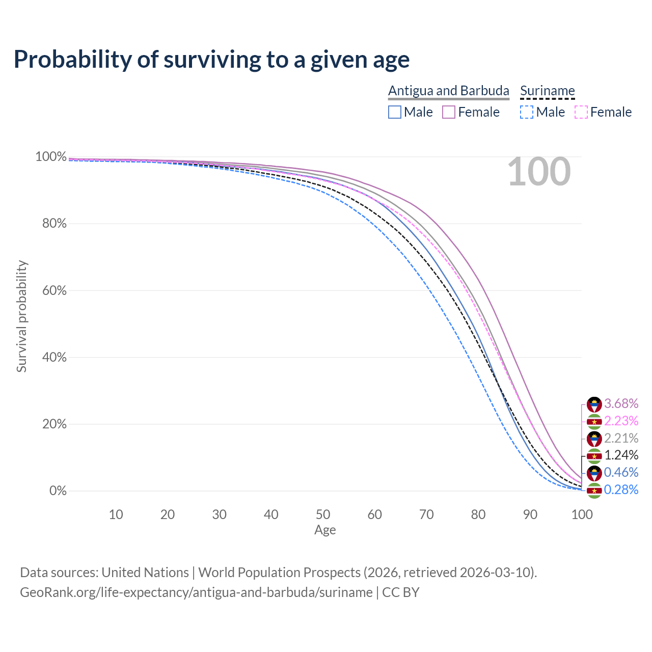 This life expectancy calculator shows the odds of living to 100, 95, 90, and below based on current age for both males and females in Antigua and Barbuda and Suriname, along with mean and median age of death. The calculations are based on the 2026 life tables (actuarial tables) from the UN World Population Prospects.