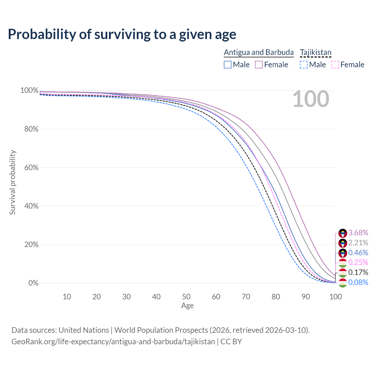 This life expectancy calculator shows the odds of living to 100, 95, 90, and below based on current age for both males and females in Antigua and Barbuda and Tajikistan, along with mean and median age of death. The calculations are based on the 2026 life tables (actuarial tables) from the UN World Population Prospects.