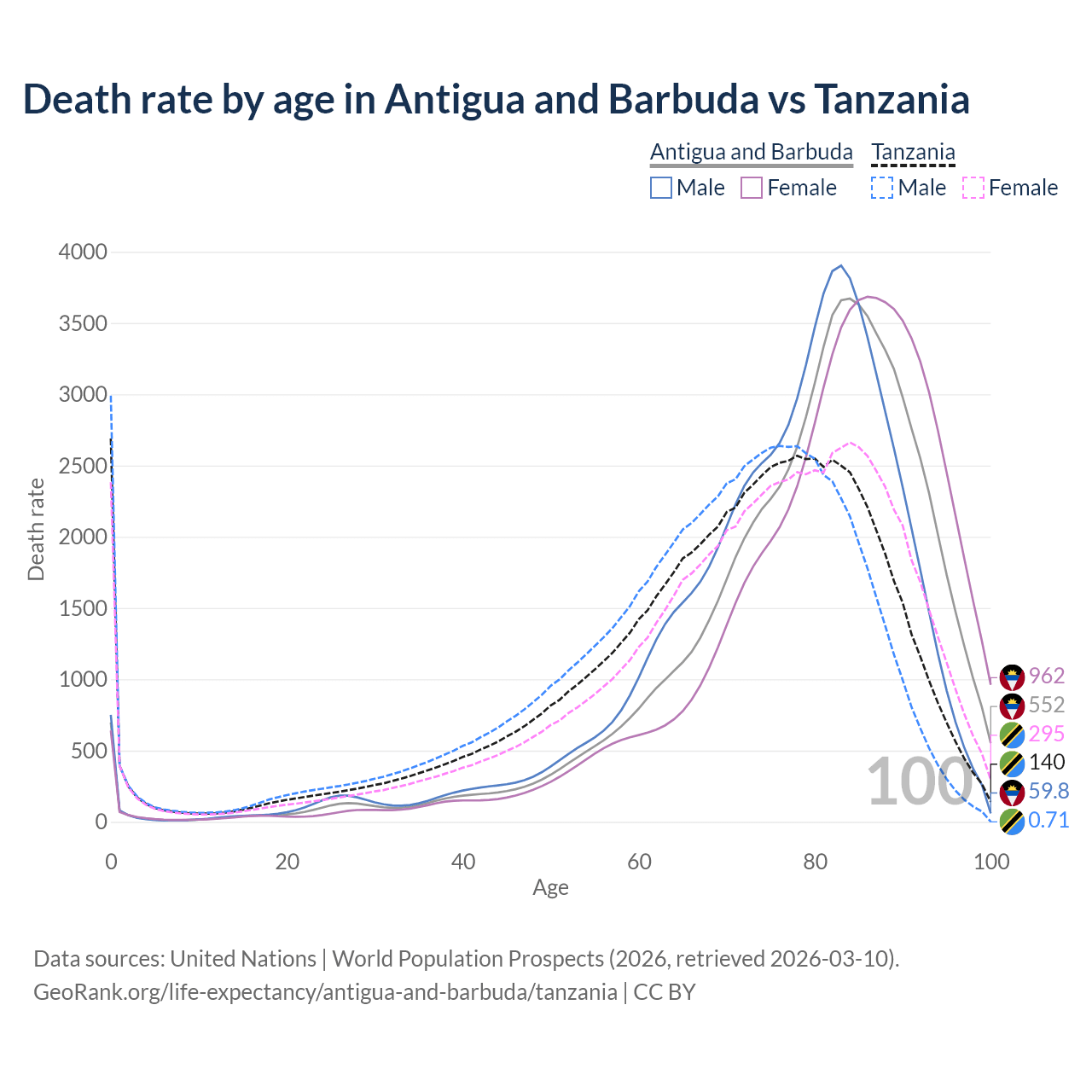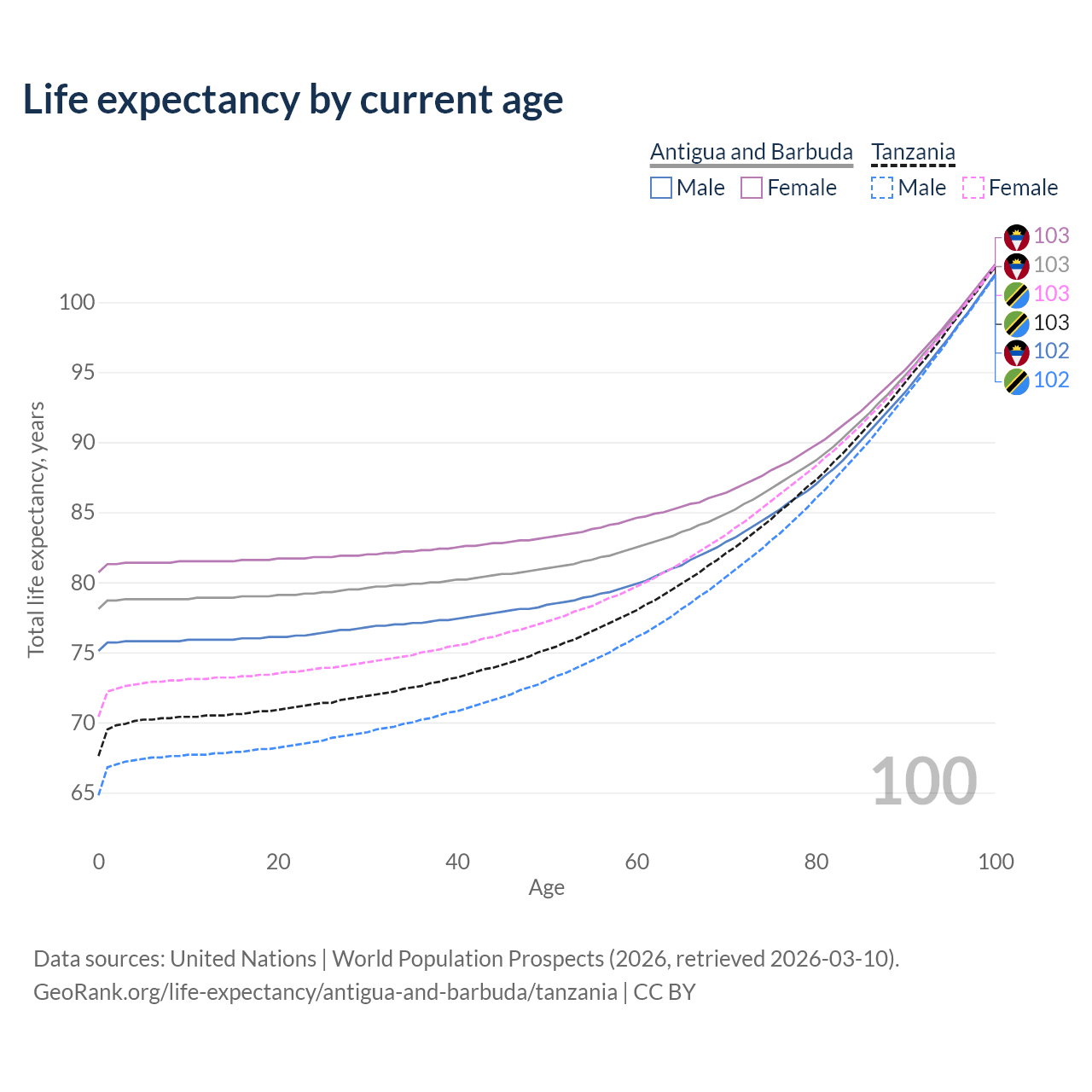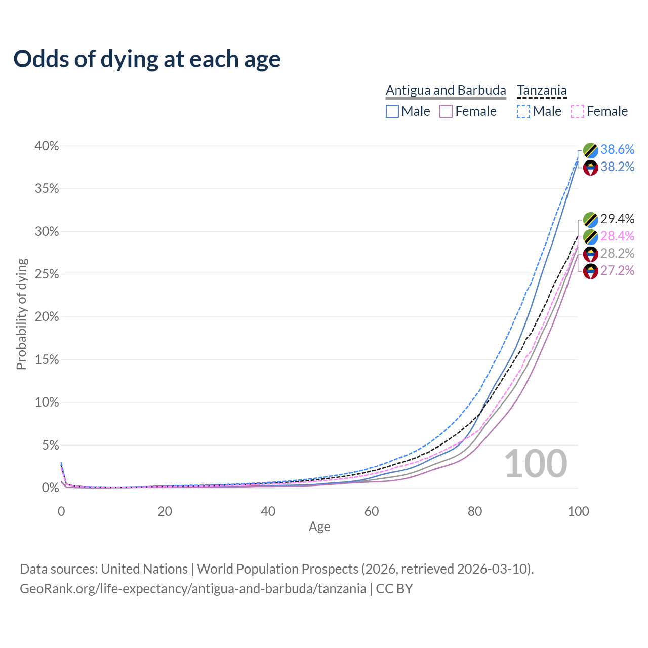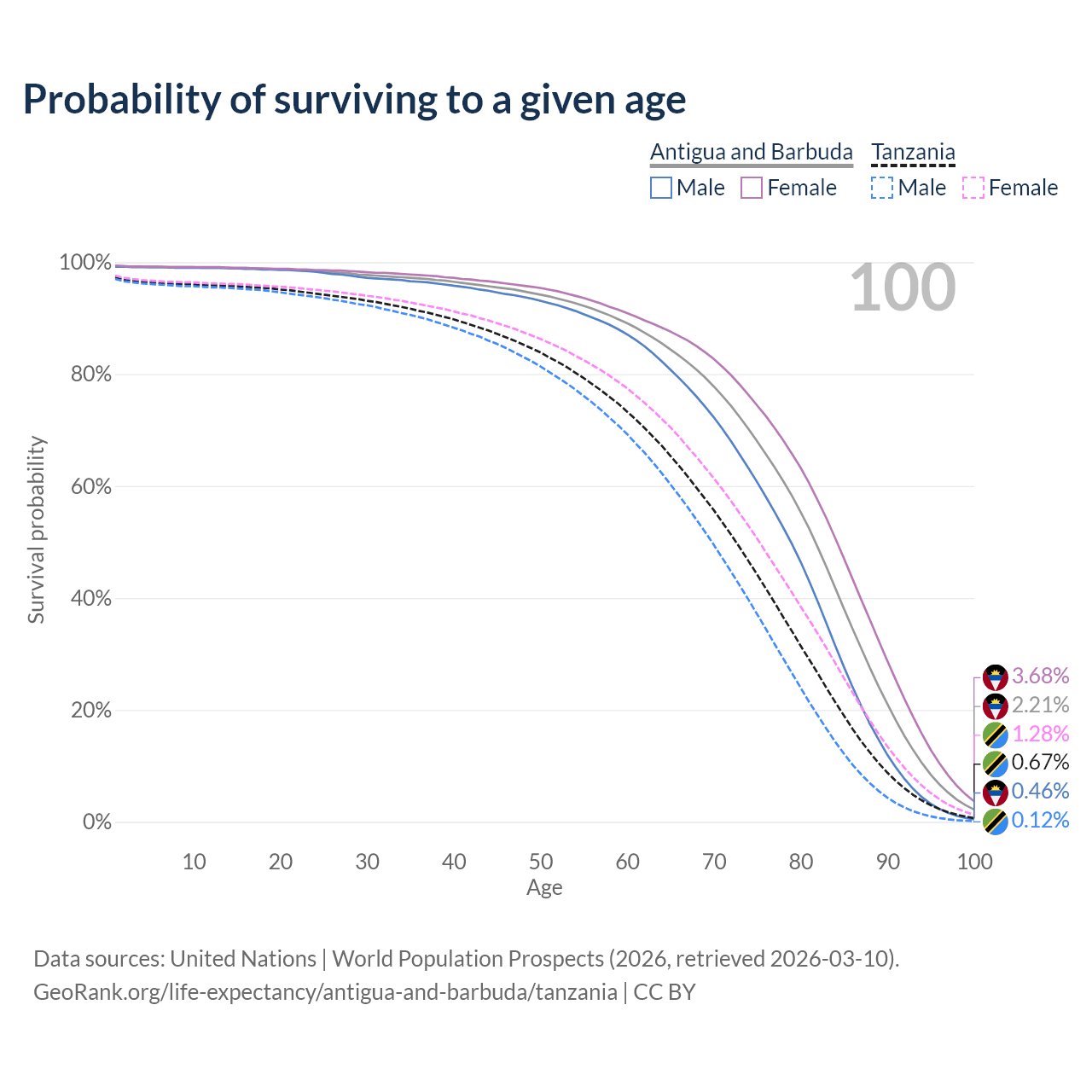This life expectancy calculator shows the odds of living to 100, 95, 90, and below based on current age for both males and females in Antigua and Barbuda and Tanzania, along with mean and median age of death. The calculations are based on the 2026 life tables (actuarial tables) from the UN World Population Prospects.