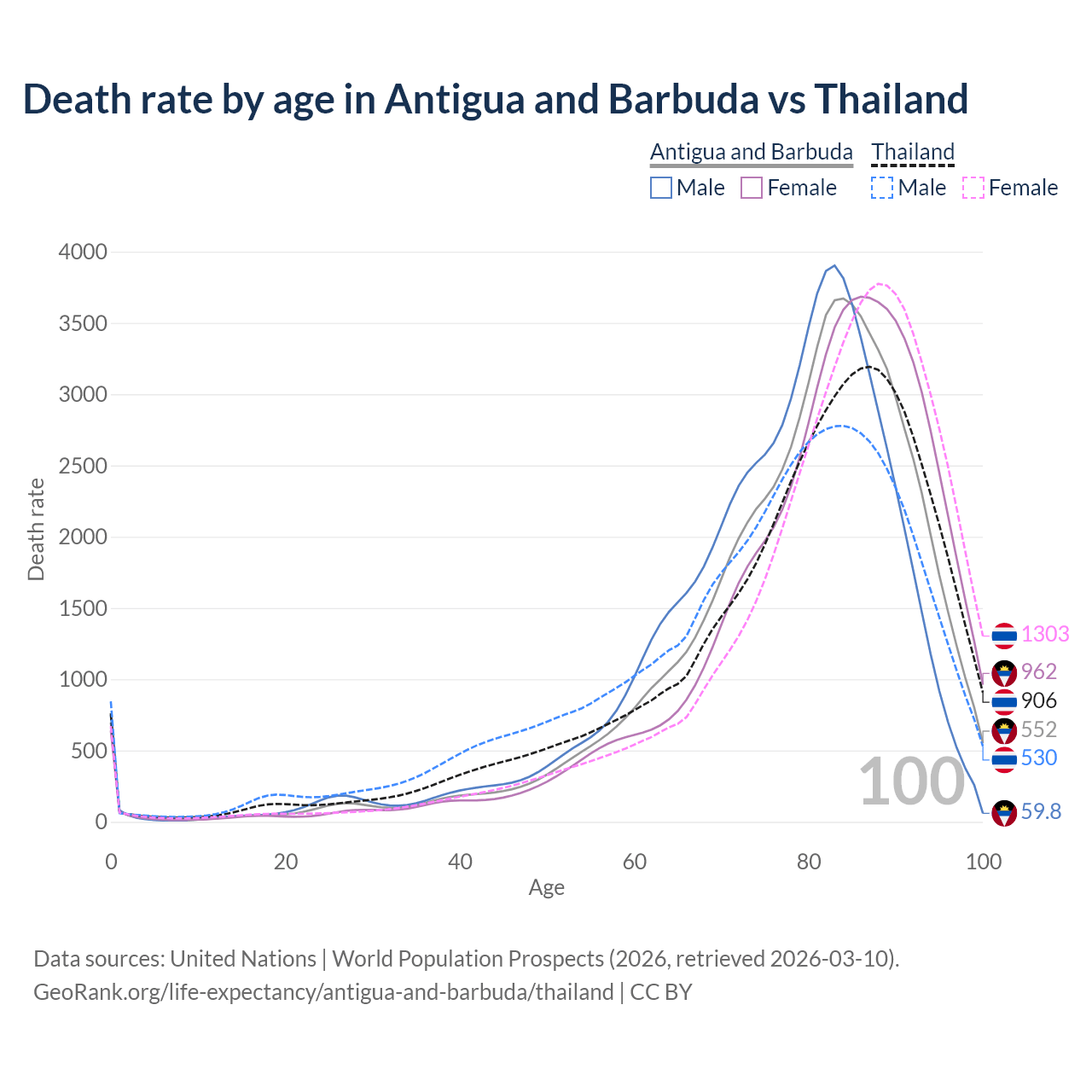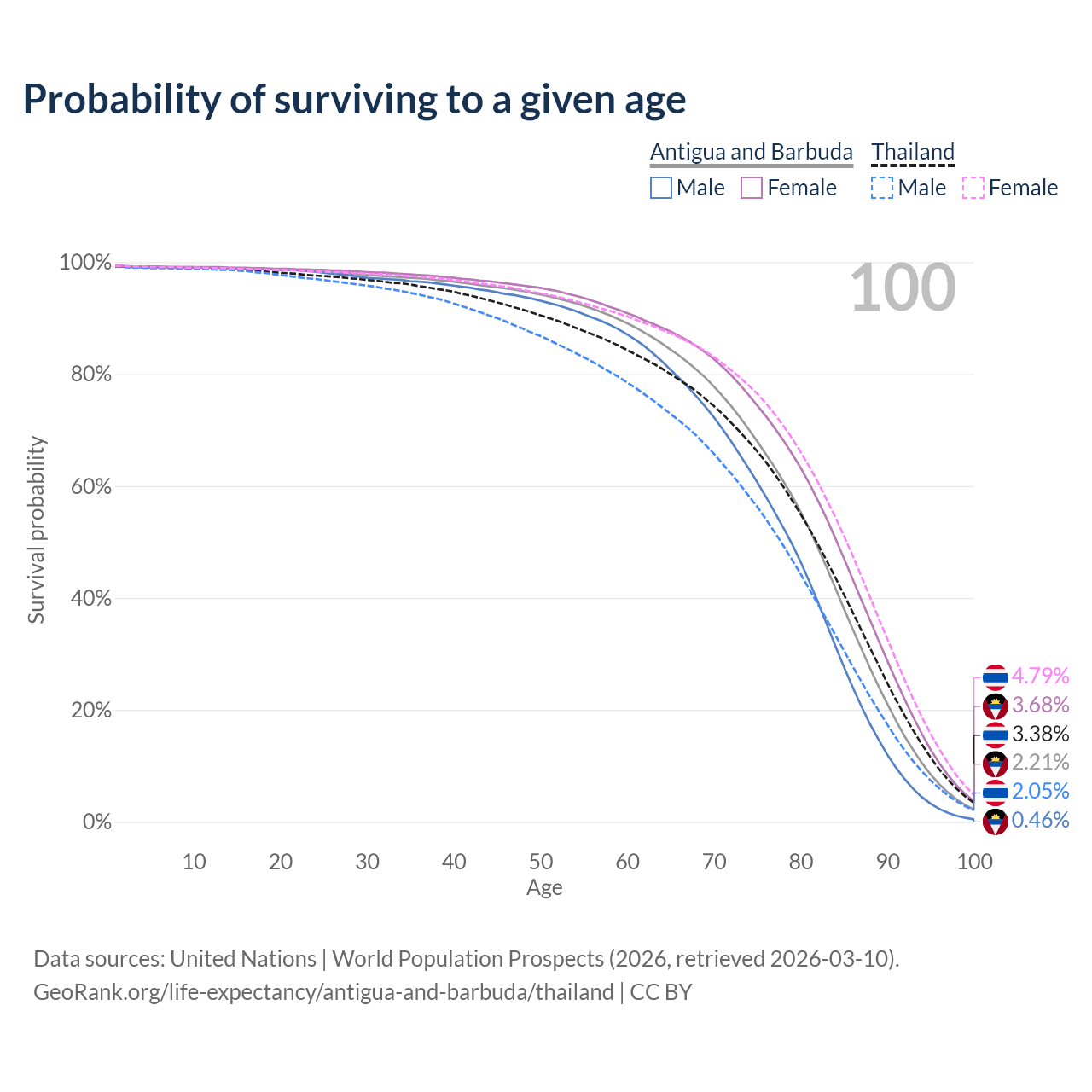 This life expectancy calculator shows the odds of living to 100, 95, 90, and below based on current age for both males and females in Antigua and Barbuda and Thailand, along with mean and median age of death. The calculations are based on the 2026 life tables (actuarial tables) from the UN World Population Prospects.